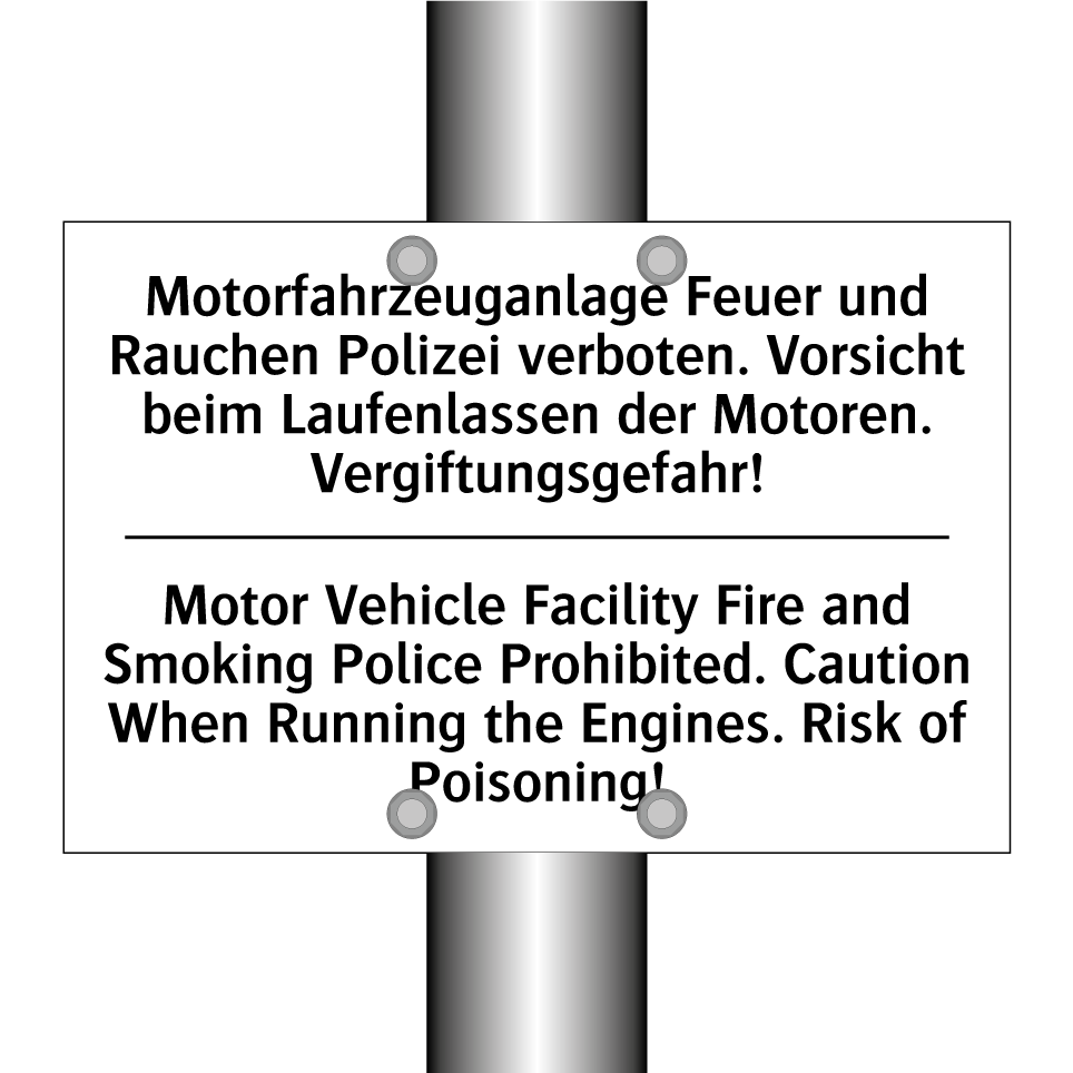 Zweisprachiges Verbotsschild mit deutschem Text Motorfahrzeuganlage Feuer und Rauchen Polizei verboten. Vorsicht beim Laufenlassen der Motoren. Vergiftungsgefahr! und englischem Text Motor Vehicle Facility Fire and Smoking Police Prohibited. Caution When Running the Engines. Risk of Poisoning!