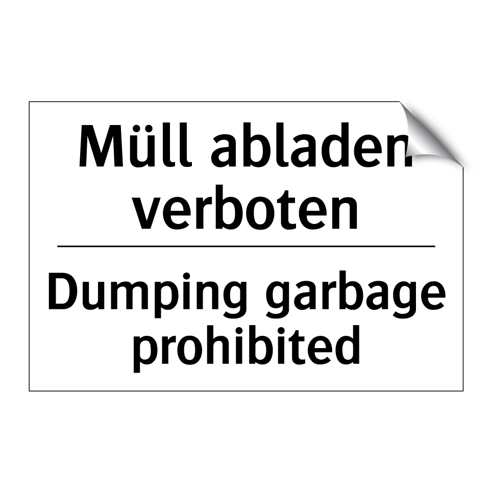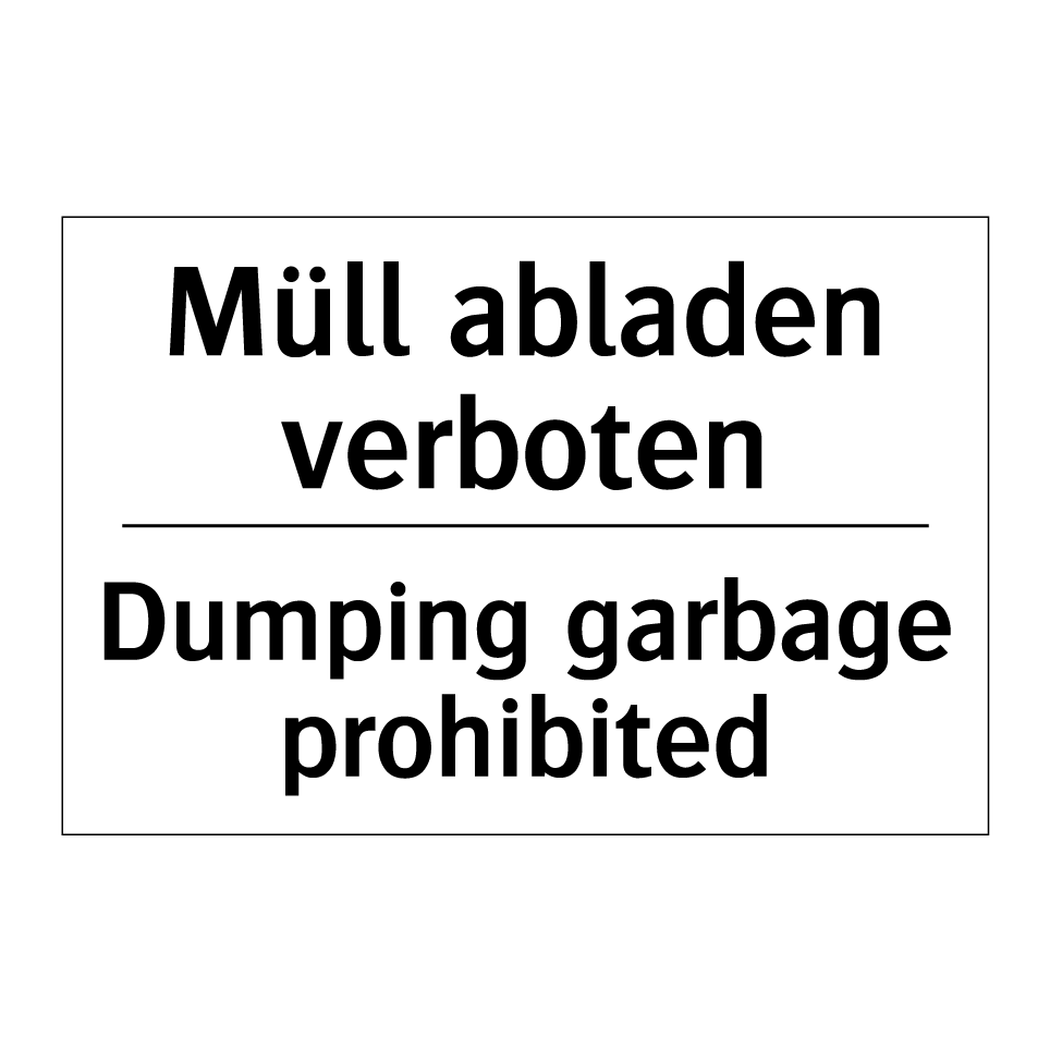 Zweisprachiges Verbotsschild mit deutschem Text Müll abladen verboten und englischem Text Dumping garbage prohibited