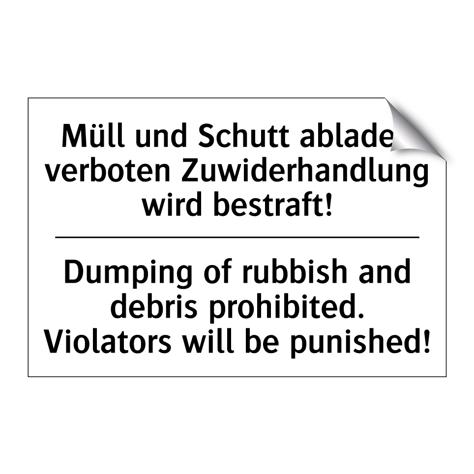 Zweisprachiges Verbotsschild mit deutschem Text Müll und Schutt abladen verboten Zuwiderhandlung wird bestraft! und englischem Text Dumping of rubbish and debris prohibited. Violators will be punished!