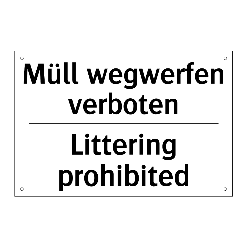 Zweisprachiges Verbotsschild mit deutschem Text Müll wegwerfen verboten und englischem Text Littering prohibited