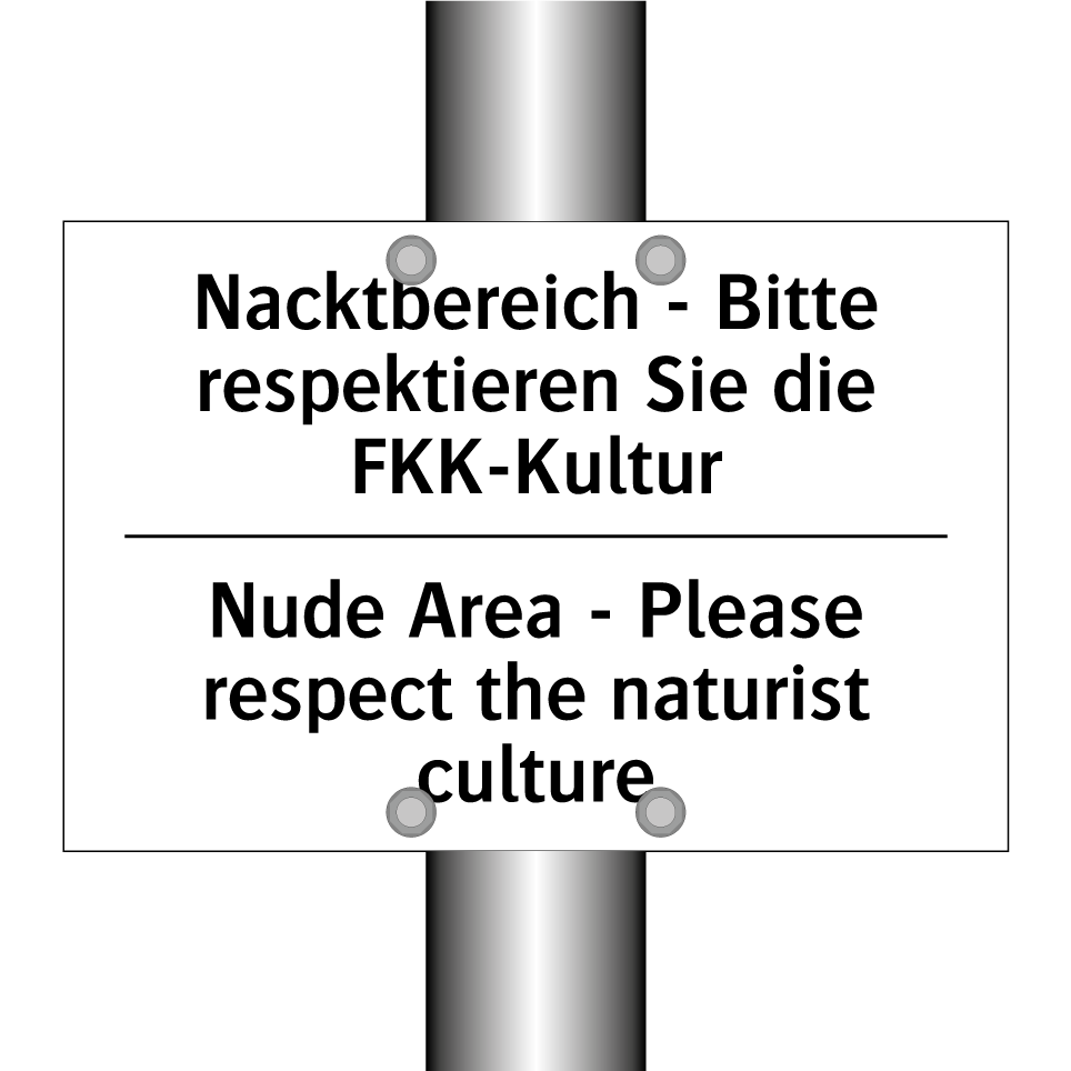Zweisprachiges Verbotsschild mit deutschem Text Nacktbereich - Bitte respektieren Sie die FKK-Kultur und englischem Text Nude Area - Please respect the naturist culture