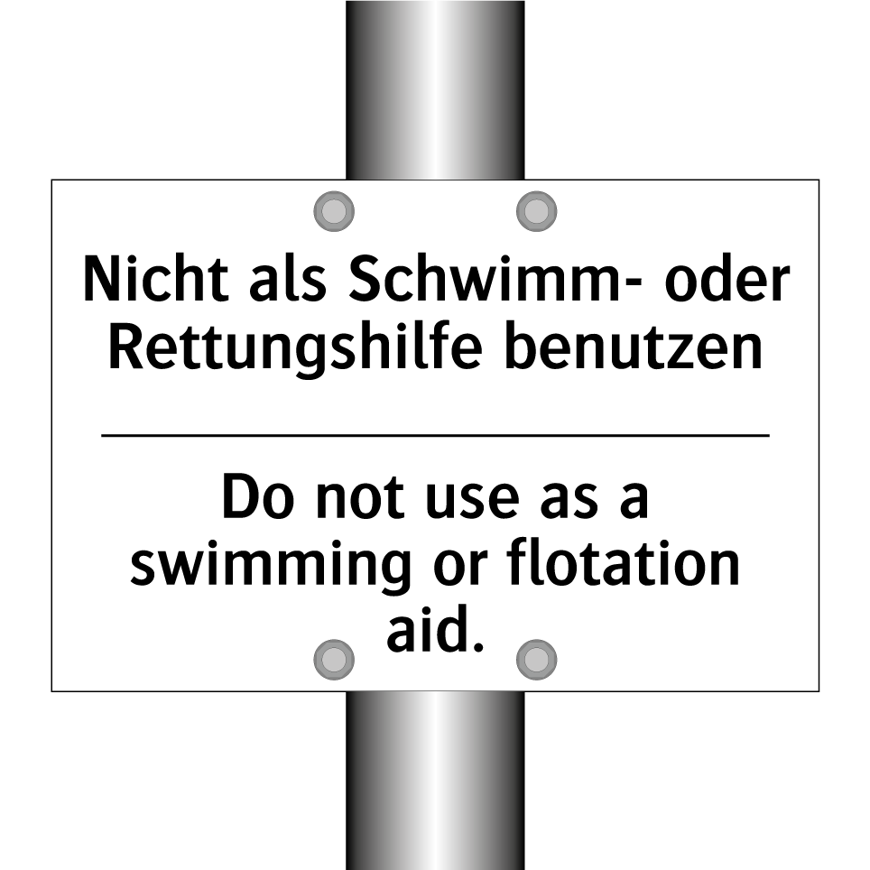 Zweisprachiges Verbotsschild mit deutschem Text Nicht als Schwimm- oder Rettungshilfe benutzen und englischem Text Do not use as a swimming or flotation aid.