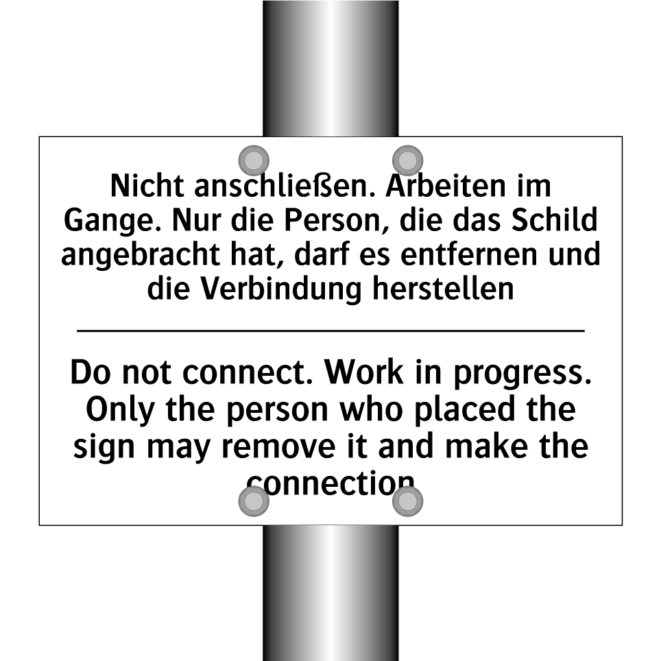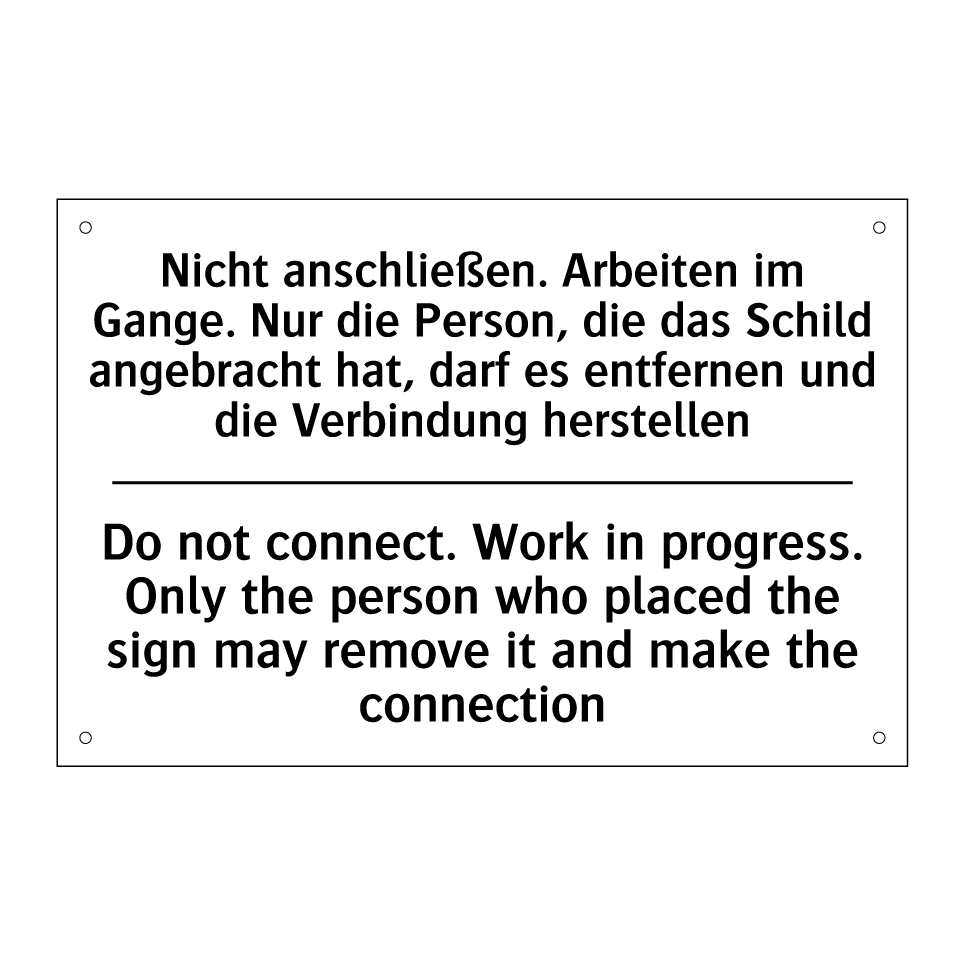 Zweisprachiges Verbotsschild mit deutschem Text Nicht anschließen. Arbeiten im Gange. Nur die Person, die das Schild angebracht hat, darf es entfernen und die Verbindung herstellen und englischem Text Do not connect. Work in progress. Only the person who placed the sign may remove it and make the connection