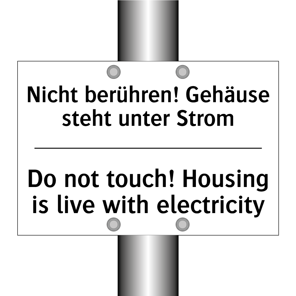 Zweisprachiges Verbotsschild mit deutschem Text Nicht berühren! Gehäuse steht unter Strom und englischem Text Do not touch! Housing is live with electricity