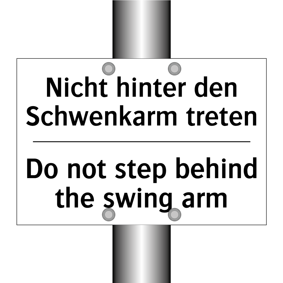 Zweisprachiges Verbotsschild mit deutschem Text Nicht hinter den Schwenkarm treten und englischem Text Do not step behind the swing arm