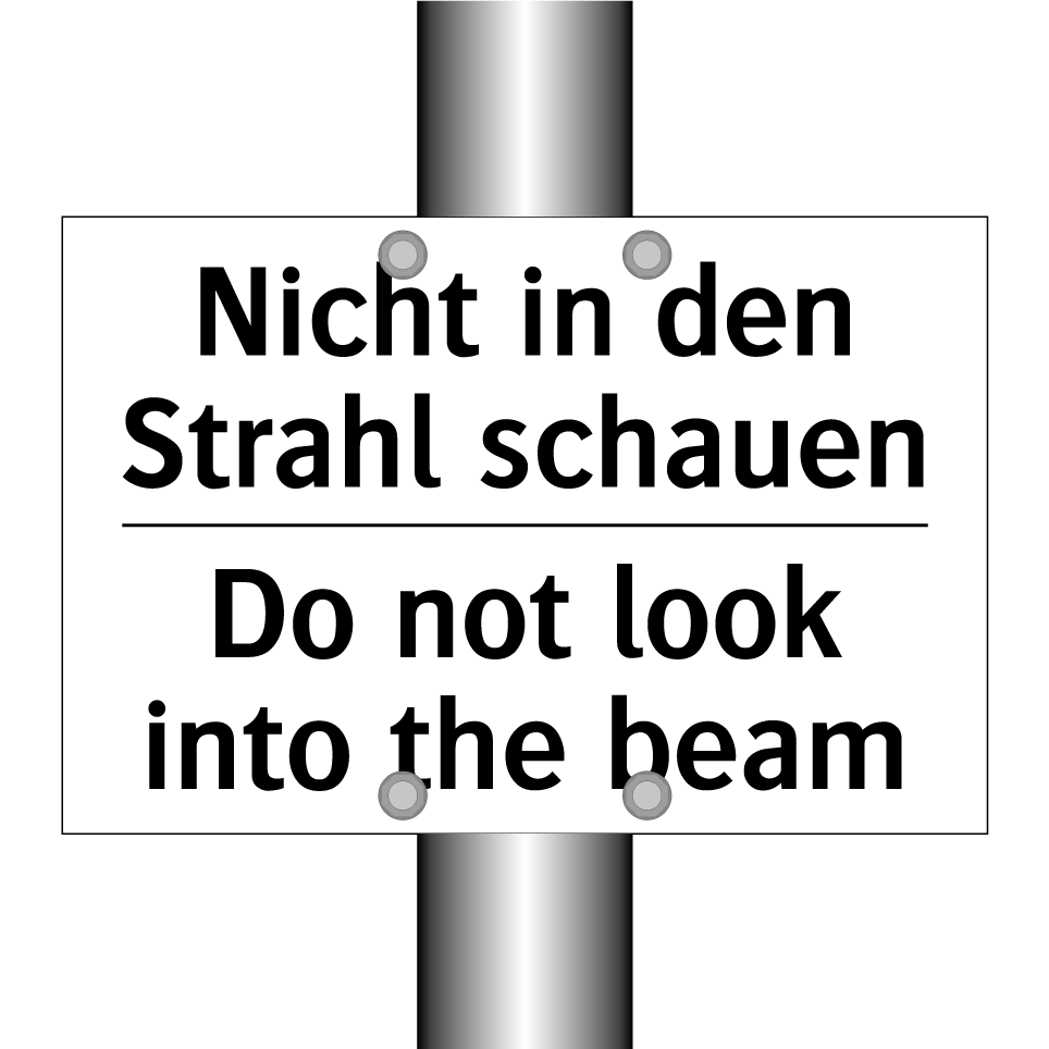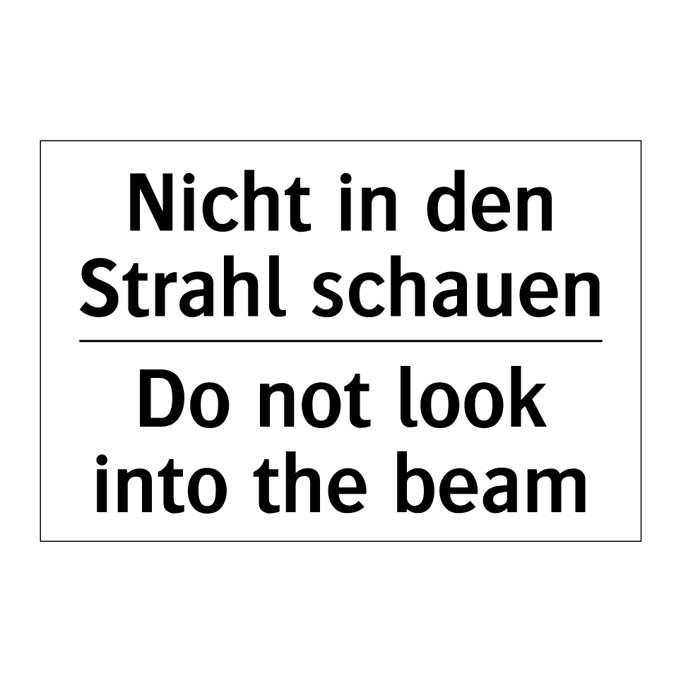 Zweisprachiges Verbotsschild mit deutschem Text Nicht in den Strahl schauen und englischem Text Do not look into the beam