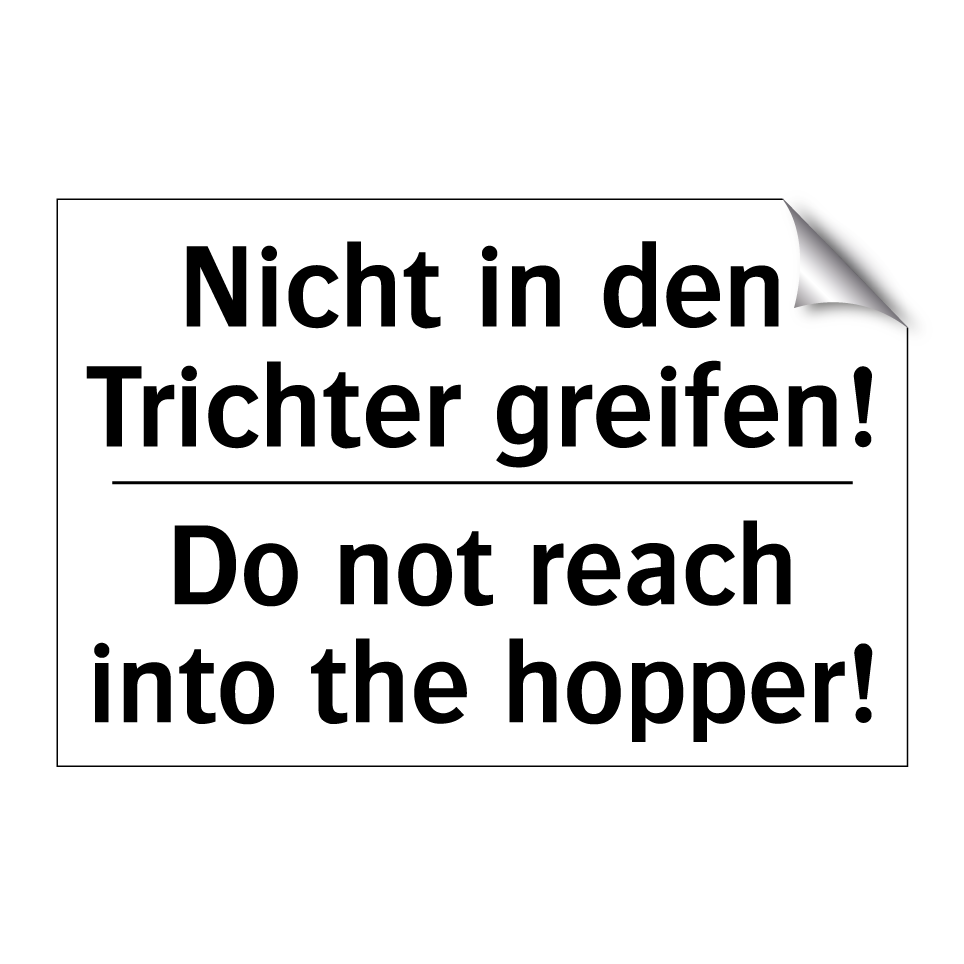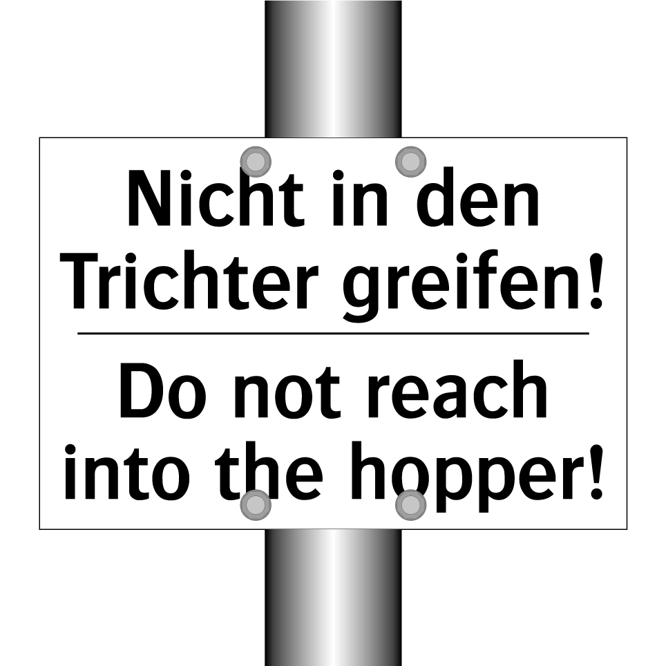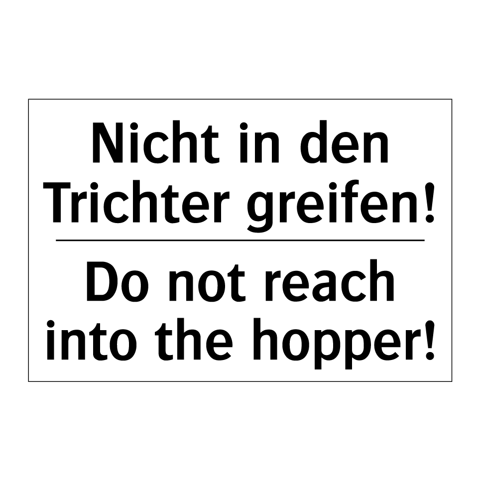 Zweisprachiges Verbotsschild mit deutschem Text Nicht in den Trichter greifen! und englischem Text Do not reach into the hopper!