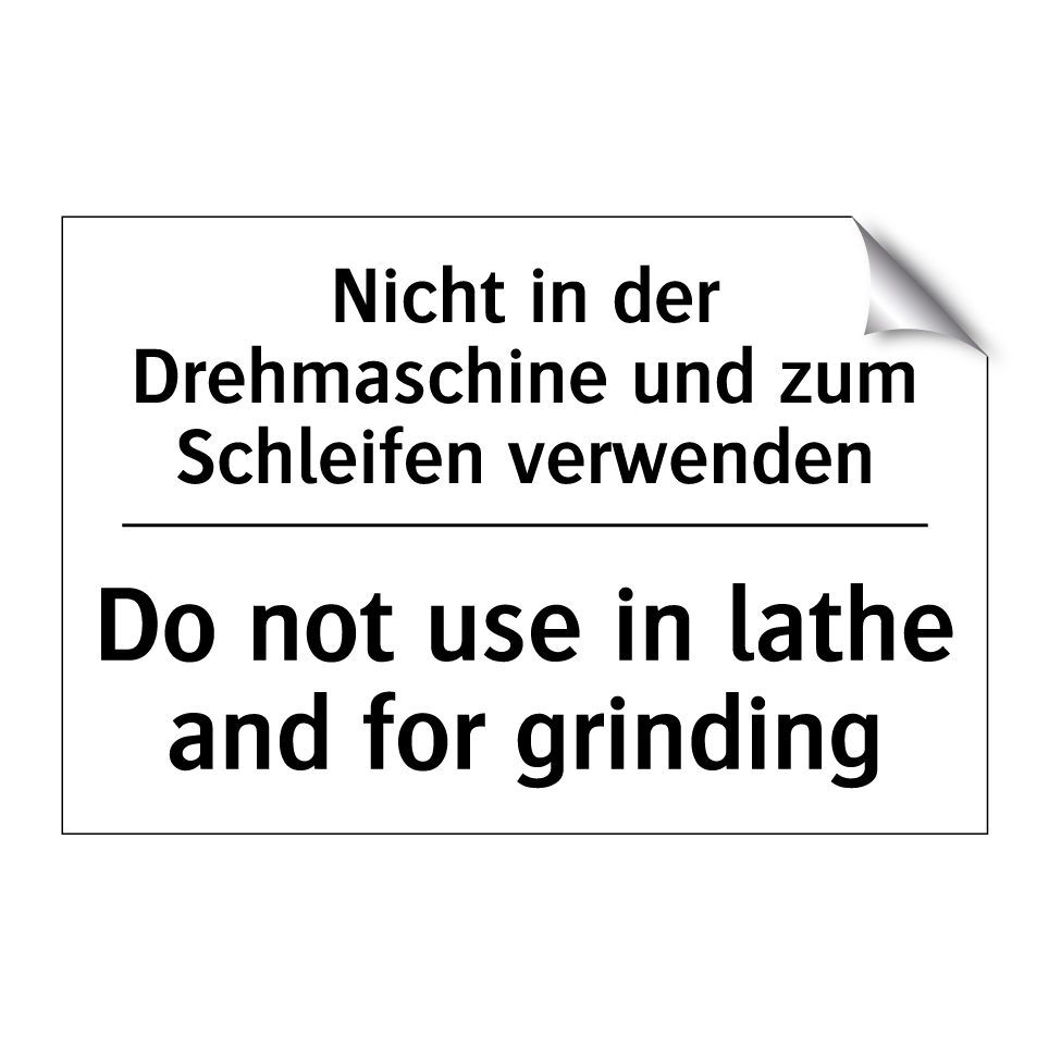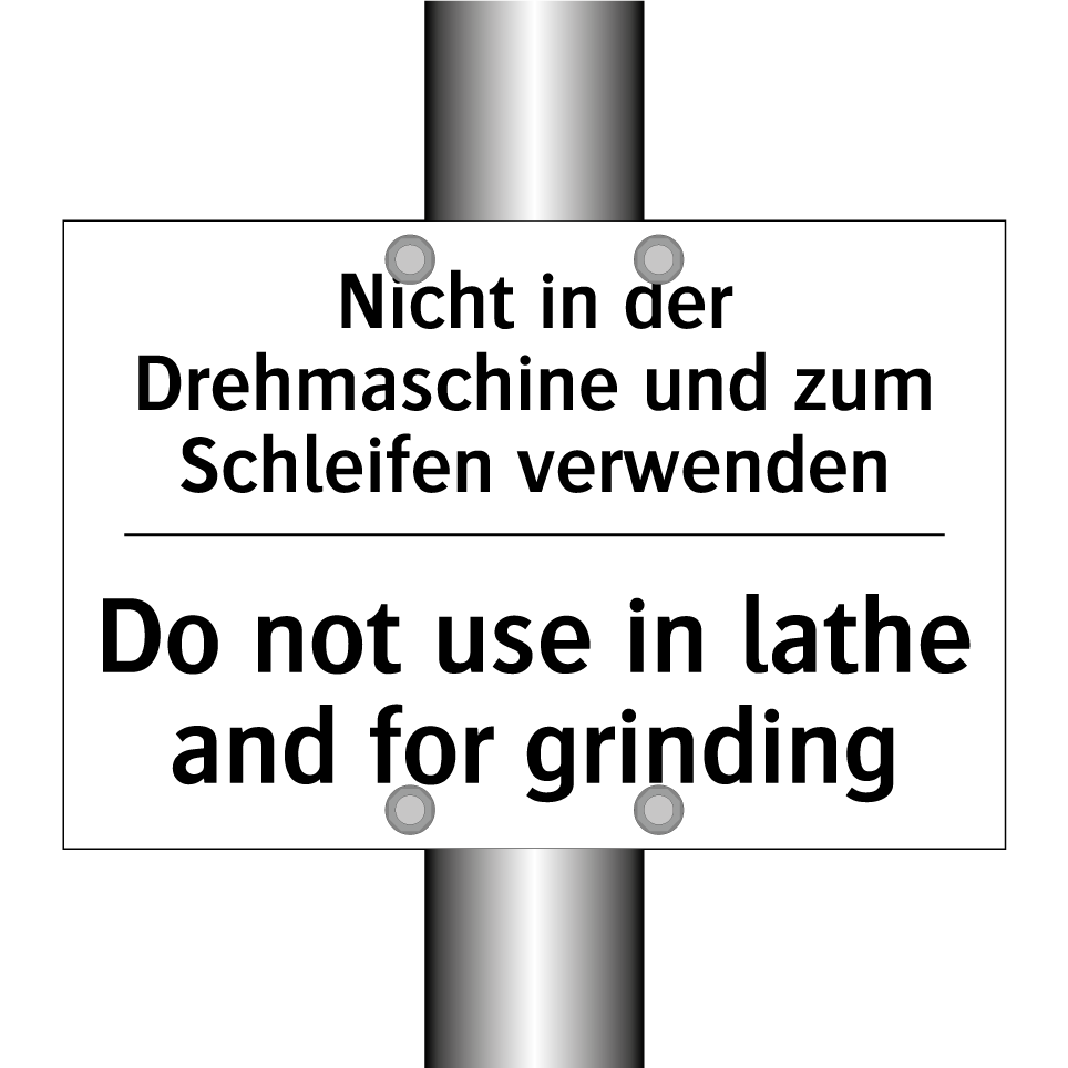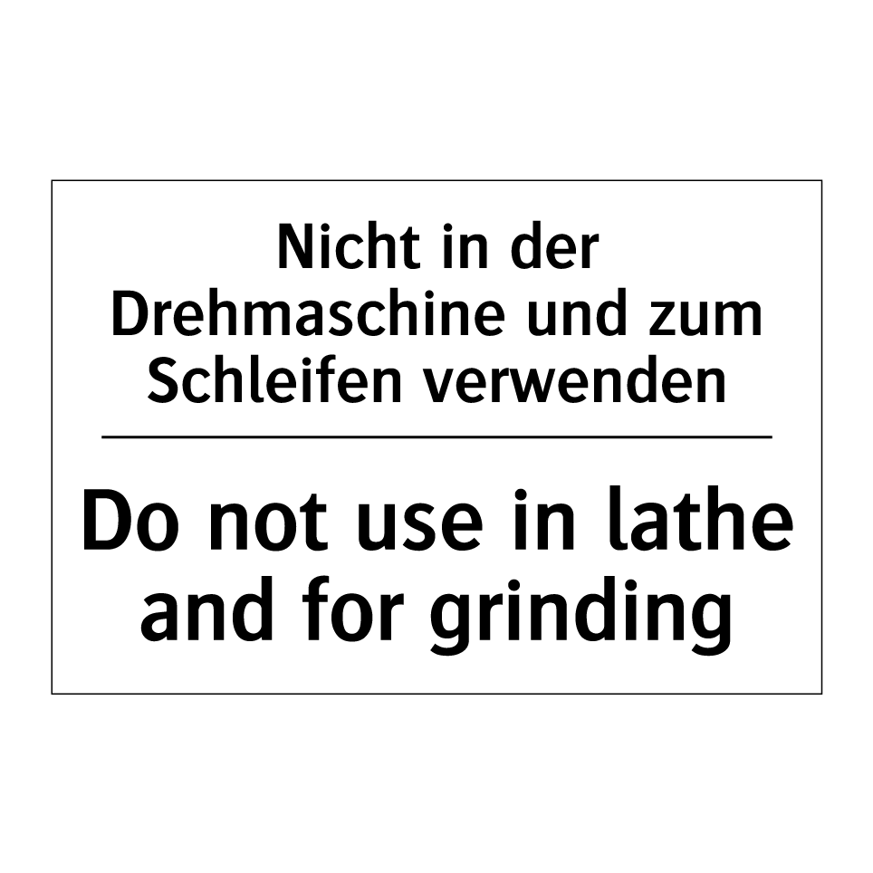 Zweisprachiges Verbotsschild mit deutschem Text Nicht in der Drehmaschine und zum Schleifen verwenden und englischem Text Do not use in lathe and for grinding