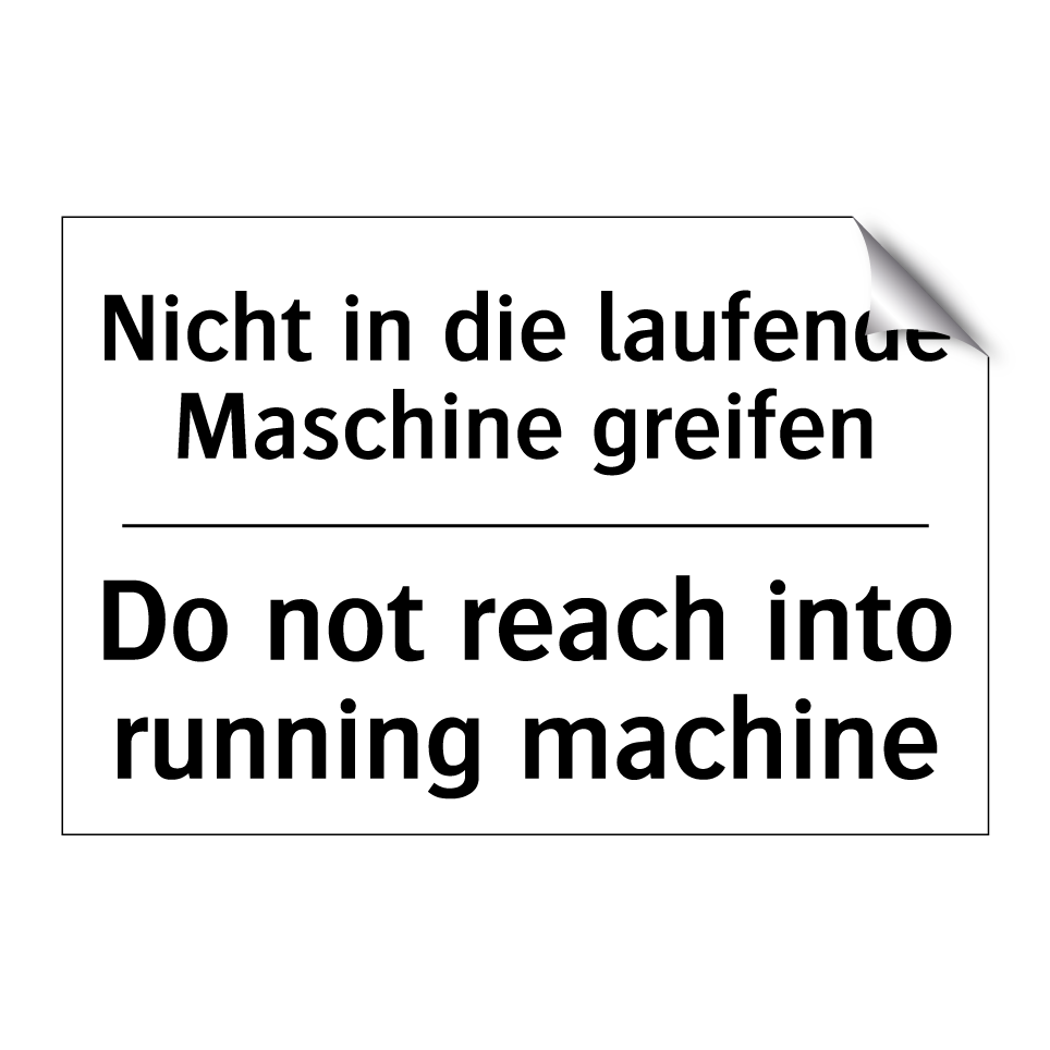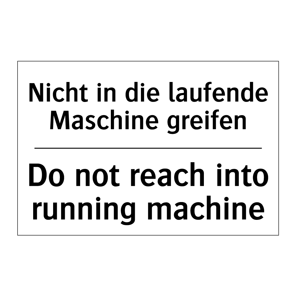 Zweisprachiges Verbotsschild mit deutschem Text Nicht in die laufende Maschine greifen und englischem Text Do not reach into running machine