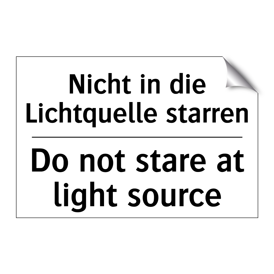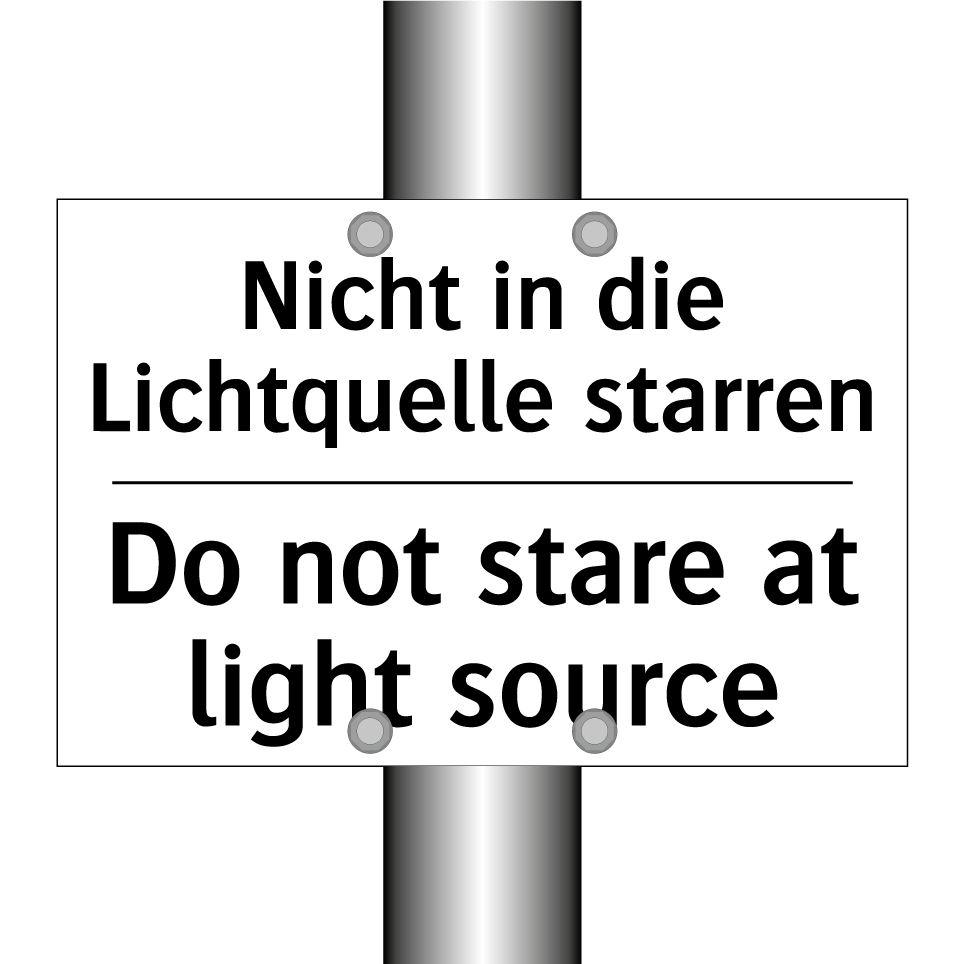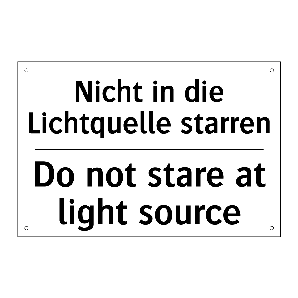 Zweisprachiges Verbotsschild mit deutschem Text Nicht in die Lichtquelle starren und englischem Text Do not stare at light source