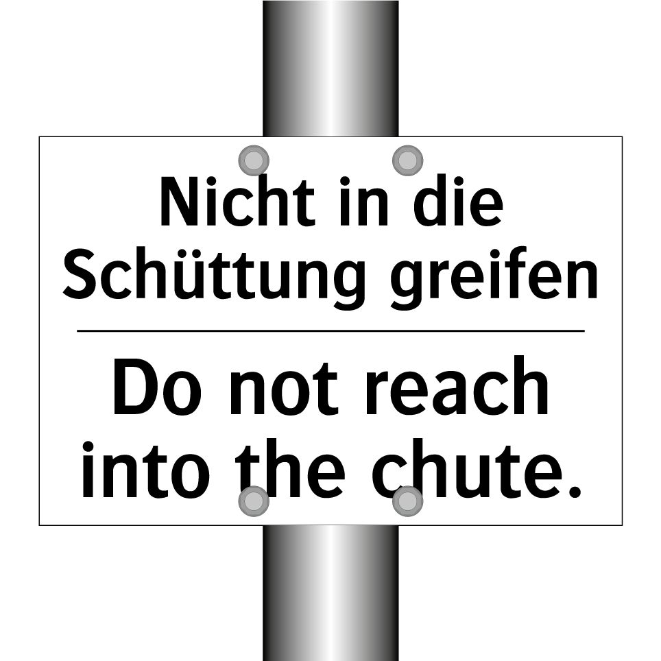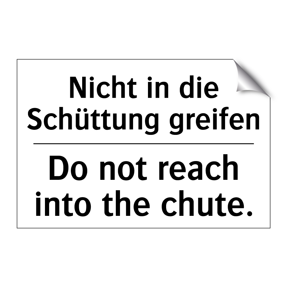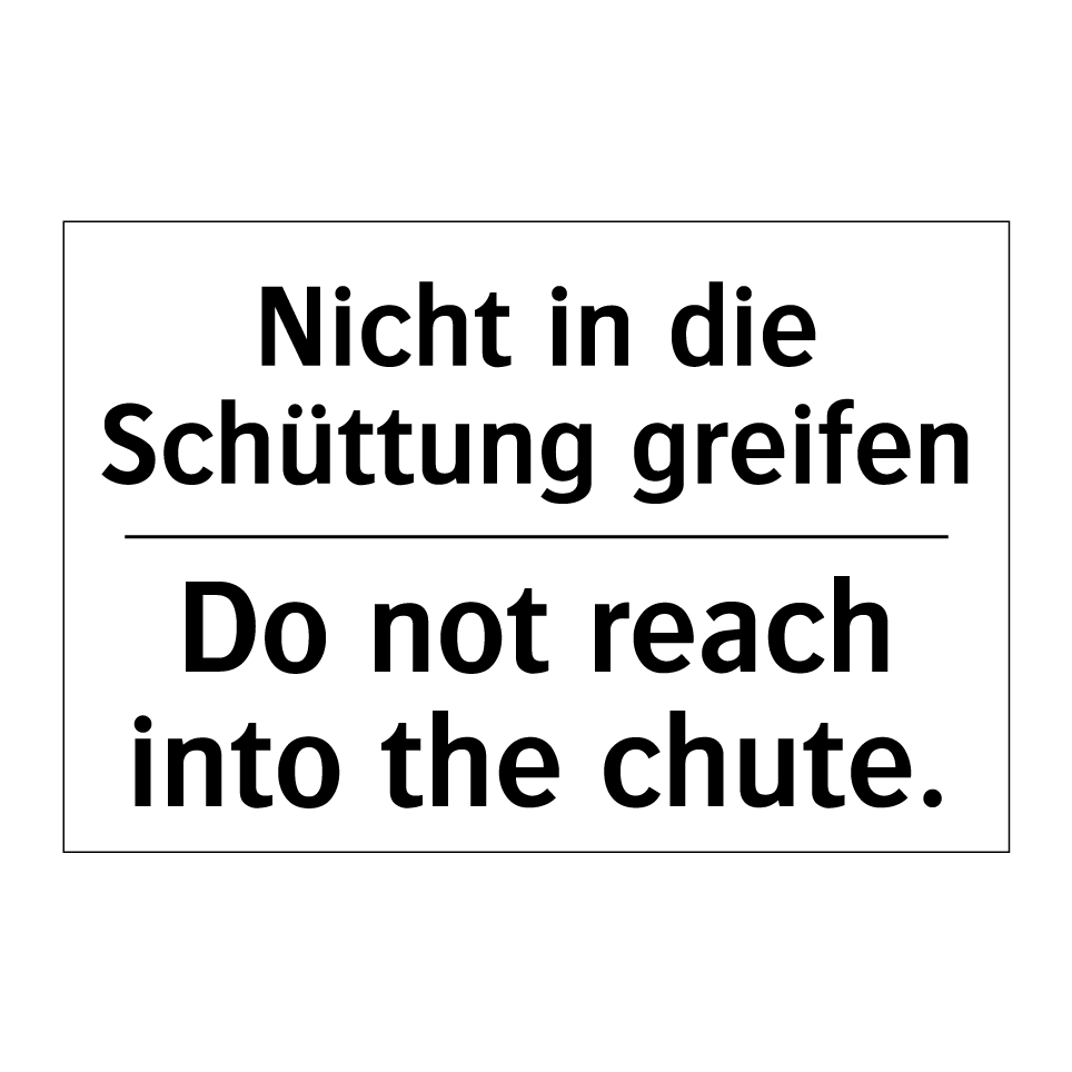Zweisprachiges Verbotsschild mit deutschem Text Nicht in die Schüttung greifen und englischem Text Do not reach into the chute.