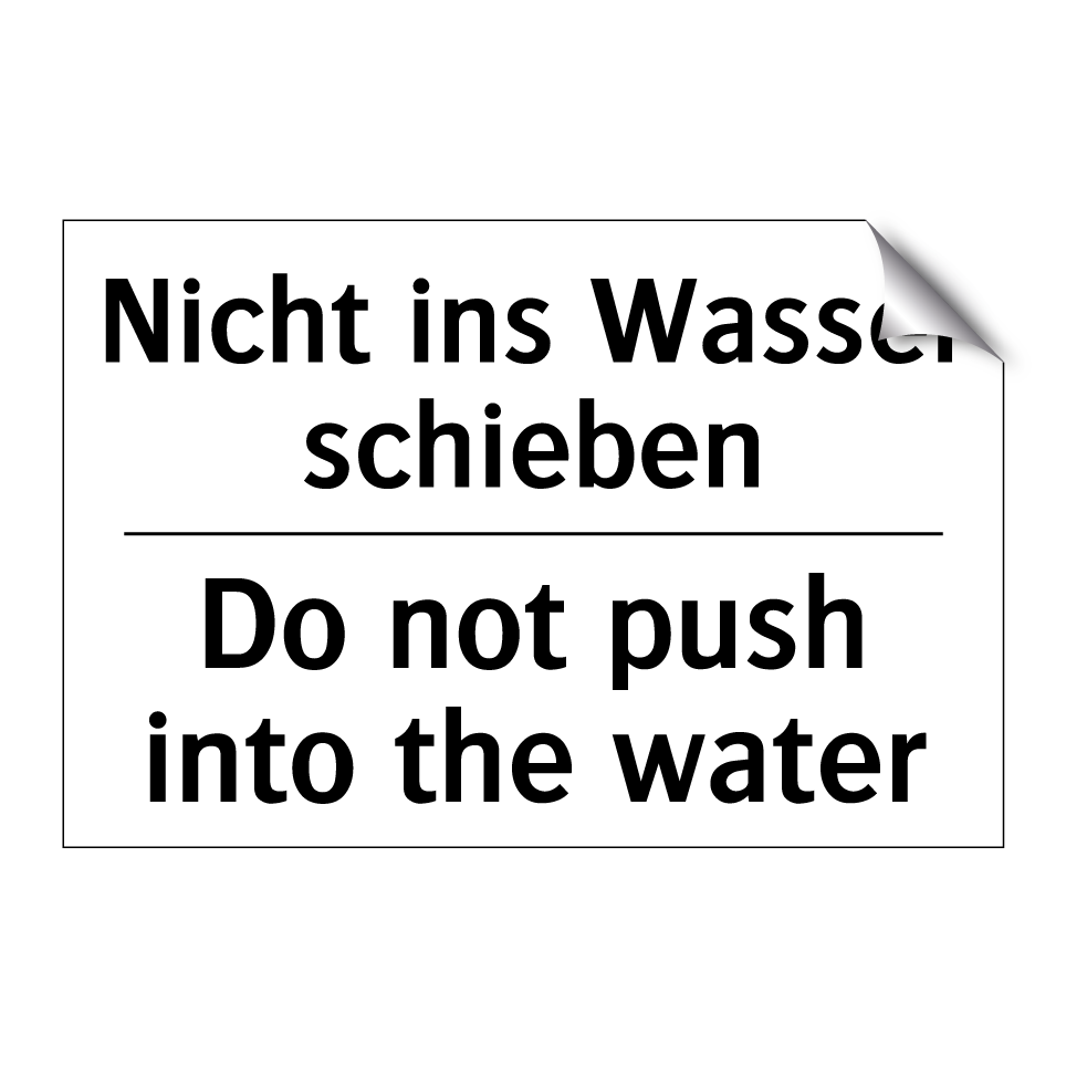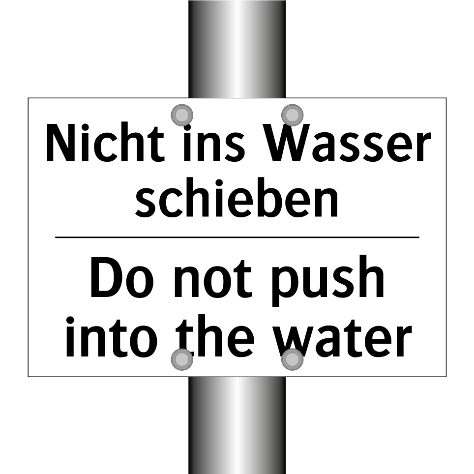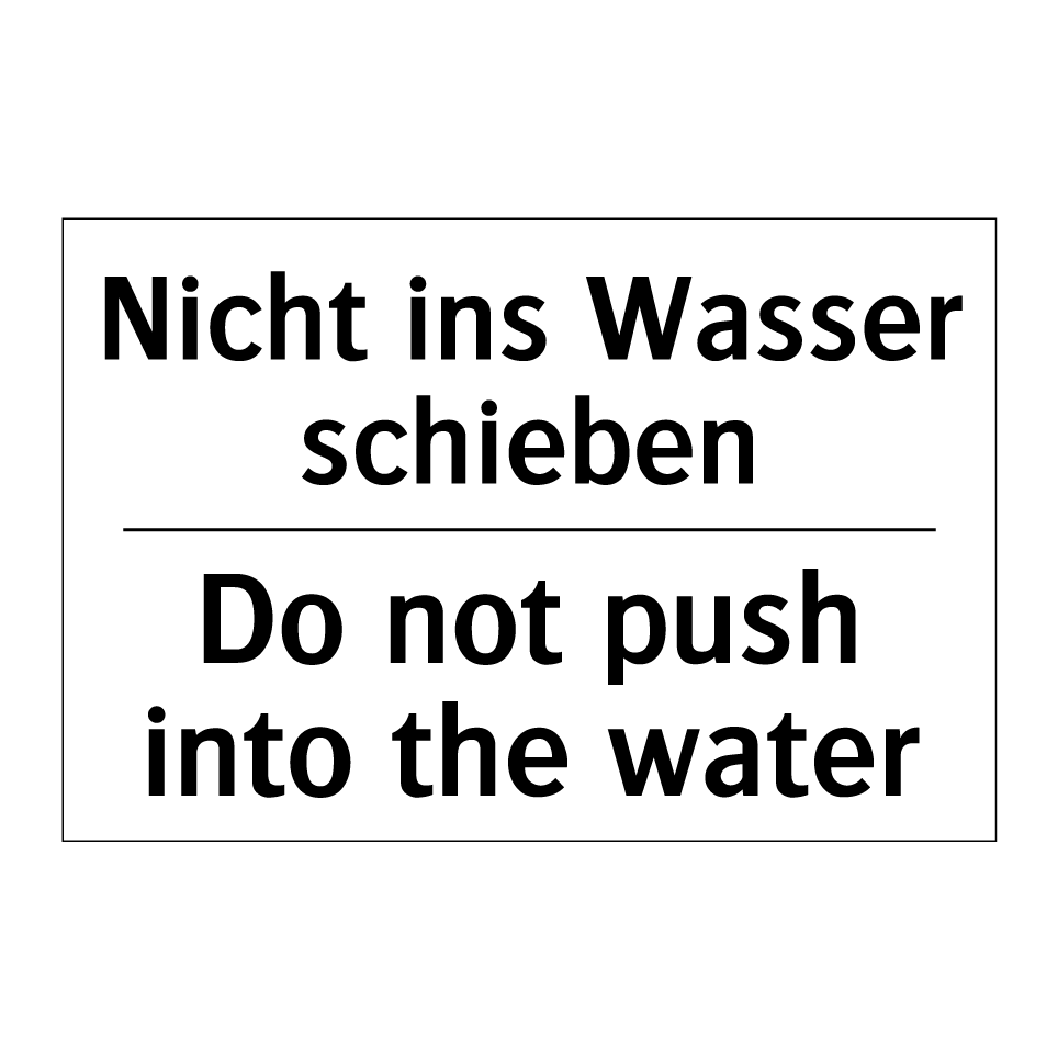 Zweisprachiges Verbotsschild mit deutschem Text Nicht ins Wasser schieben und englischem Text Do not push into the water