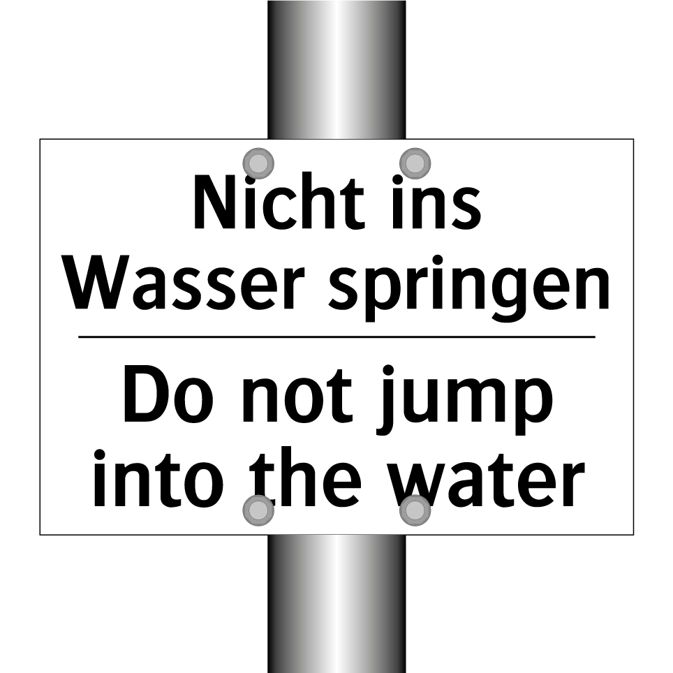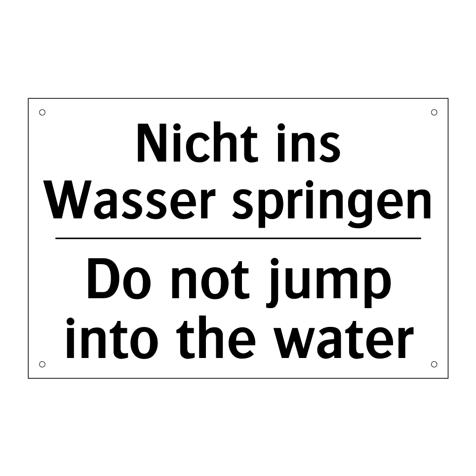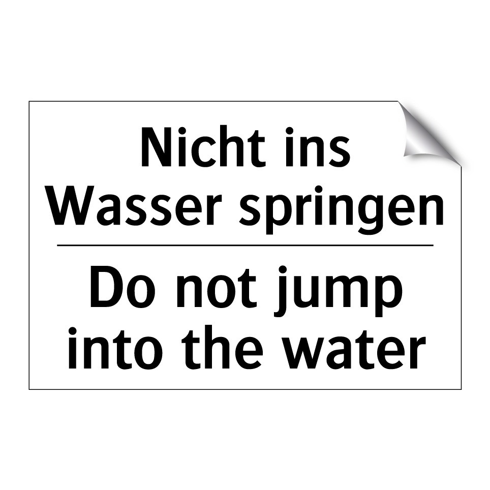 Zweisprachiges Verbotsschild mit deutschem Text Nicht ins Wasser springen und englischem Text Do not jump into the water