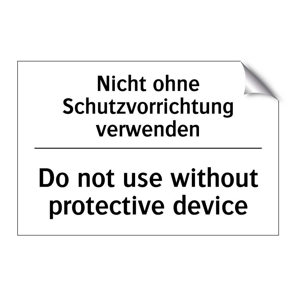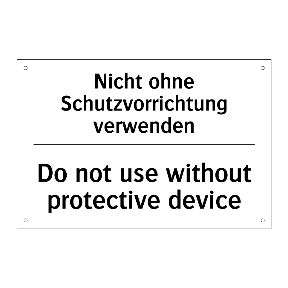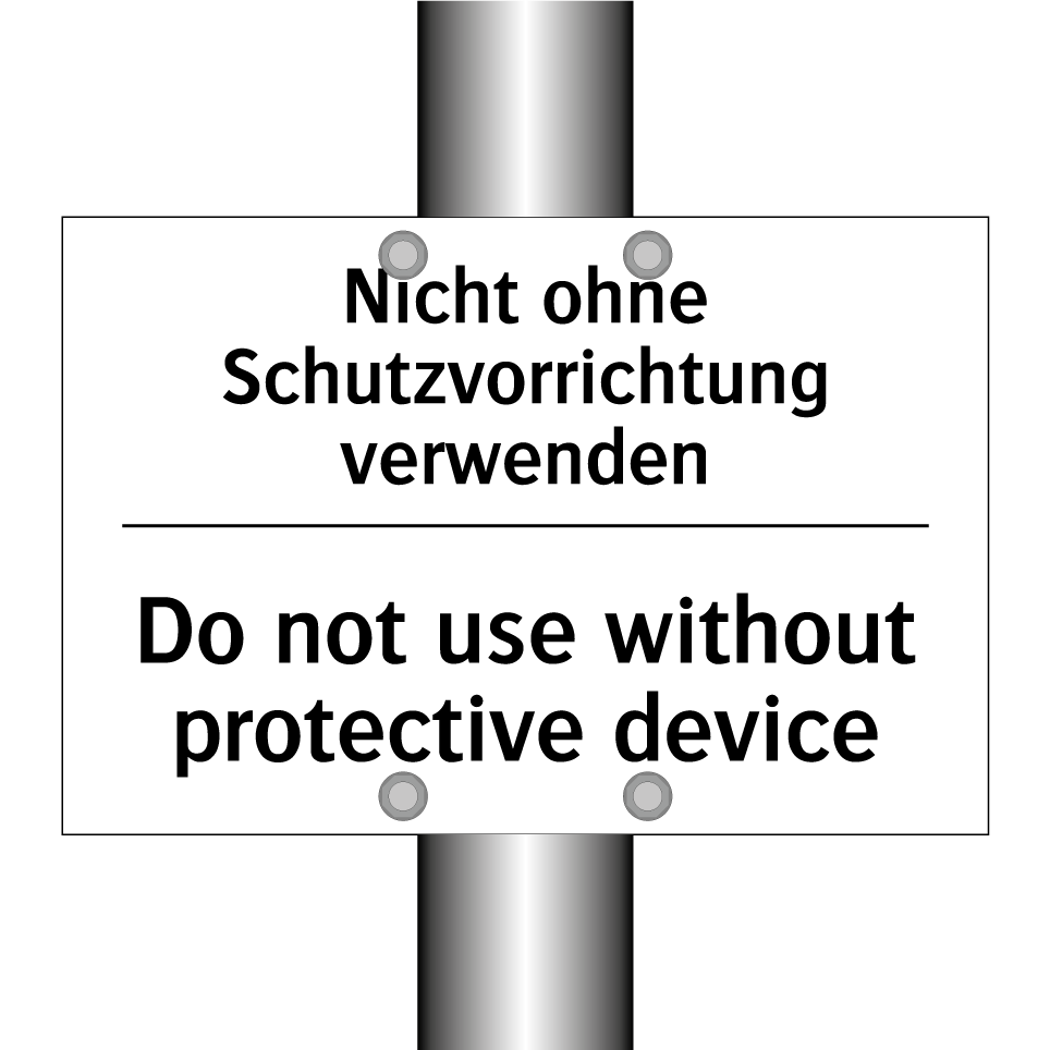 Zweisprachiges Verbotsschild mit deutschem Text Nicht ohne Schutzvorrichtung verwenden und englischem Text Do not use without protective device