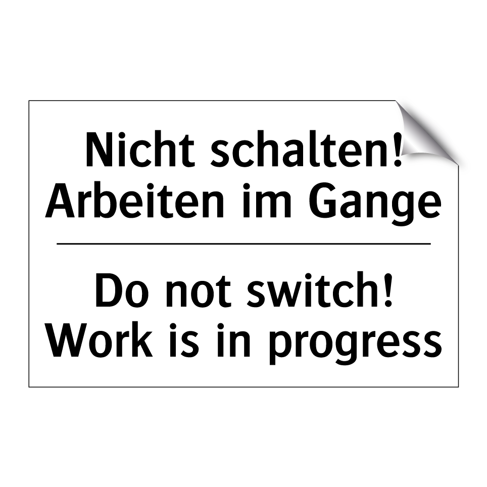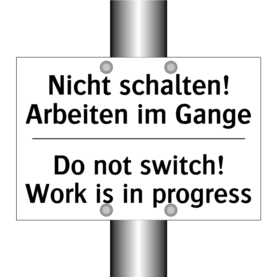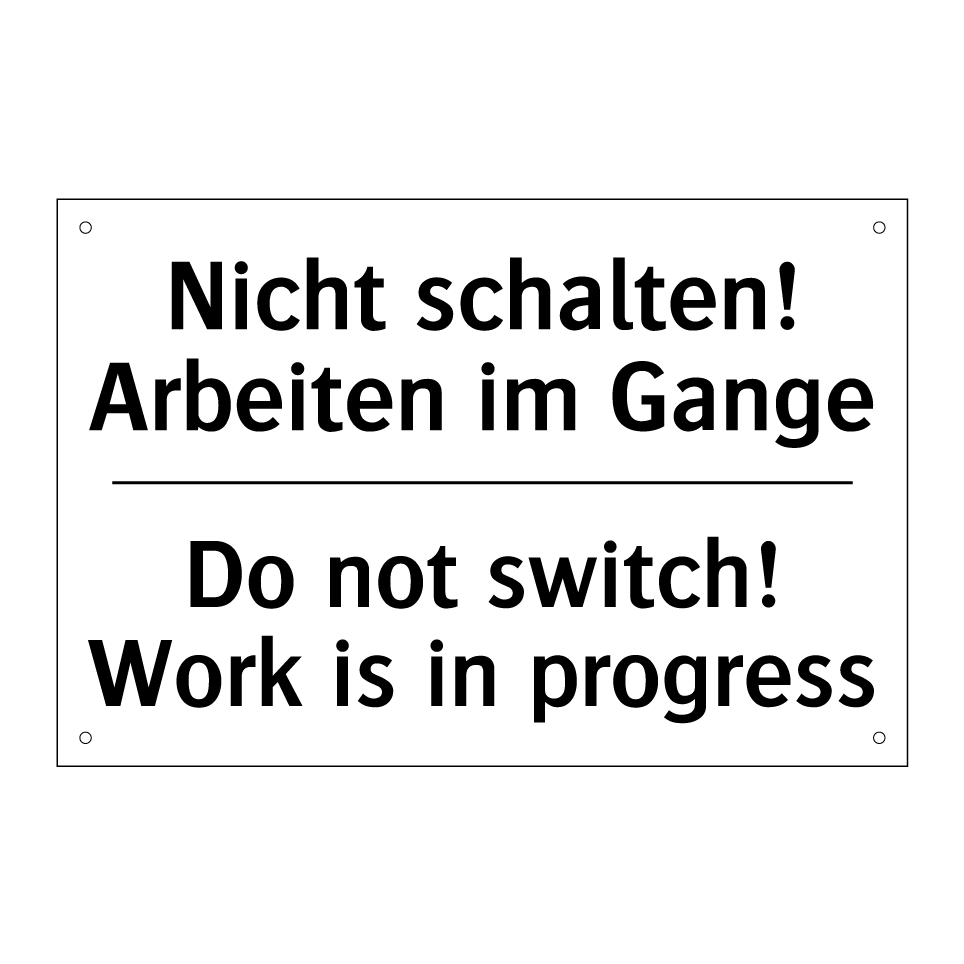 Zweisprachiges Verbotsschild mit deutschem Text Nicht schalten! Arbeiten im Gange und englischem Text Do not switch! Work is in progress