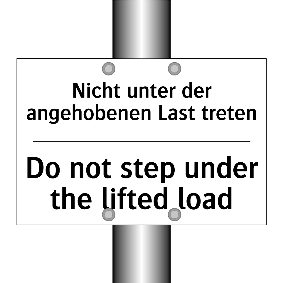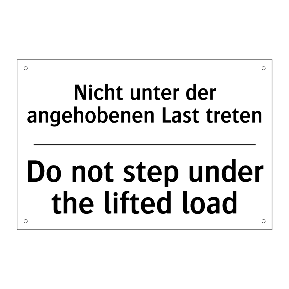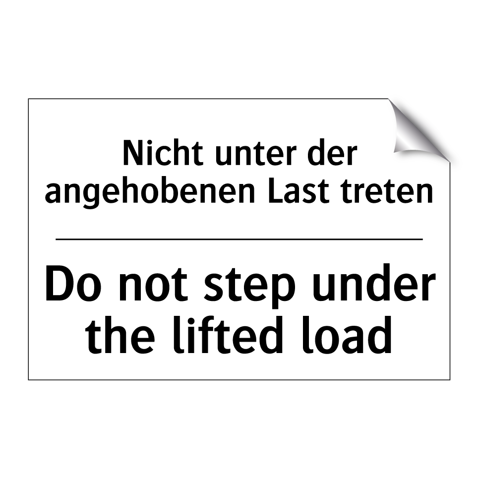 Zweisprachiges Verbotsschild mit deutschem Text Nicht unter der angehobenen Last treten und englischem Text Do not step under the lifted load