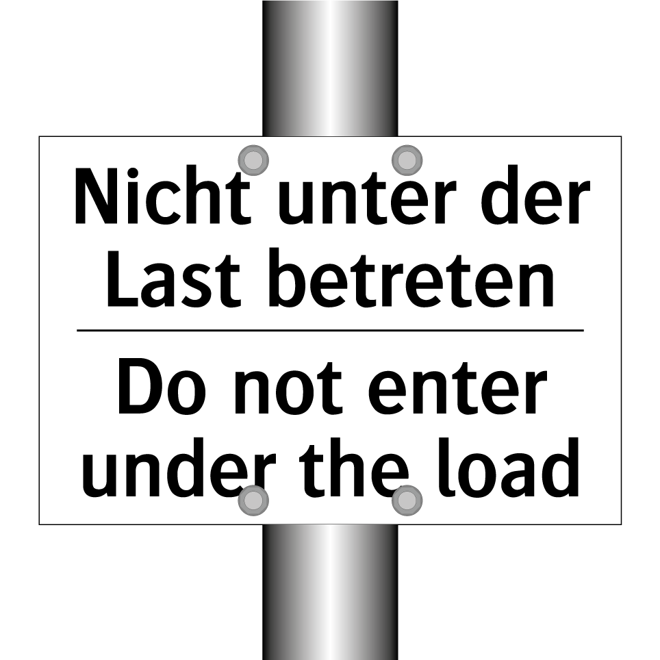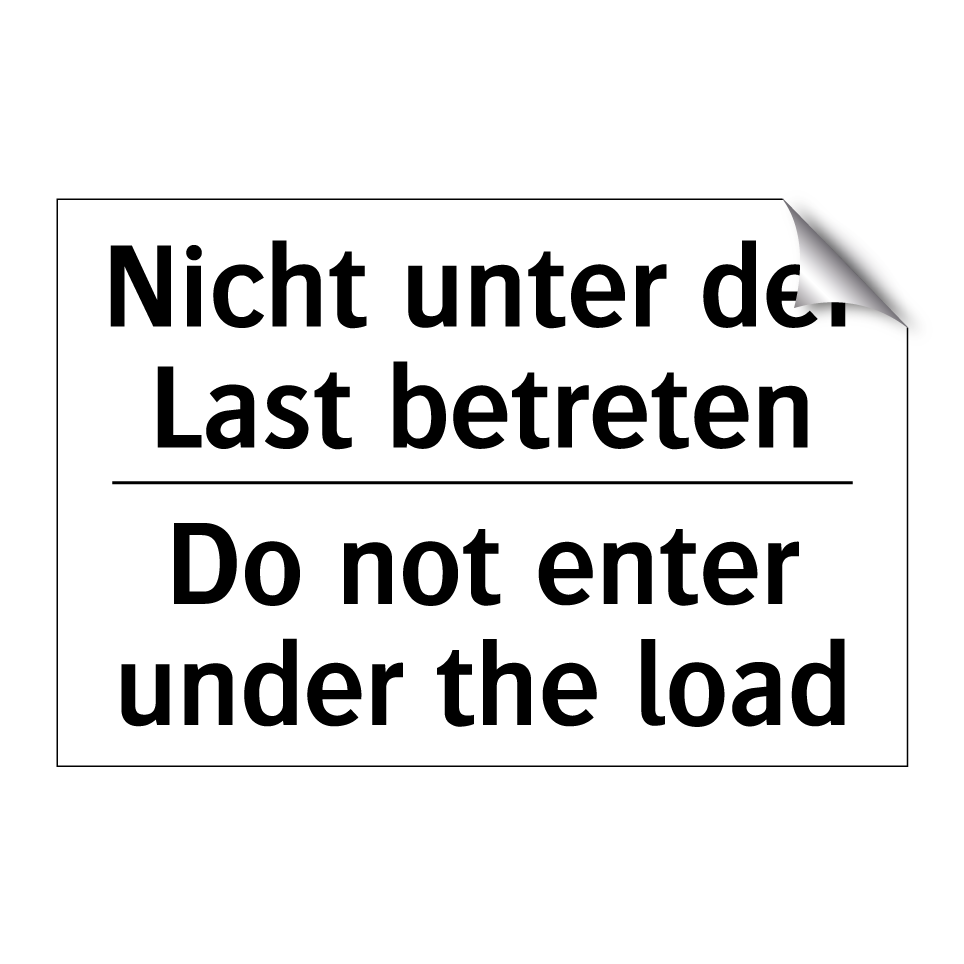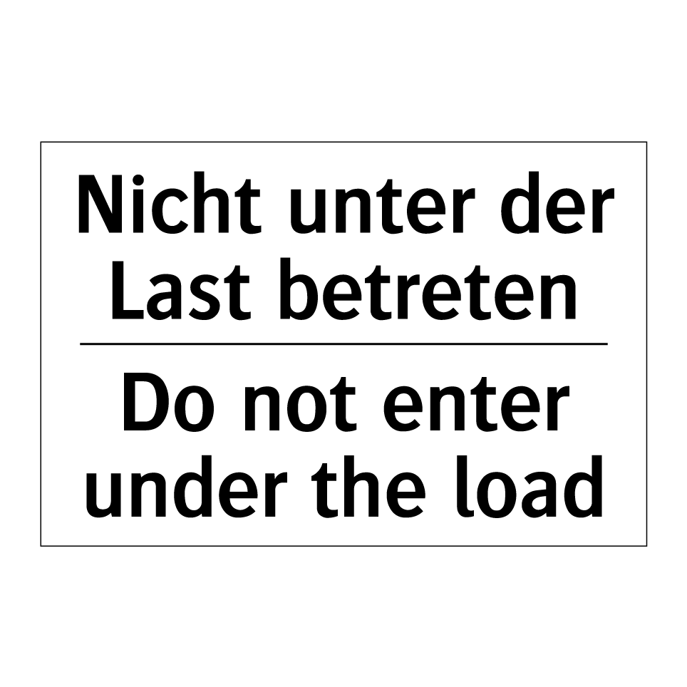 Zweisprachiges Verbotsschild mit deutschem Text Nicht unter der Last betreten und englischem Text Do not enter under the load
