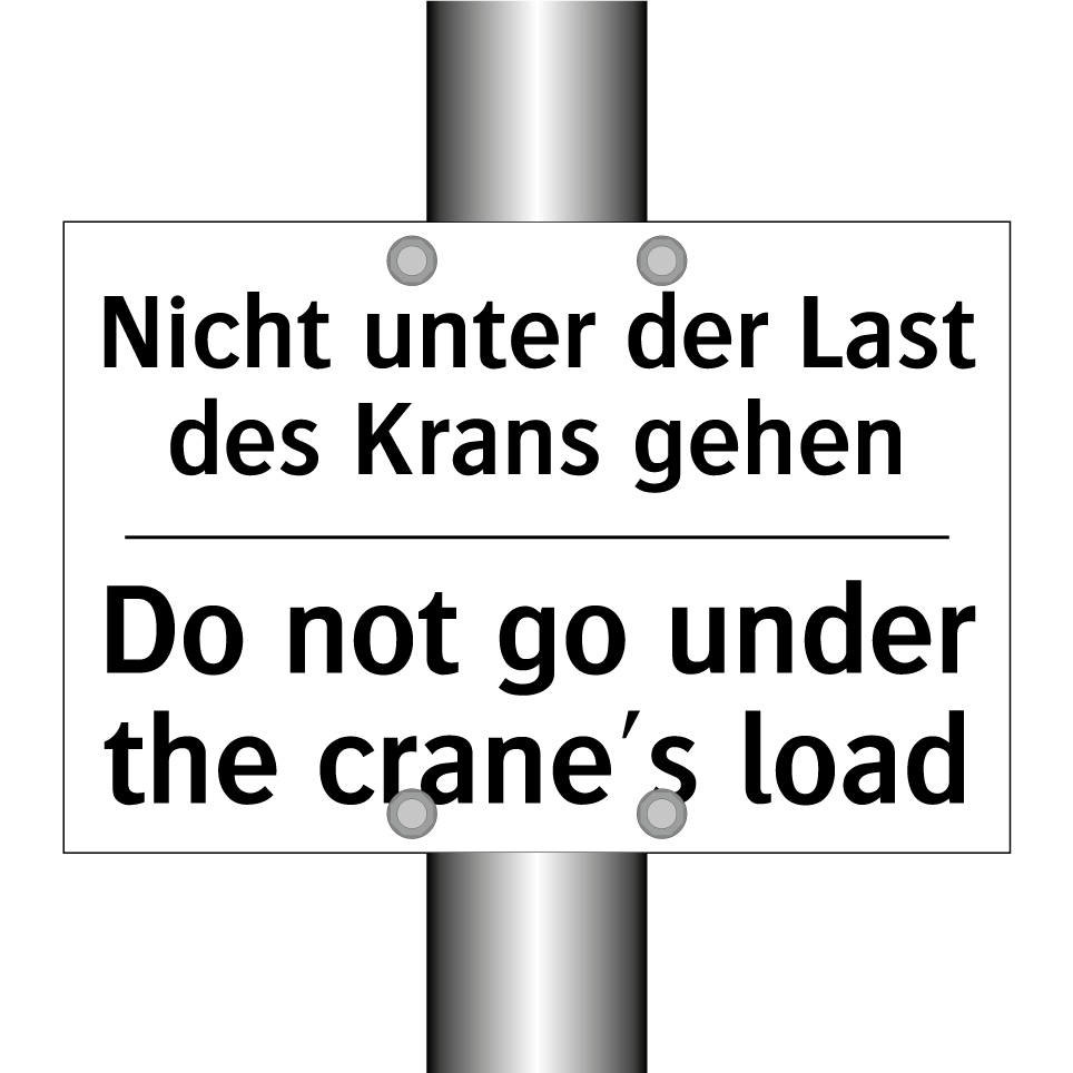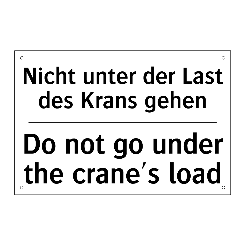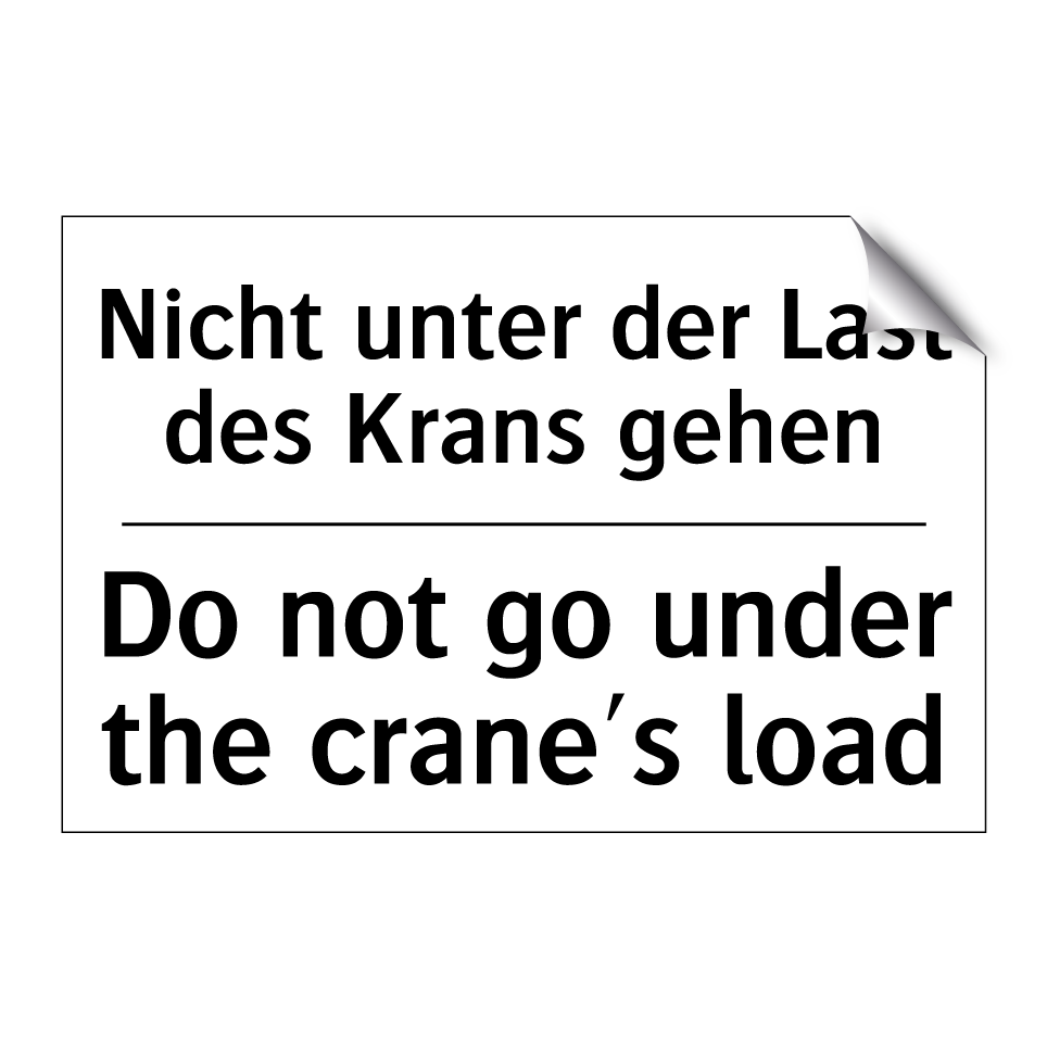 Zweisprachiges Verbotsschild mit deutschem Text Nicht unter der Last des Krans gehen und englischem Text Do not go under the crane's load