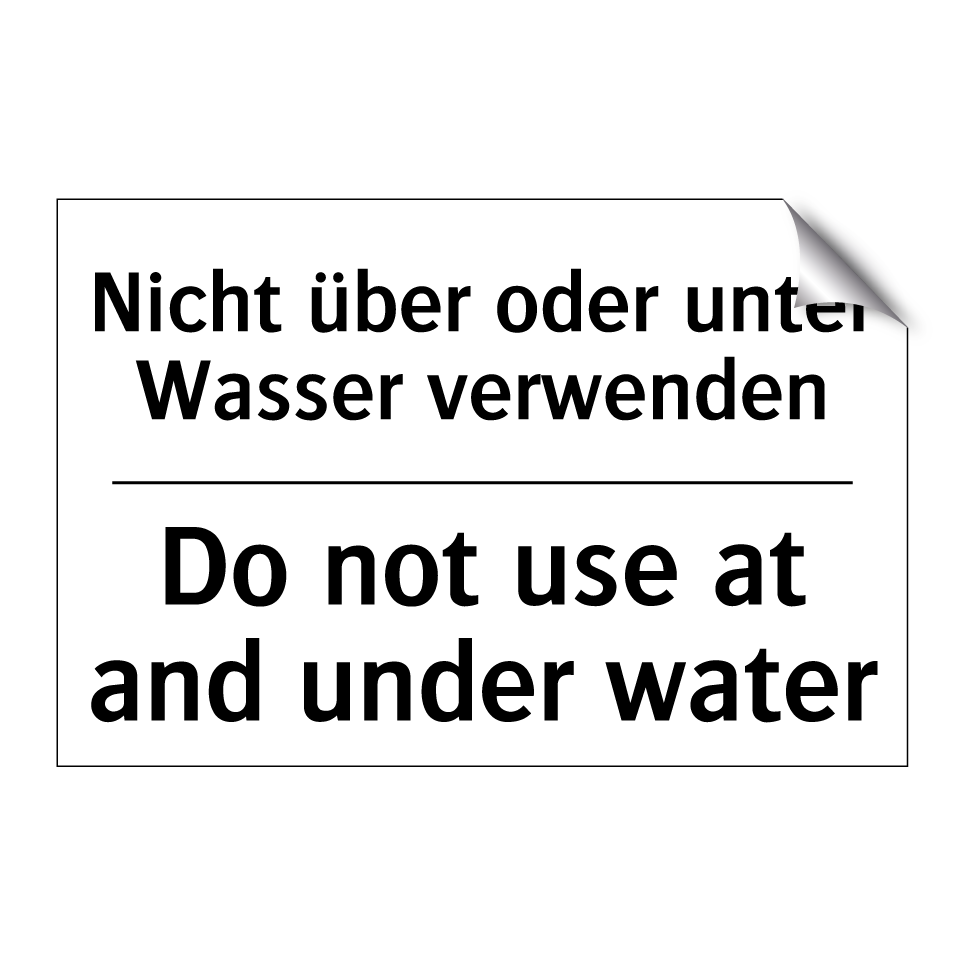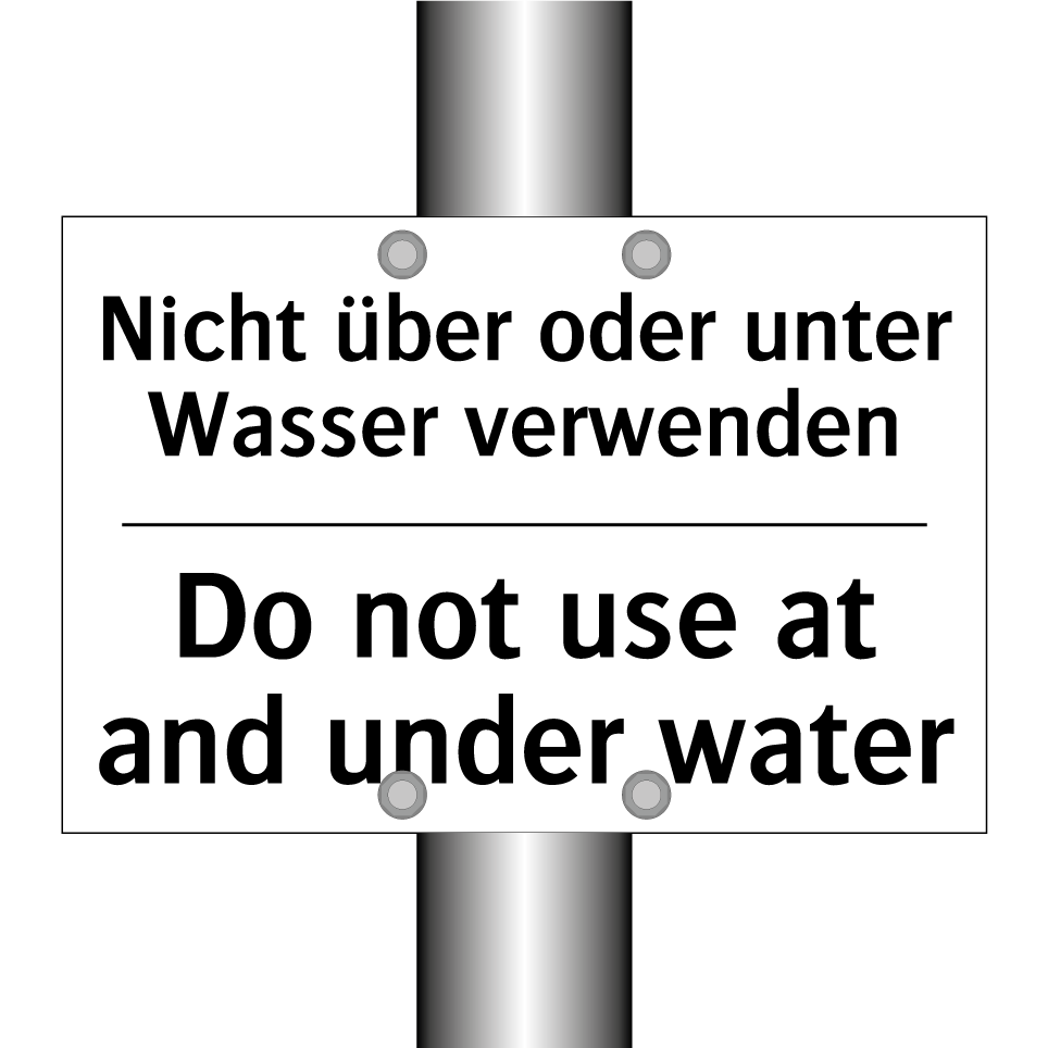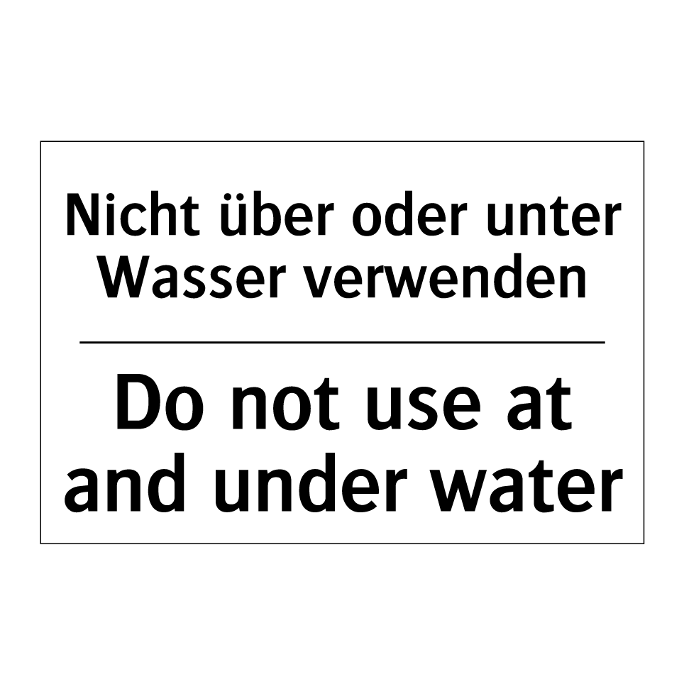 Zweisprachiges Verbotsschild mit deutschem Text Nicht über oder unter Wasser verwenden und englischem Text Do not use at and under water