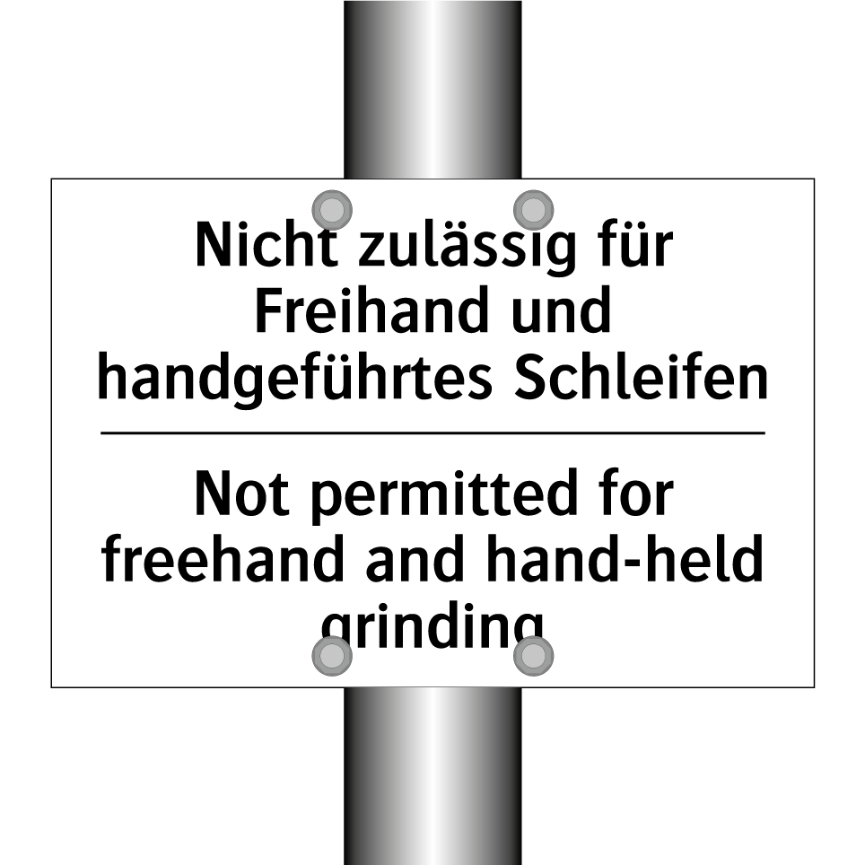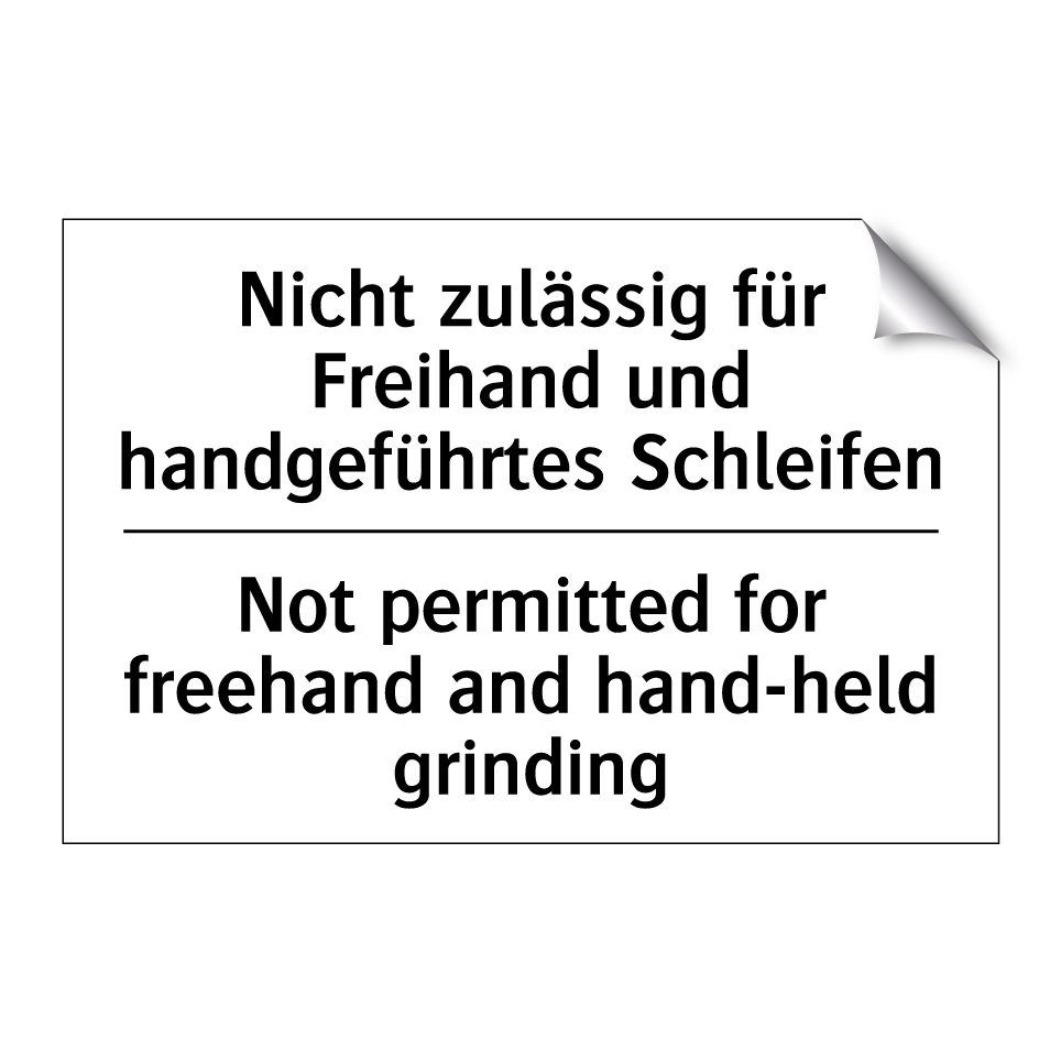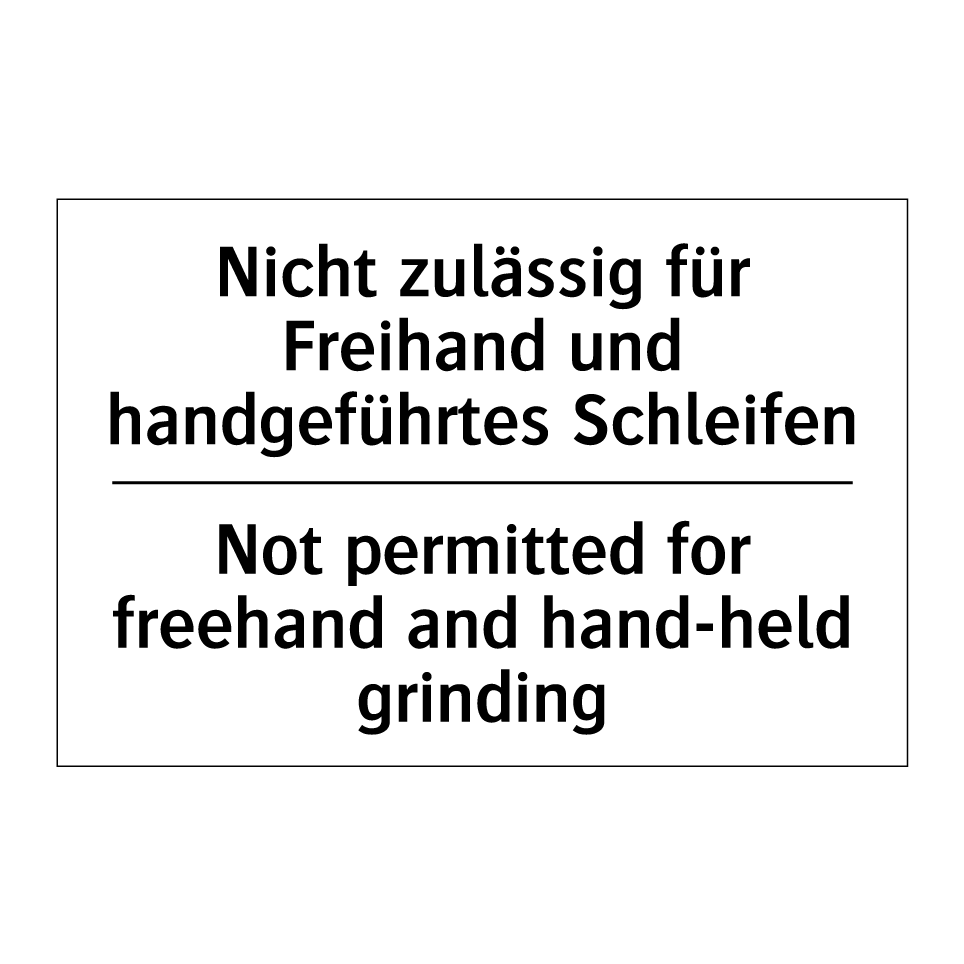 Zweisprachiges Verbotsschild mit deutschem Text Nicht zulässig für Freihand und handgeführtes Schleifen und englischem Text Not permitted for freehand and hand-held grinding
