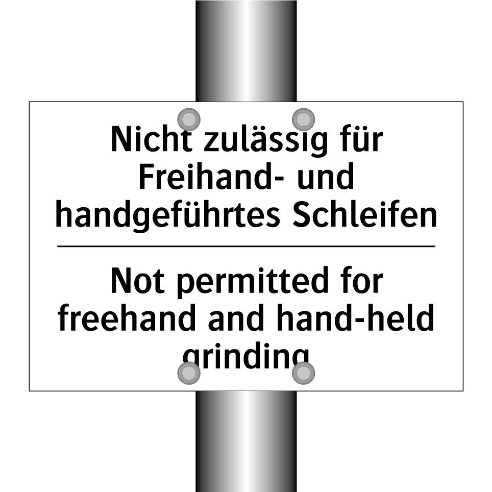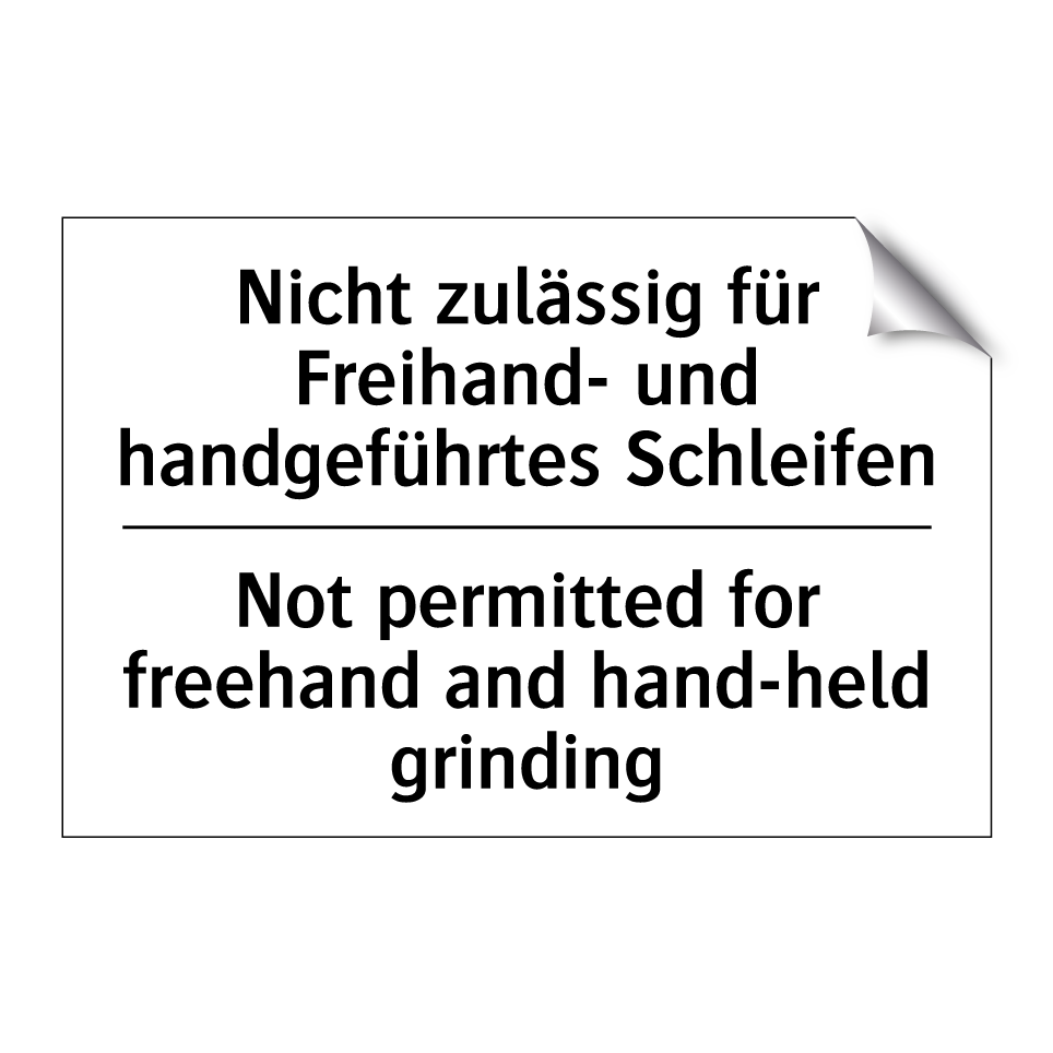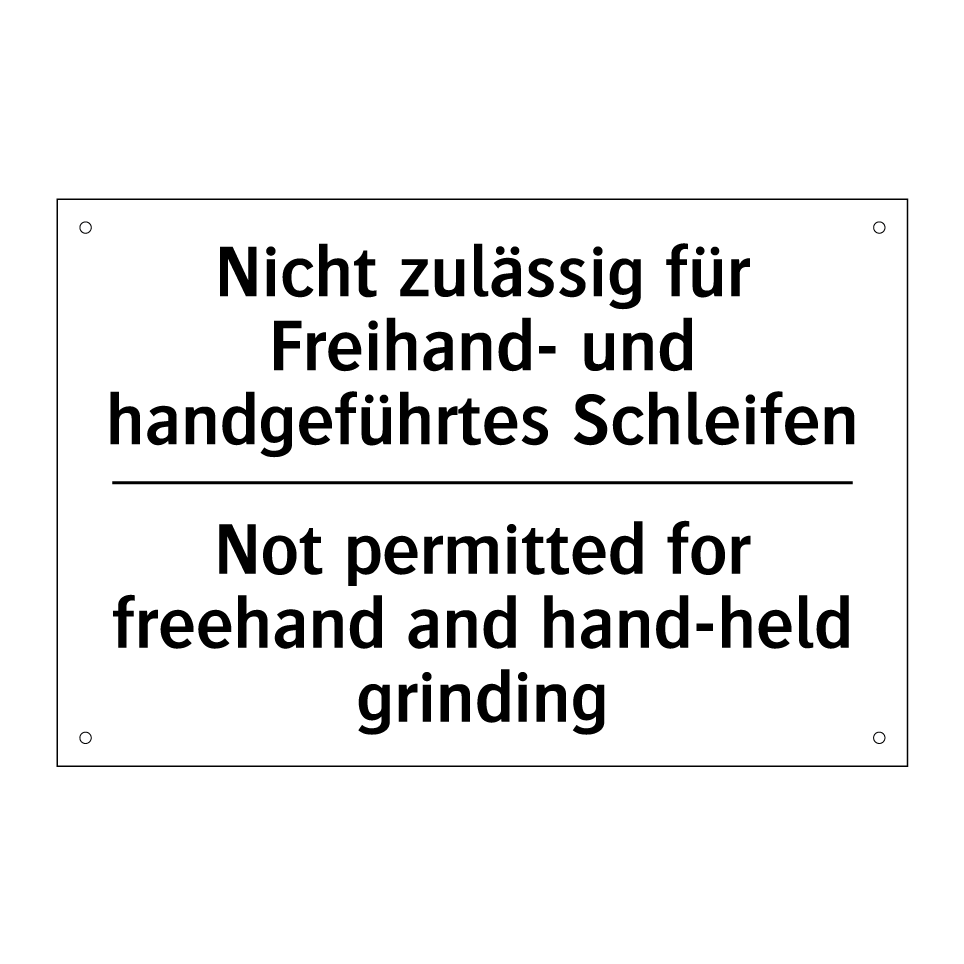 Zweisprachiges Verbotsschild mit deutschem Text Nicht zulässig für Freihand- und handgeführtes Schleifen und englischem Text Not permitted for freehand and hand-held grinding