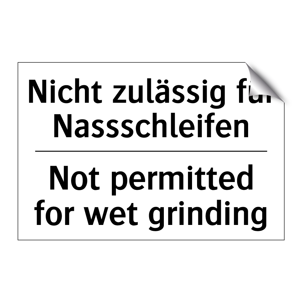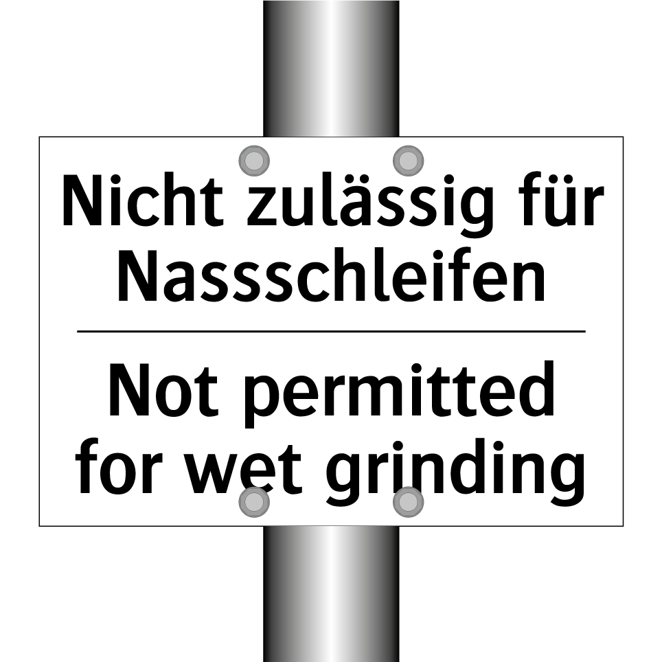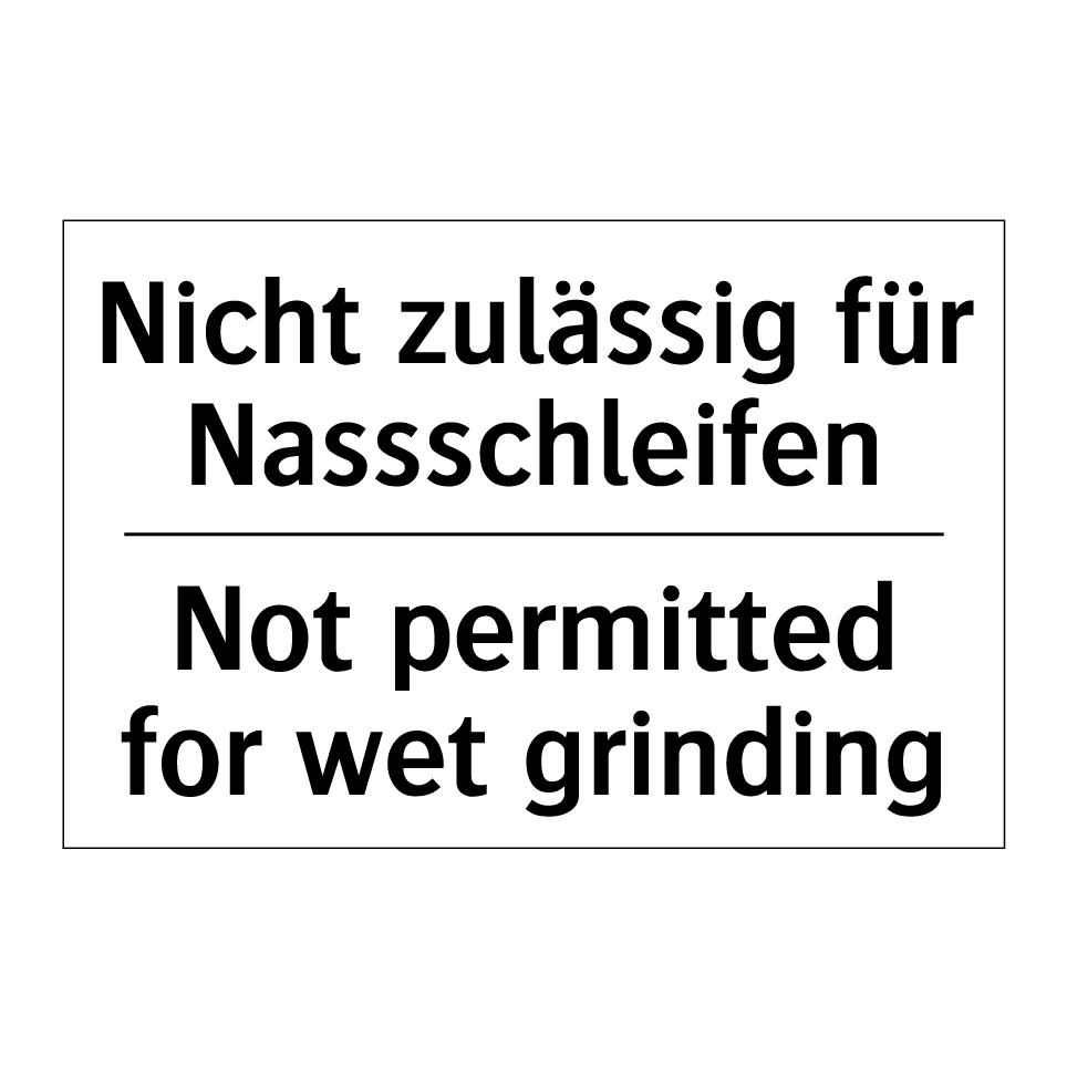 Zweisprachiges Verbotsschild mit deutschem Text Nicht zulässig für Nassschleifen und englischem Text Not permitted for wet grinding