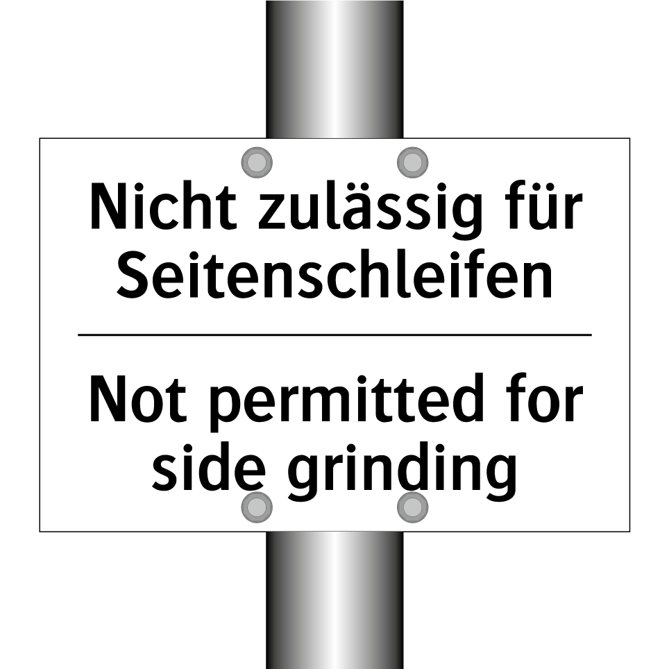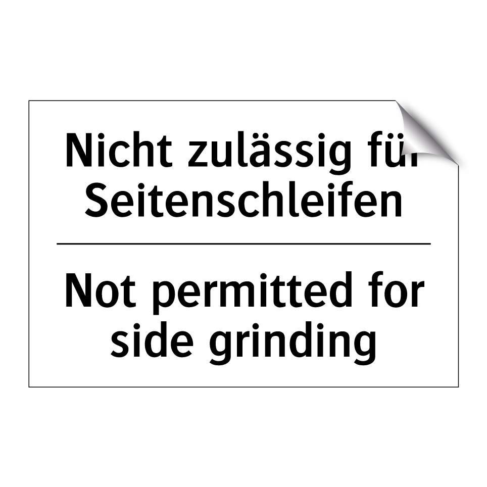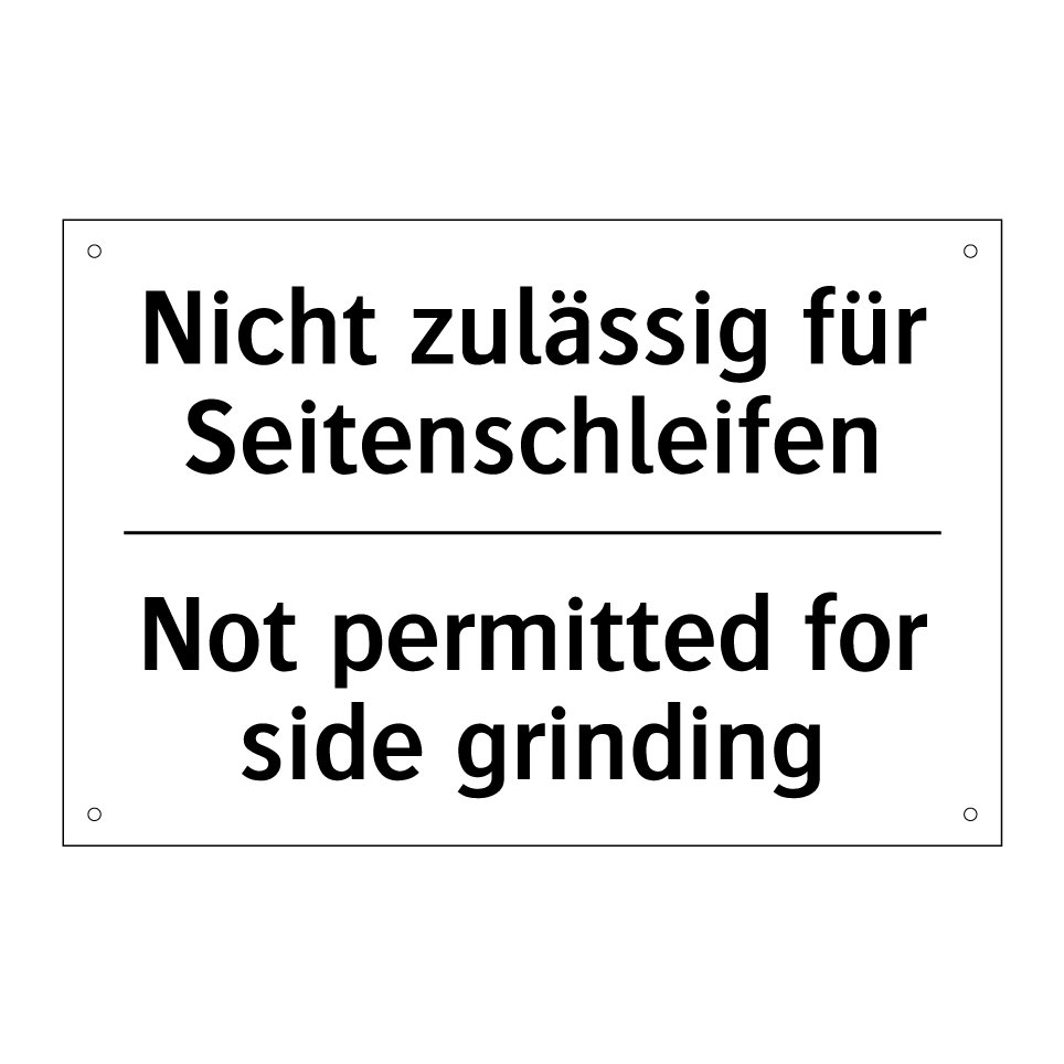 Zweisprachiges Verbotsschild mit deutschem Text Nicht zulässig für Seitenschleifen und englischem Text Not permitted for side grinding