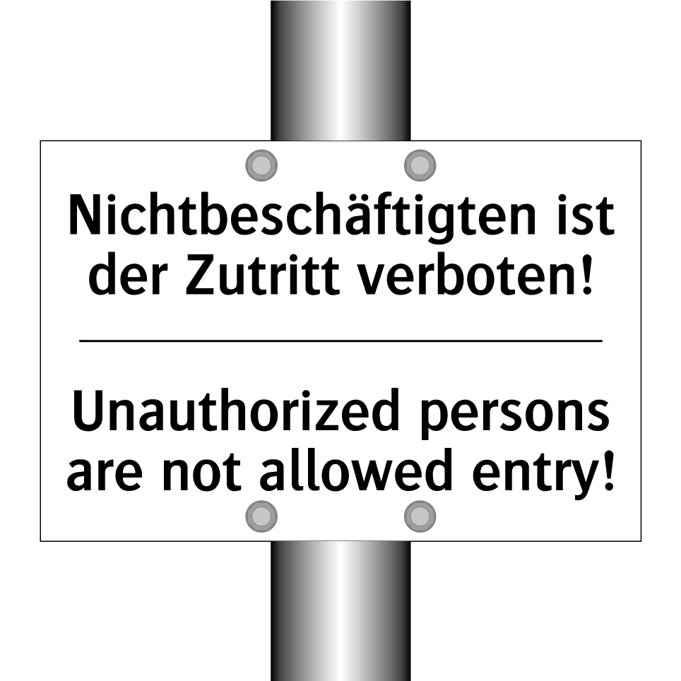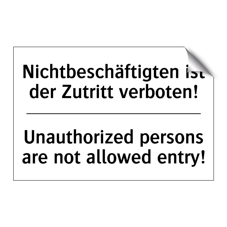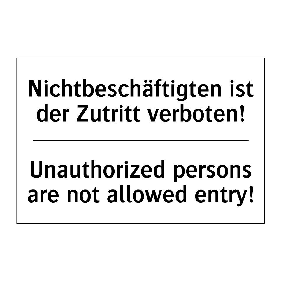 Zweisprachiges Verbotsschild mit deutschem Text Nichtbeschäftigten ist der Zutritt verboten! und englischem Text Unauthorized persons are not allowed entry!