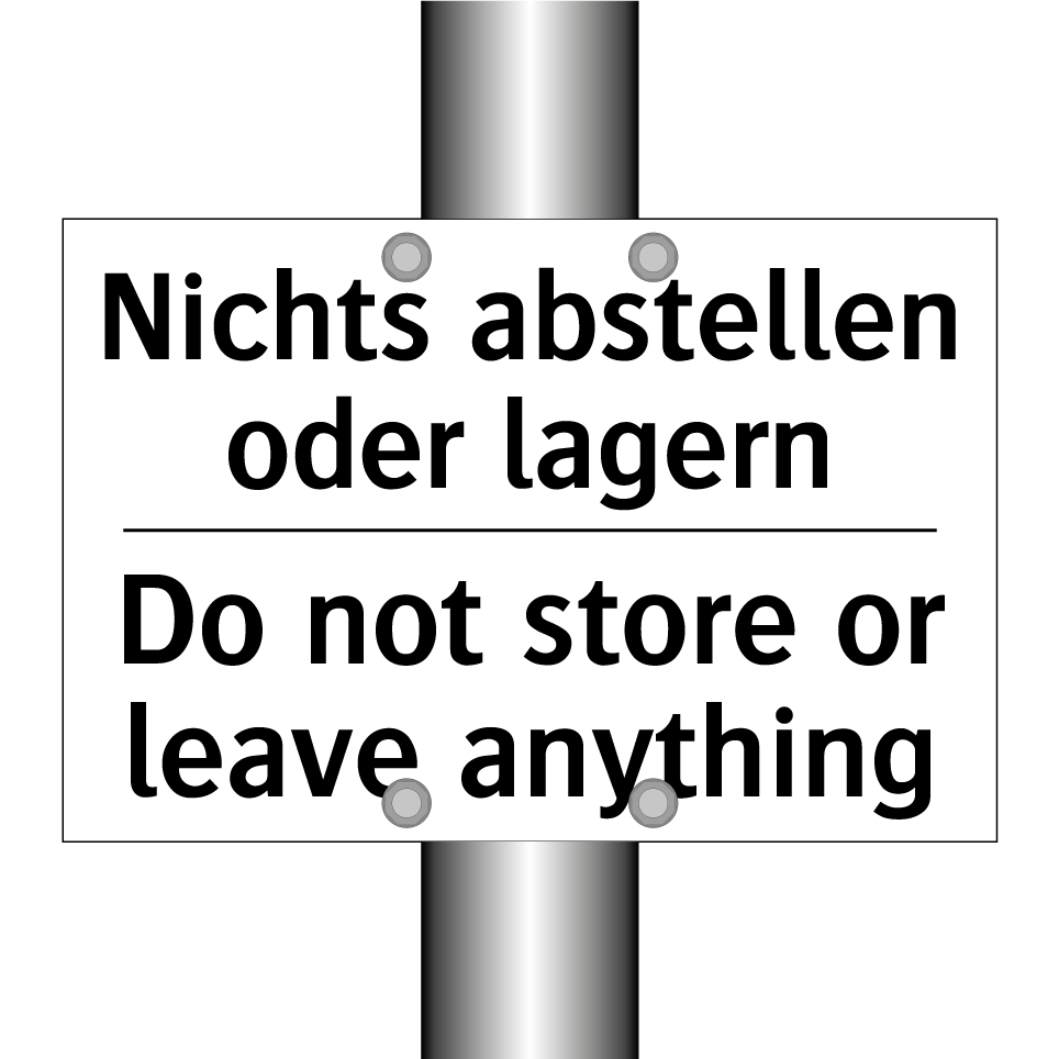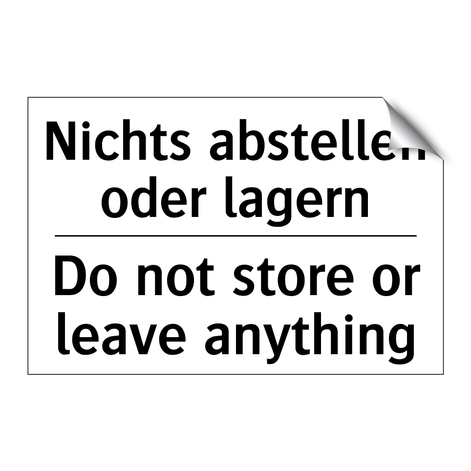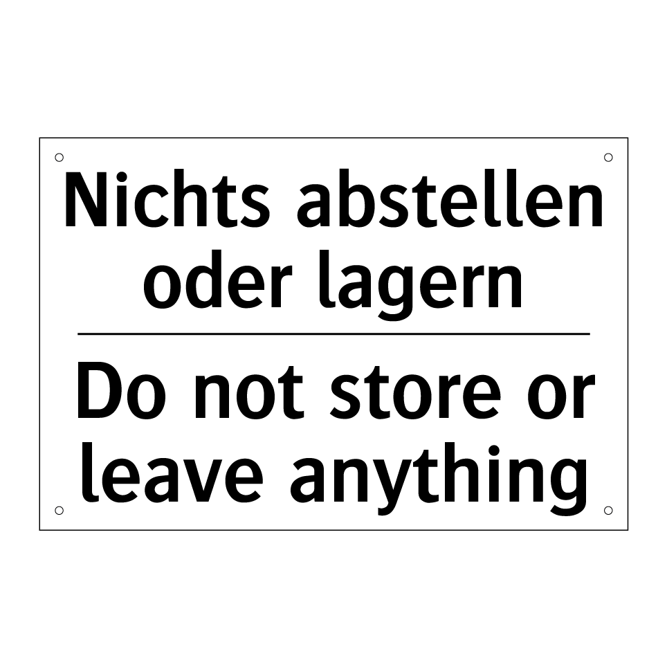 Zweisprachiges Verbotsschild mit deutschem Text Nichts abstellen oder lagern und englischem Text Do not store or leave anything