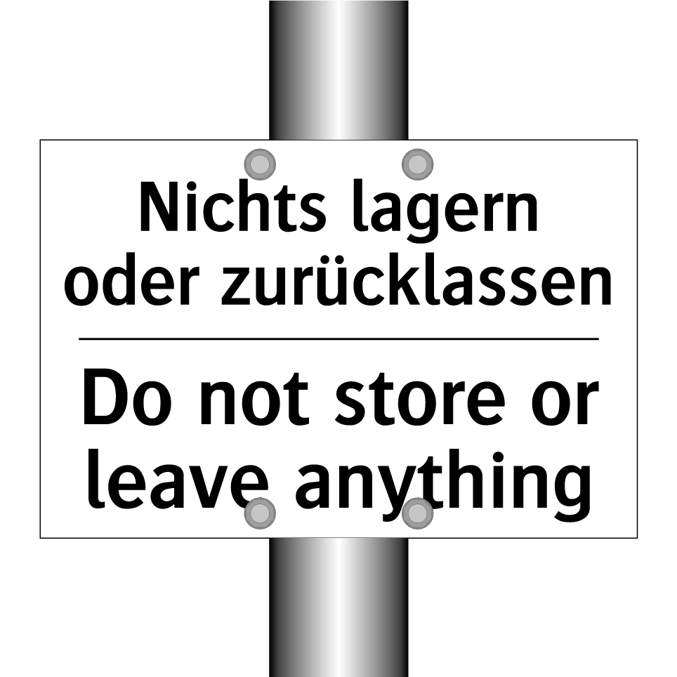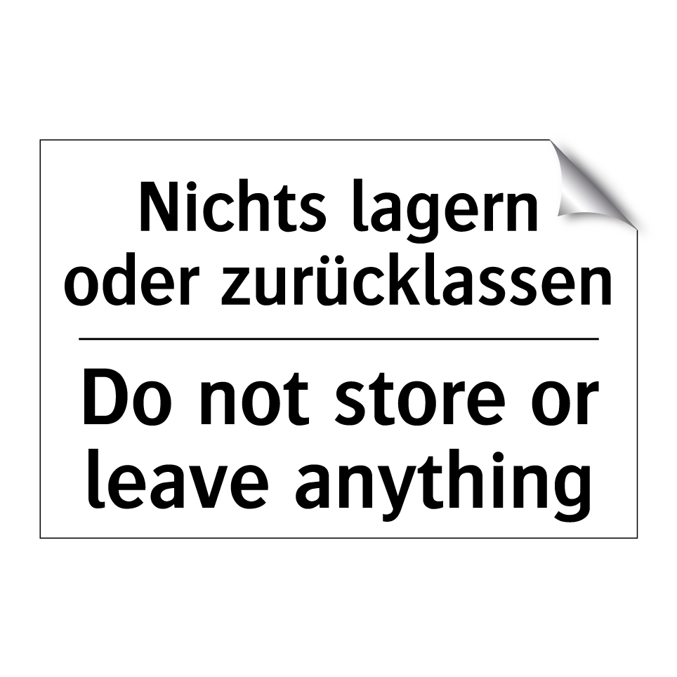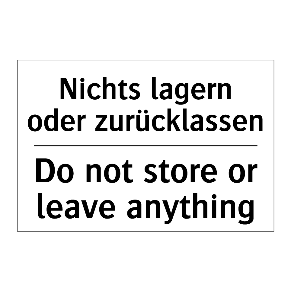 Zweisprachiges Verbotsschild mit deutschem Text Nichts lagern oder zurücklassen und englischem Text Do not store or leave anything