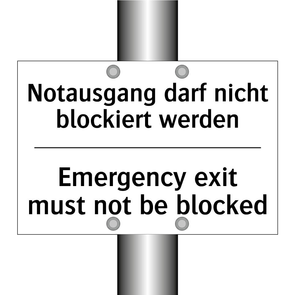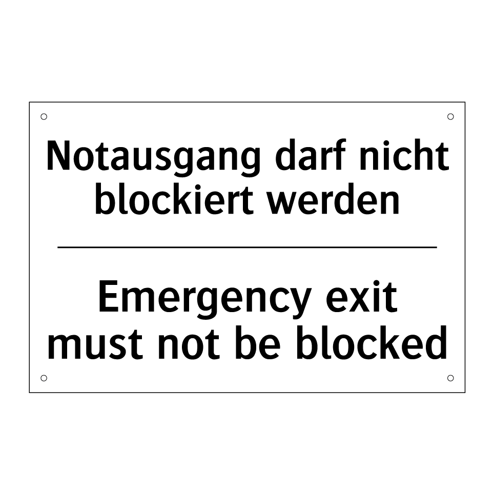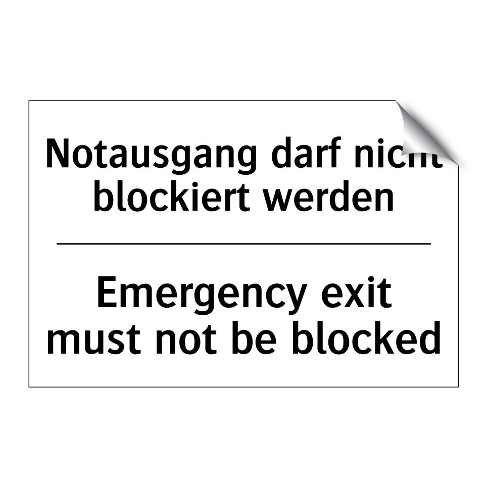 Zweisprachiges Verbotsschild mit deutschem Text Notausgang darf nicht blockiert werden und englischem Text Emergency exit must not be blocked