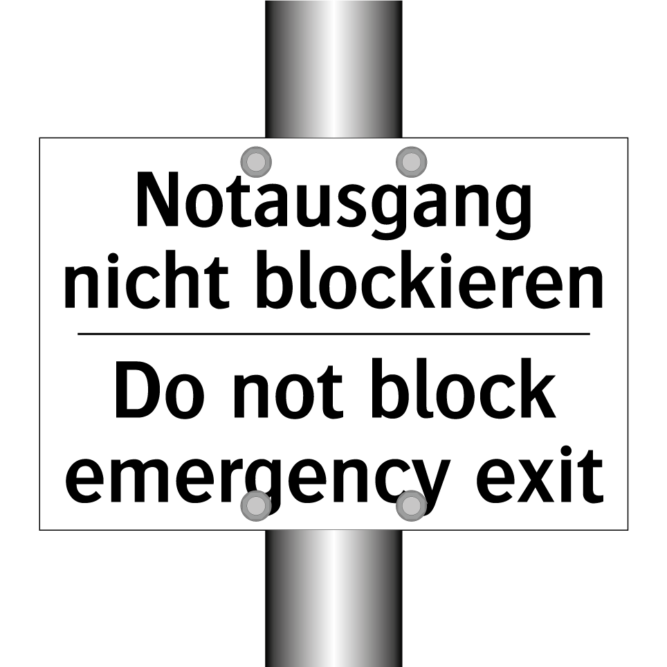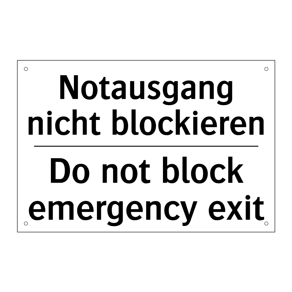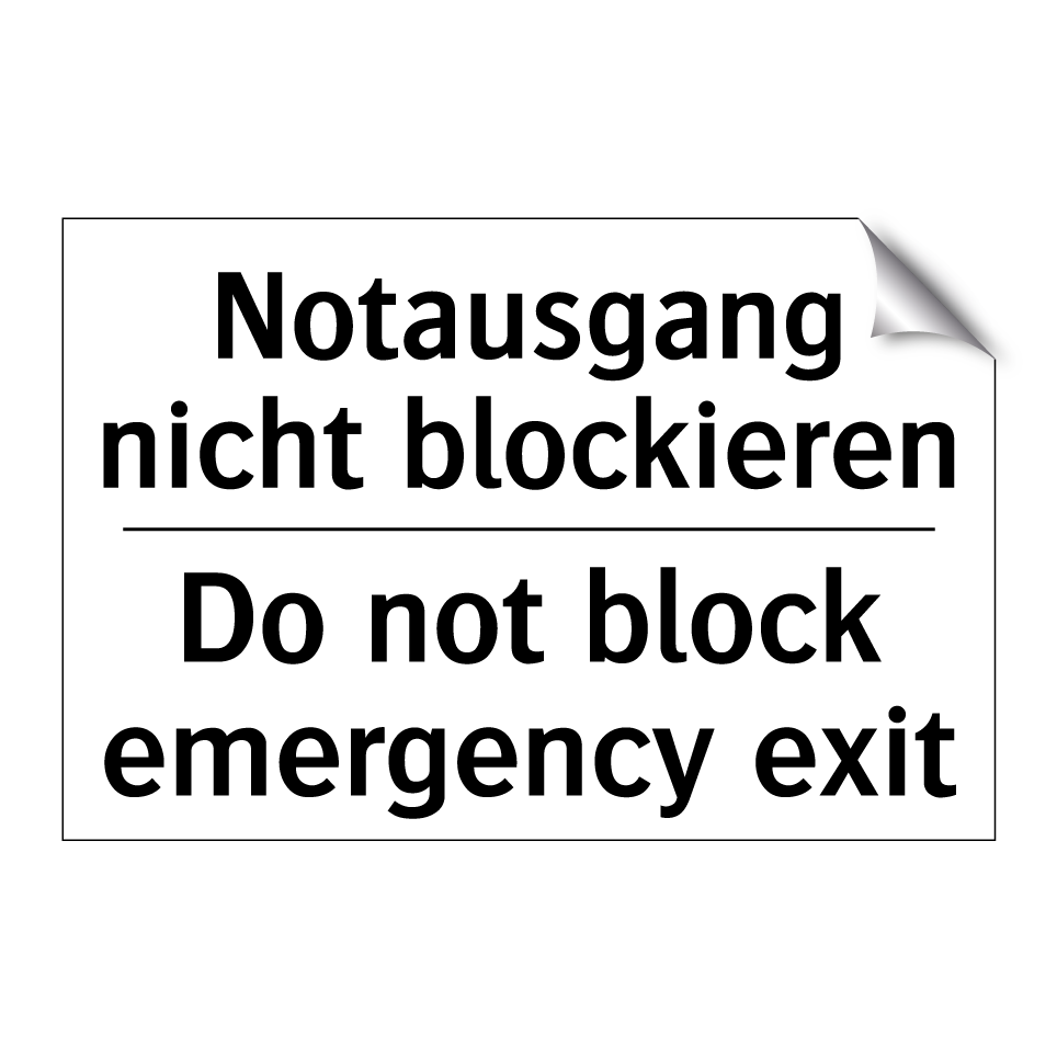 Zweisprachiges Verbotsschild mit deutschem Text Notausgang nicht blockieren und englischem Text Do not block emergency exit