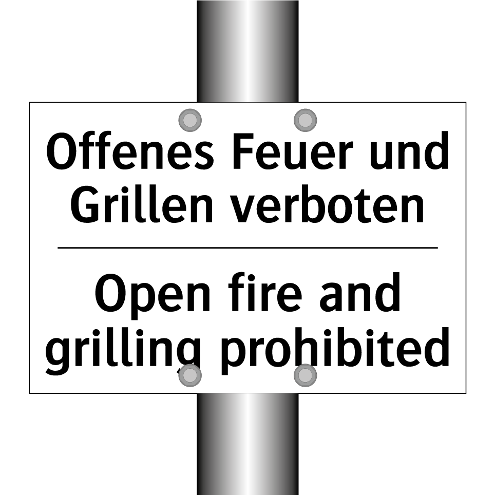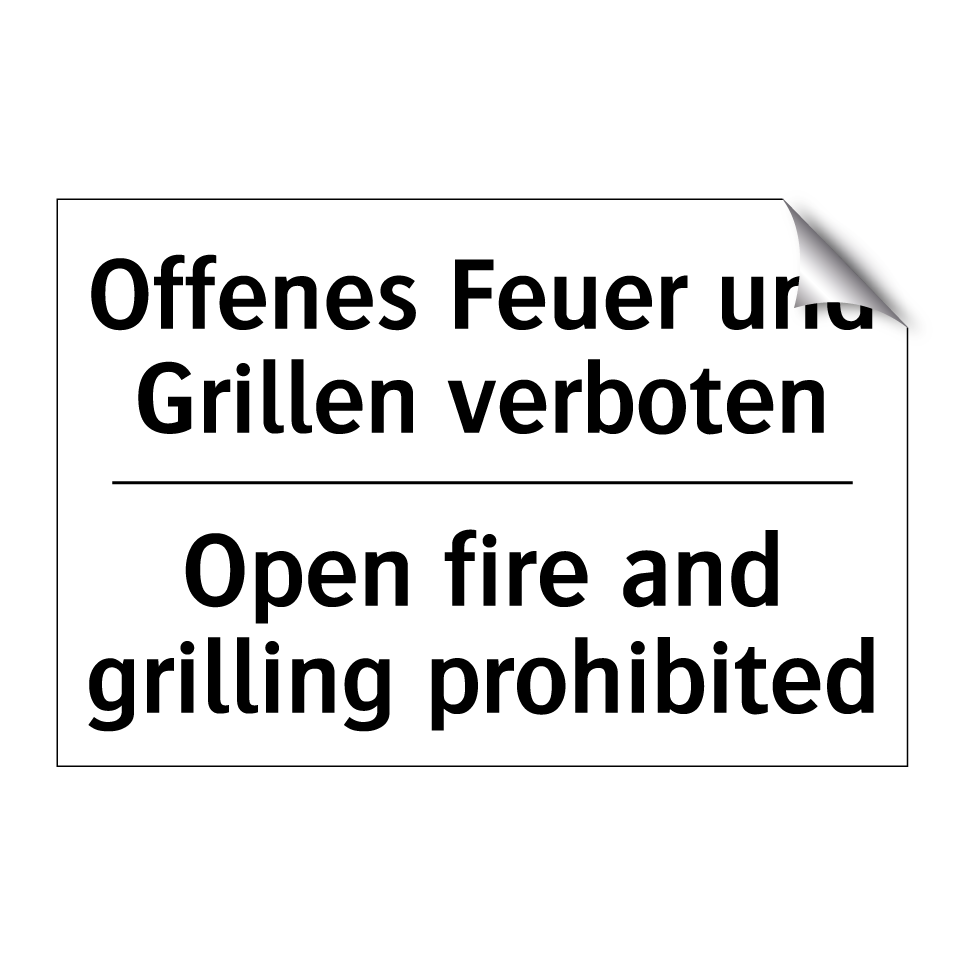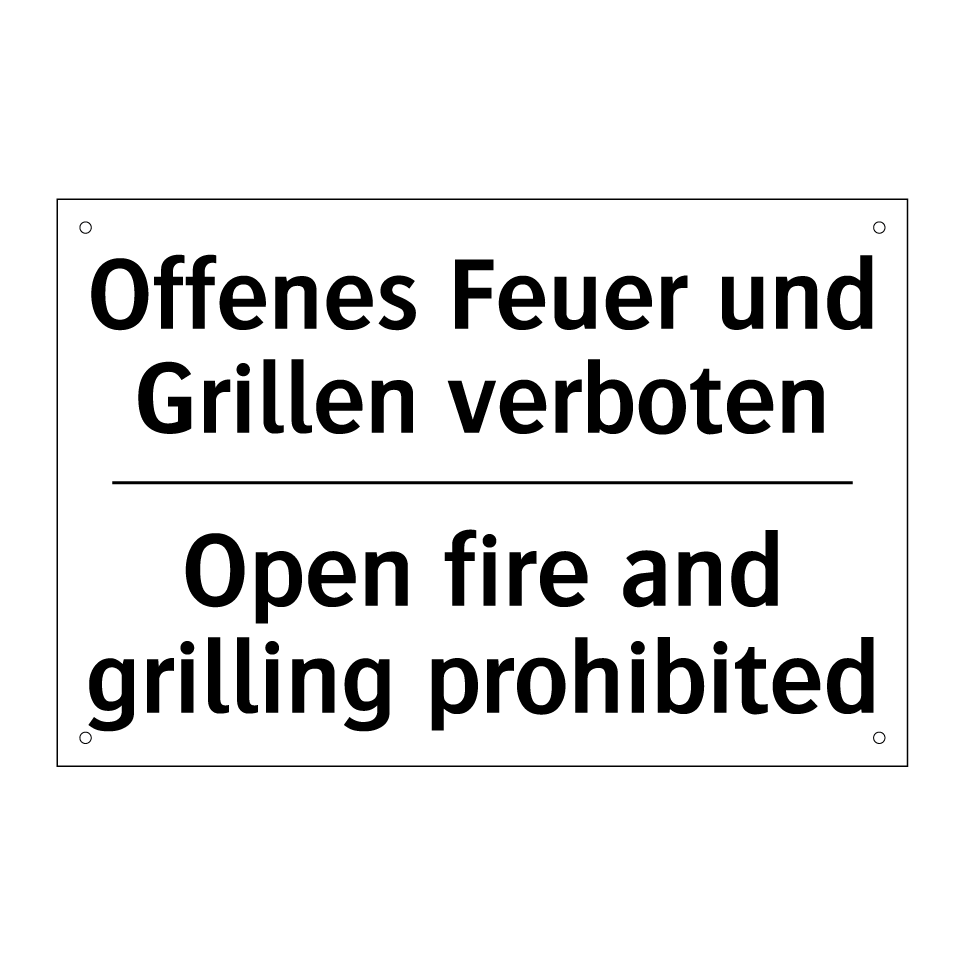 Zweisprachiges Verbotsschild mit deutschem Text Offenes Feuer und Grillen verboten und englischem Text Open fire and grilling prohibited