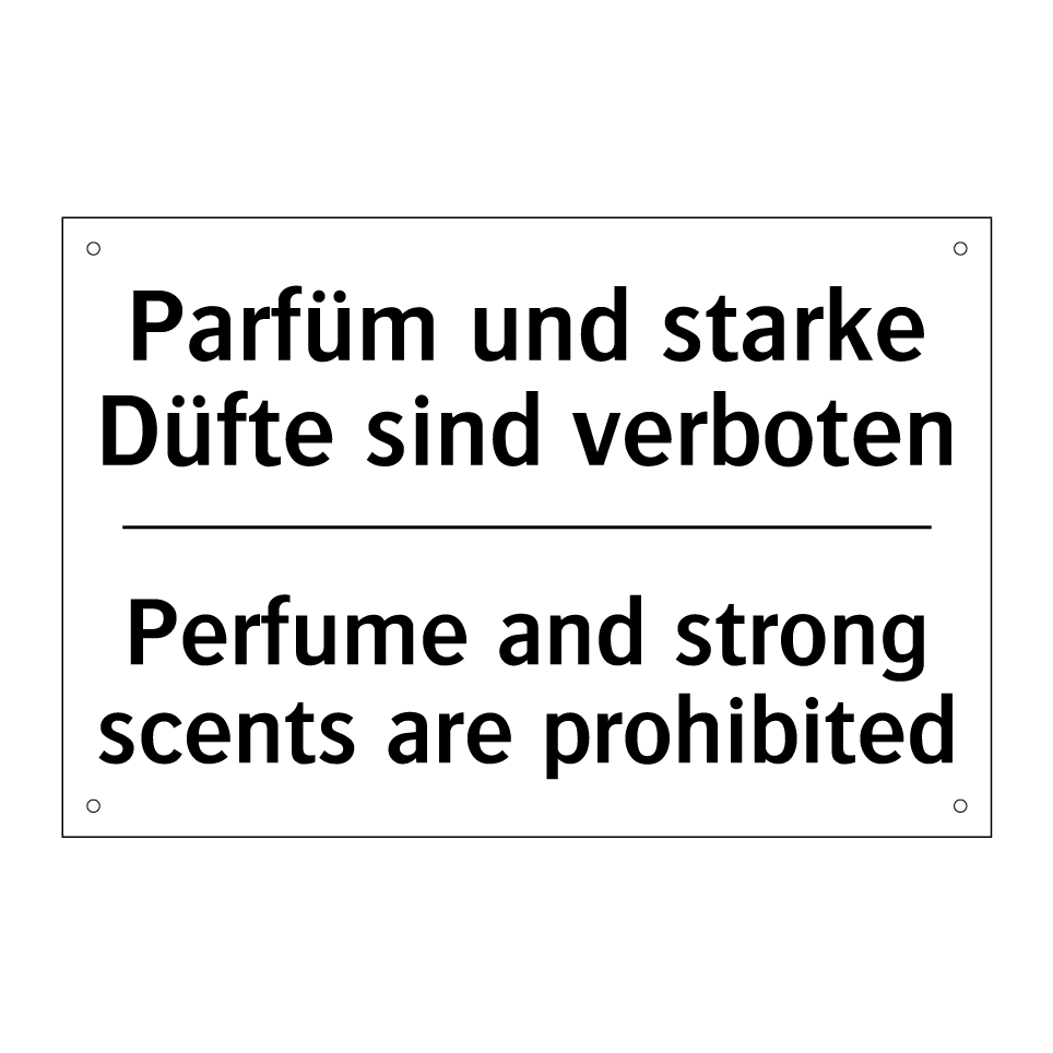 Zweisprachiges Verbotsschild mit deutschem Text Parfüm und starke Düfte sind verboten und englischem Text Perfume and strong scents are prohibited