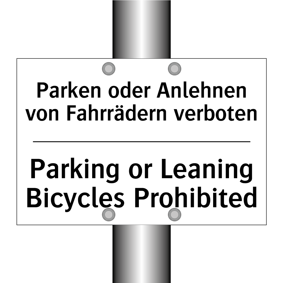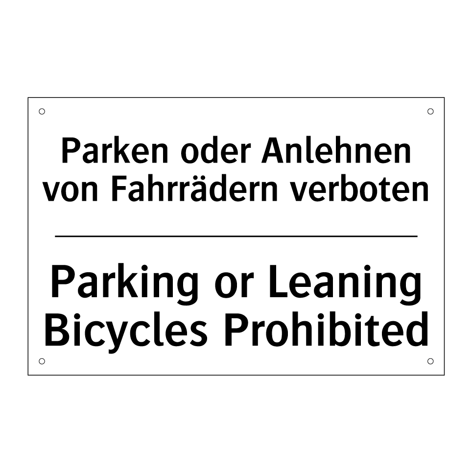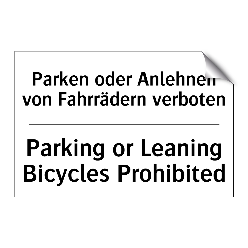 Zweisprachiges Verbotsschild mit deutschem Text Parken oder Anlehnen von Fahrrädern verboten und englischem Text Parking or Leaning Bicycles Prohibited