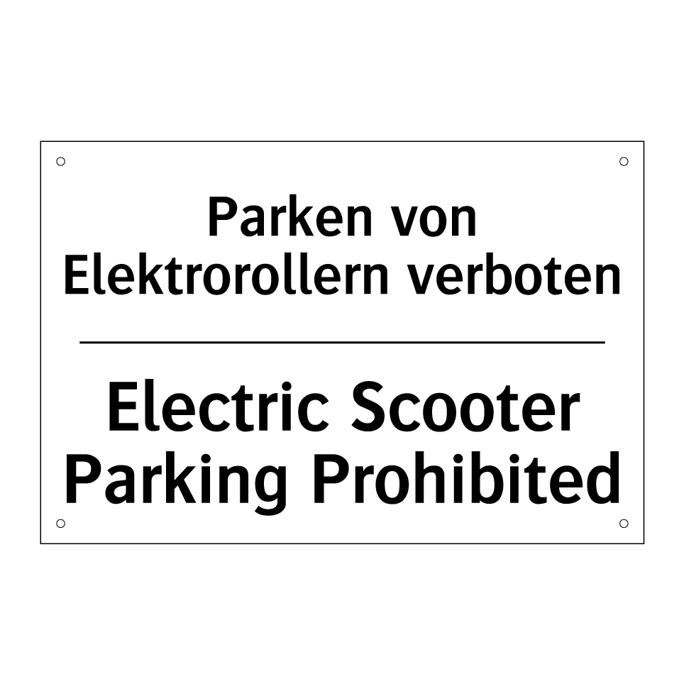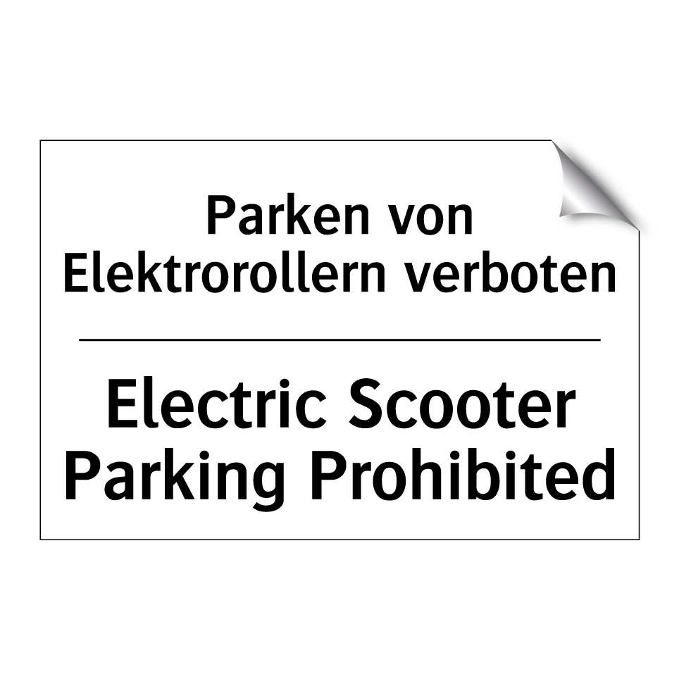 Zweisprachiges Verbotsschild mit deutschem Text Parken von Elektrorollern verboten und englischem Text Electric Scooter Parking Prohibited