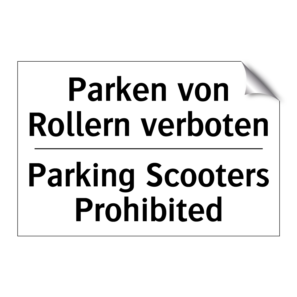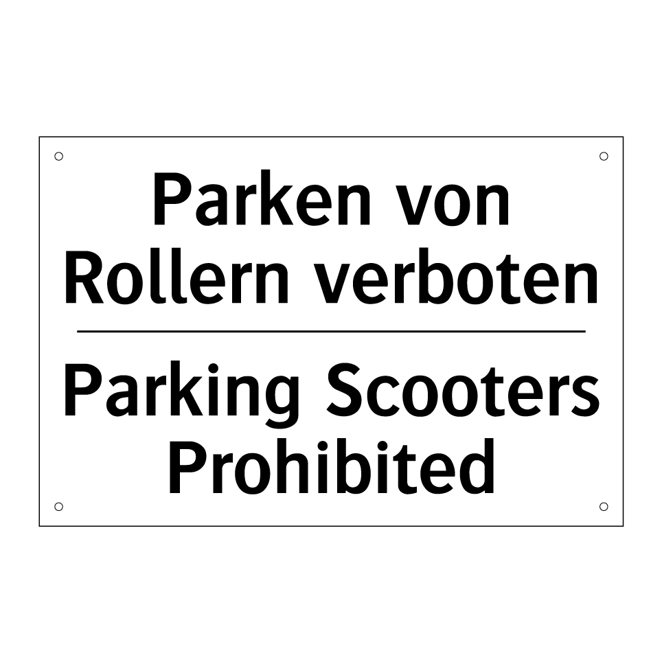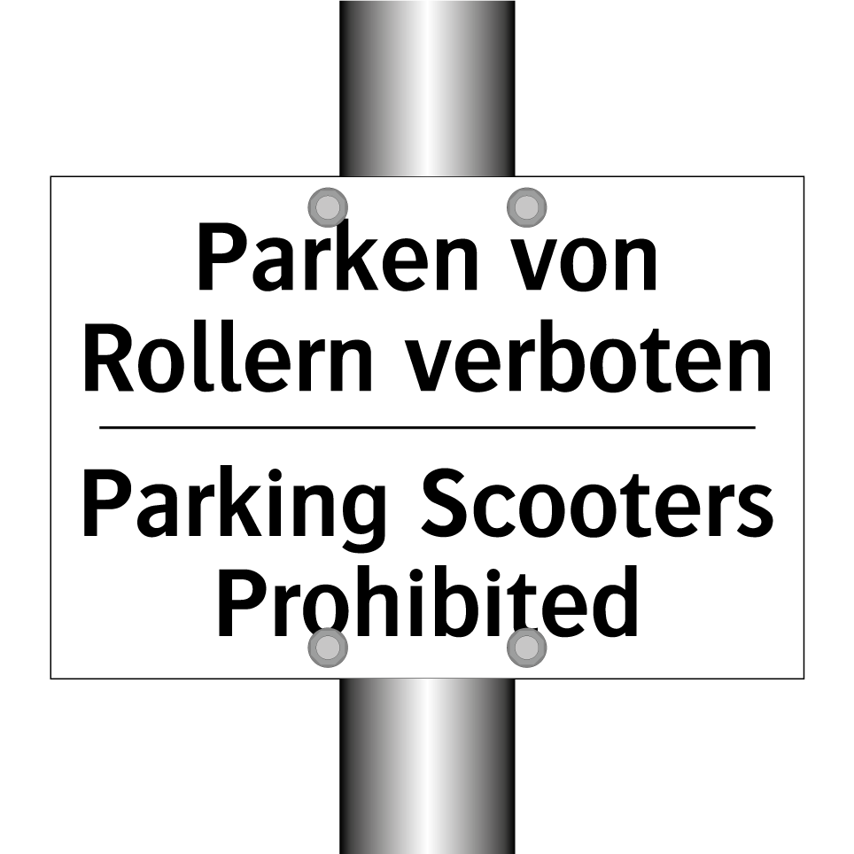 Zweisprachiges Verbotsschild mit deutschem Text Parken von Rollern verboten und englischem Text Parking Scooters Prohibited