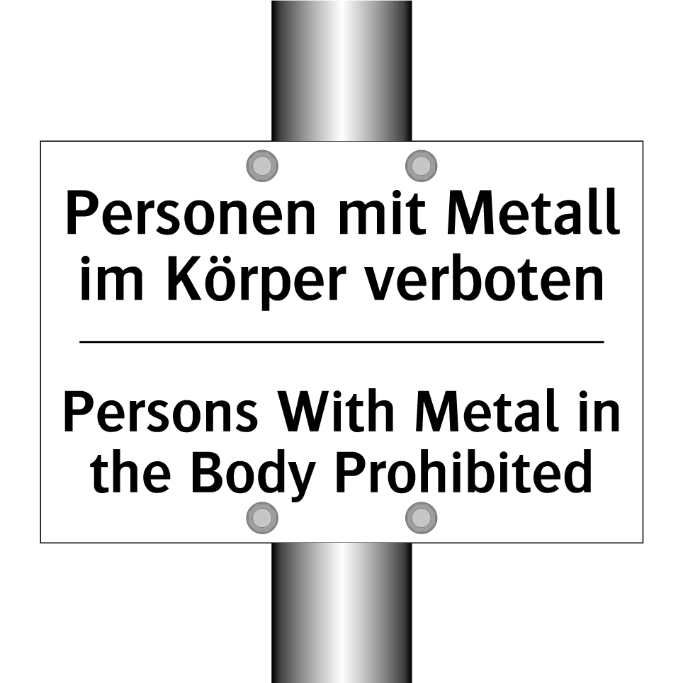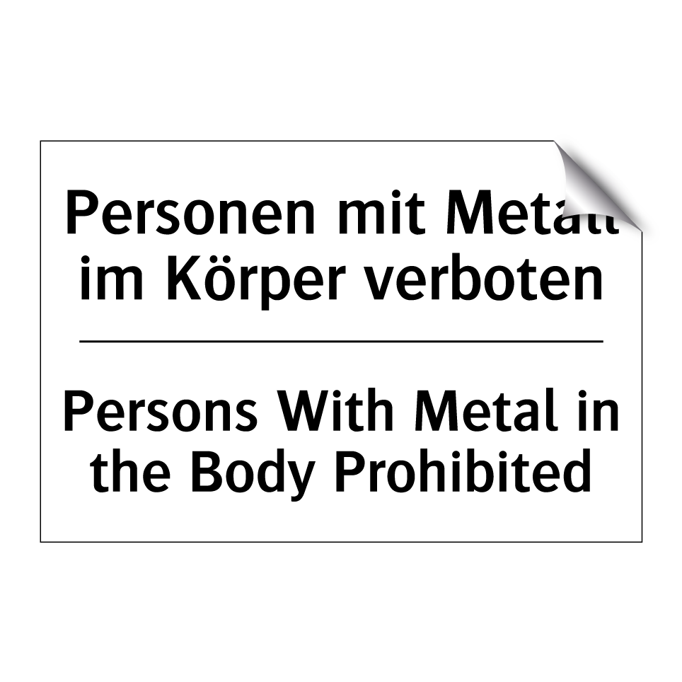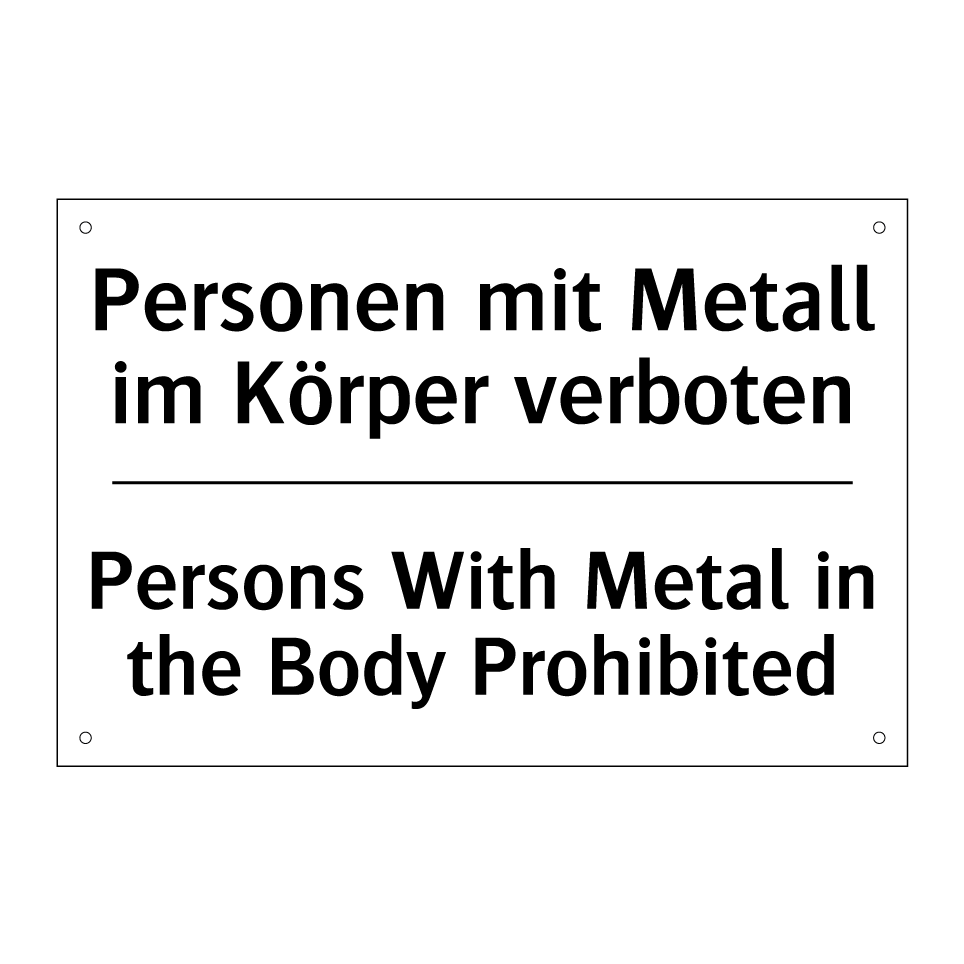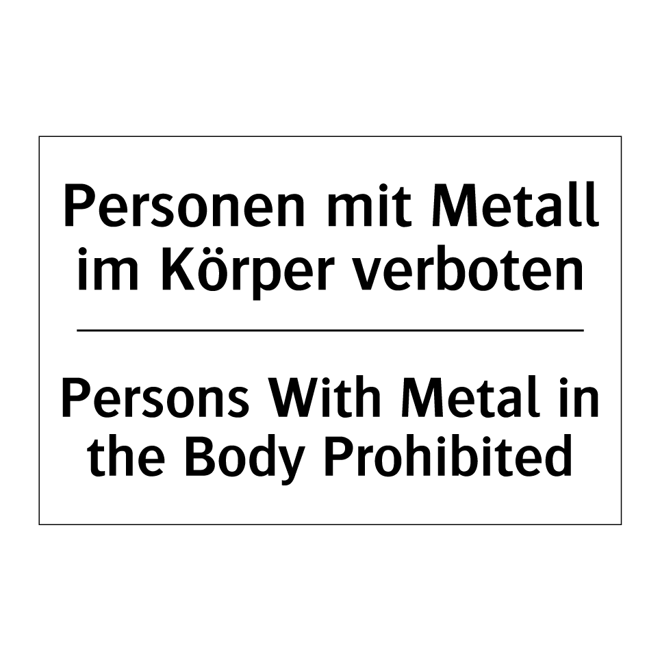 Zweisprachiges Verbotsschild mit deutschem Text Personen mit Metall im Körper verboten und englischem Text Persons With Metal in the Body Prohibited