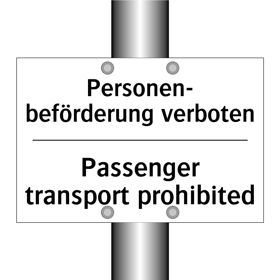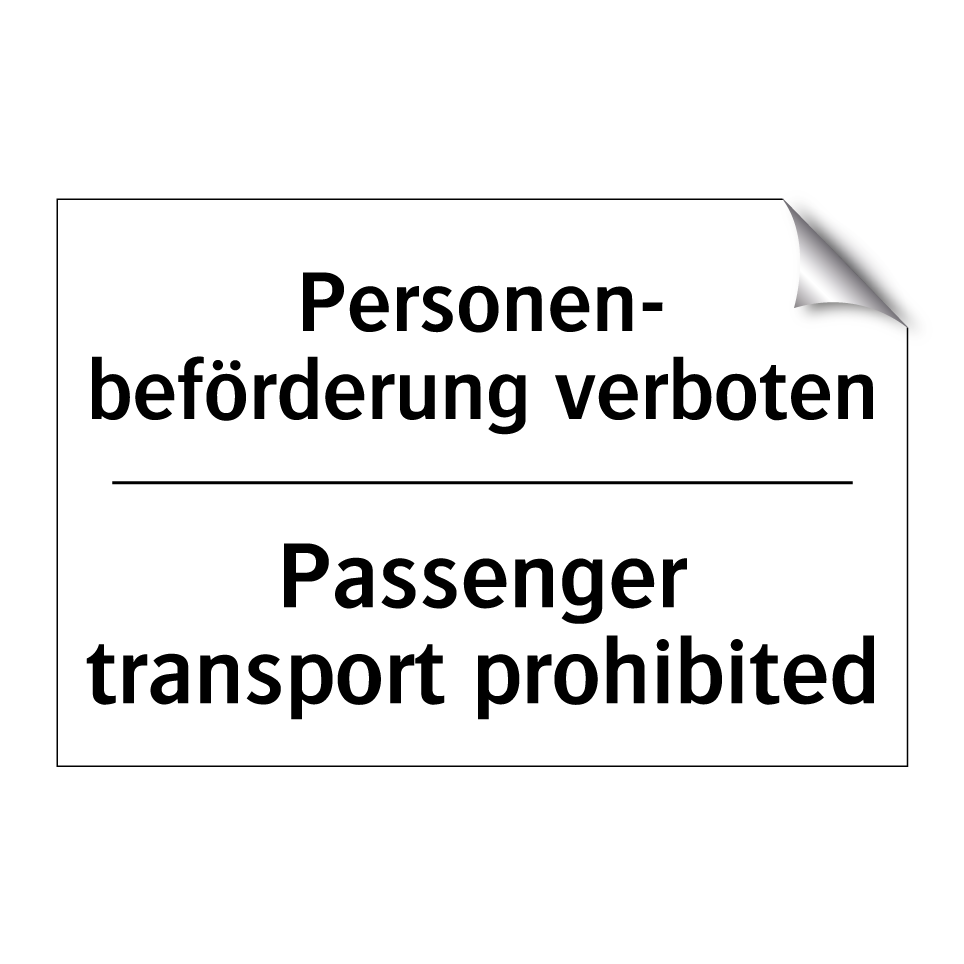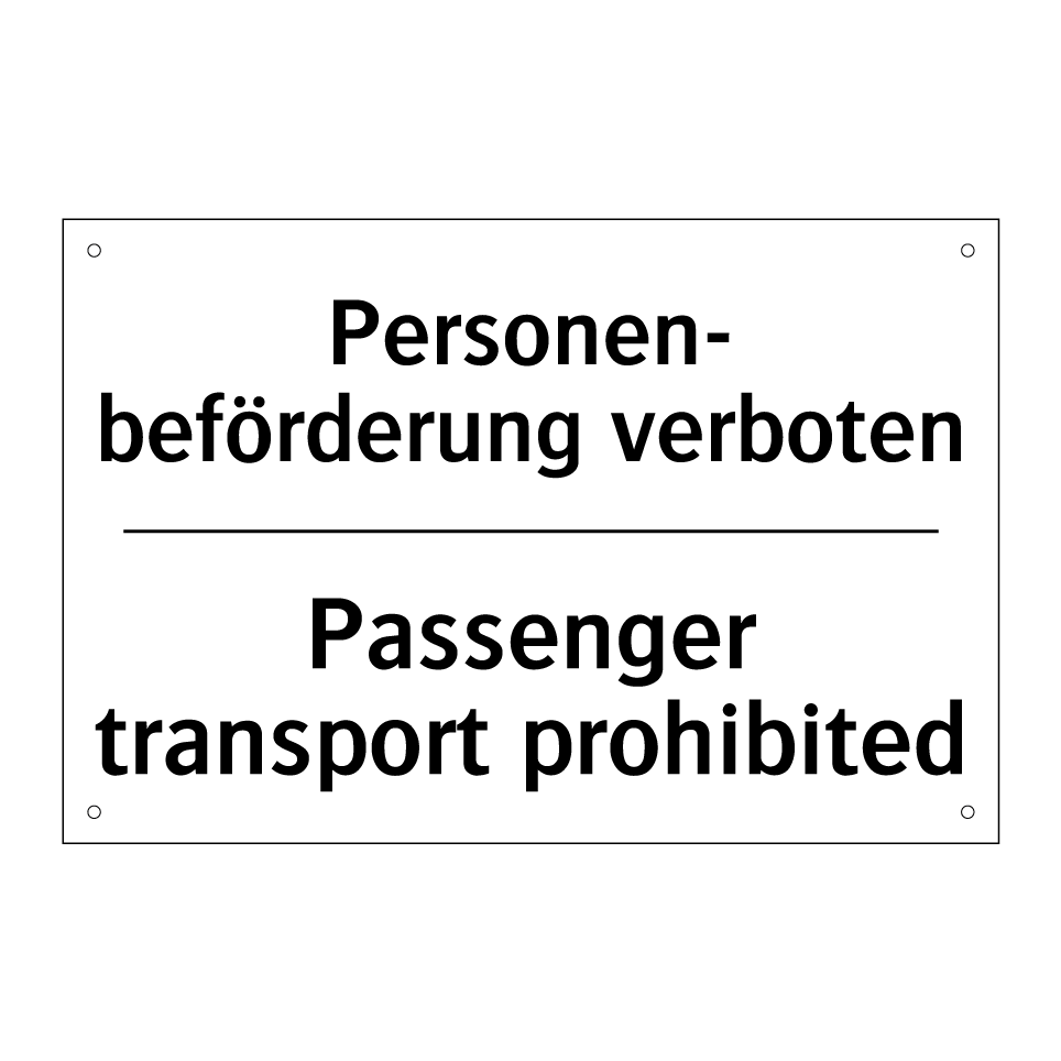 Zweisprachiges Verbotsschild mit deutschem Text Personen- beförderung verboten und englischem Text Passenger transport prohibited