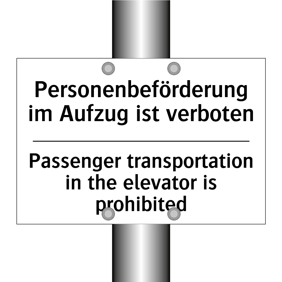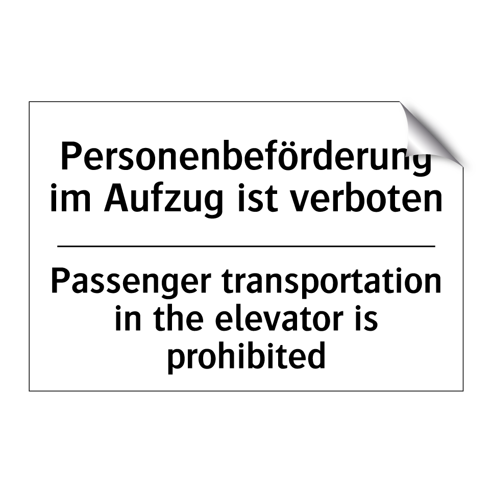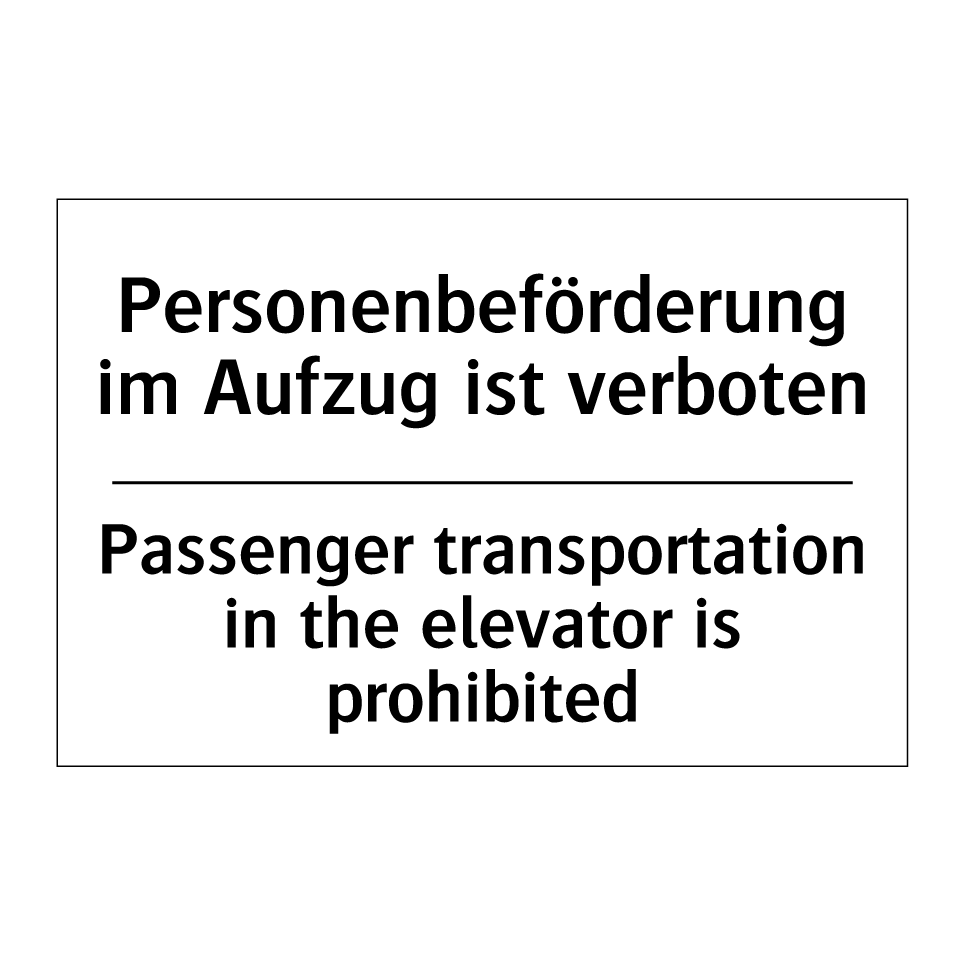 Zweisprachiges Verbotsschild mit deutschem Text Personenbeförderung im Aufzug ist verboten und englischem Text Passenger transportation in the elevator is prohibited