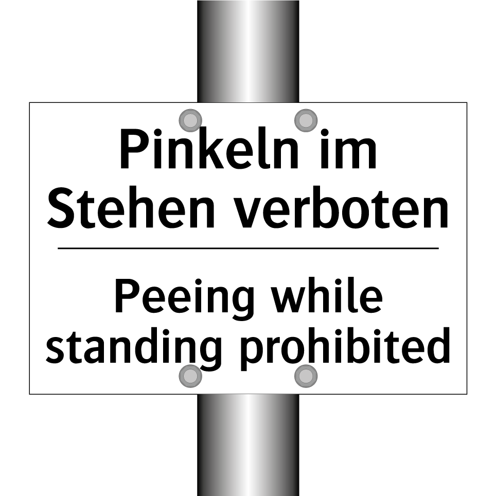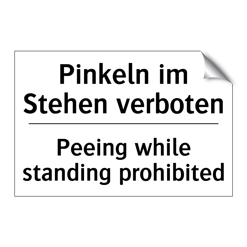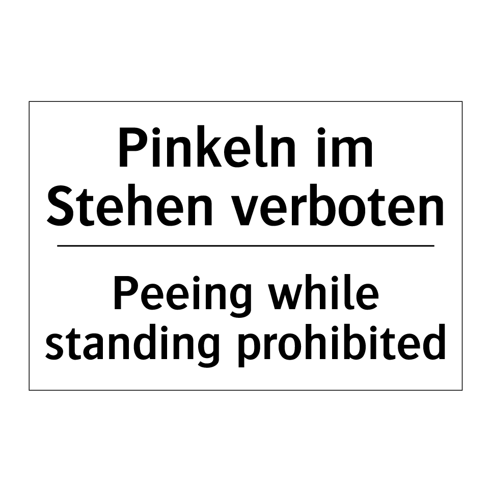 Zweisprachiges Verbotsschild mit deutschem Text Pinkeln im Stehen verboten und englischem Text Peeing while standing prohibited