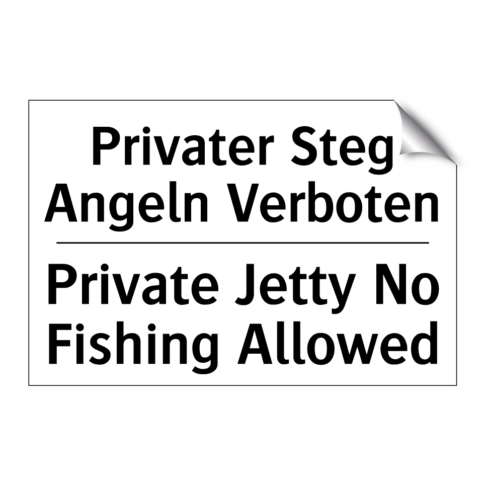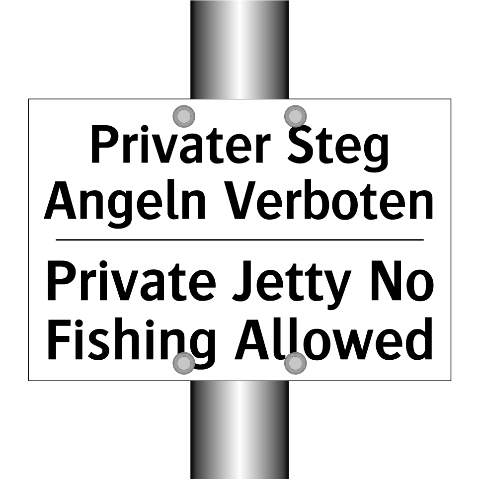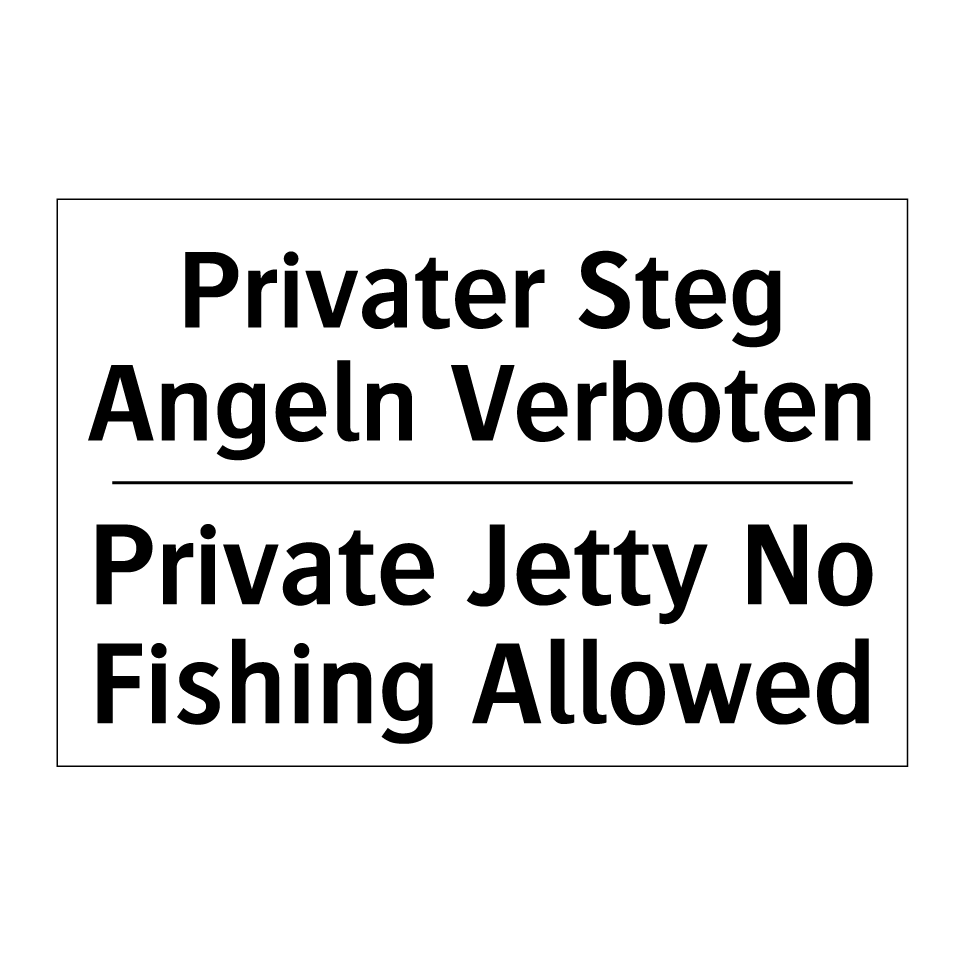 Zweisprachiges Verbotsschild mit deutschem Text Privater Steg Angeln Verboten und englischem Text Private Jetty No Fishing Allowed