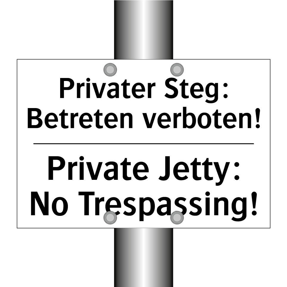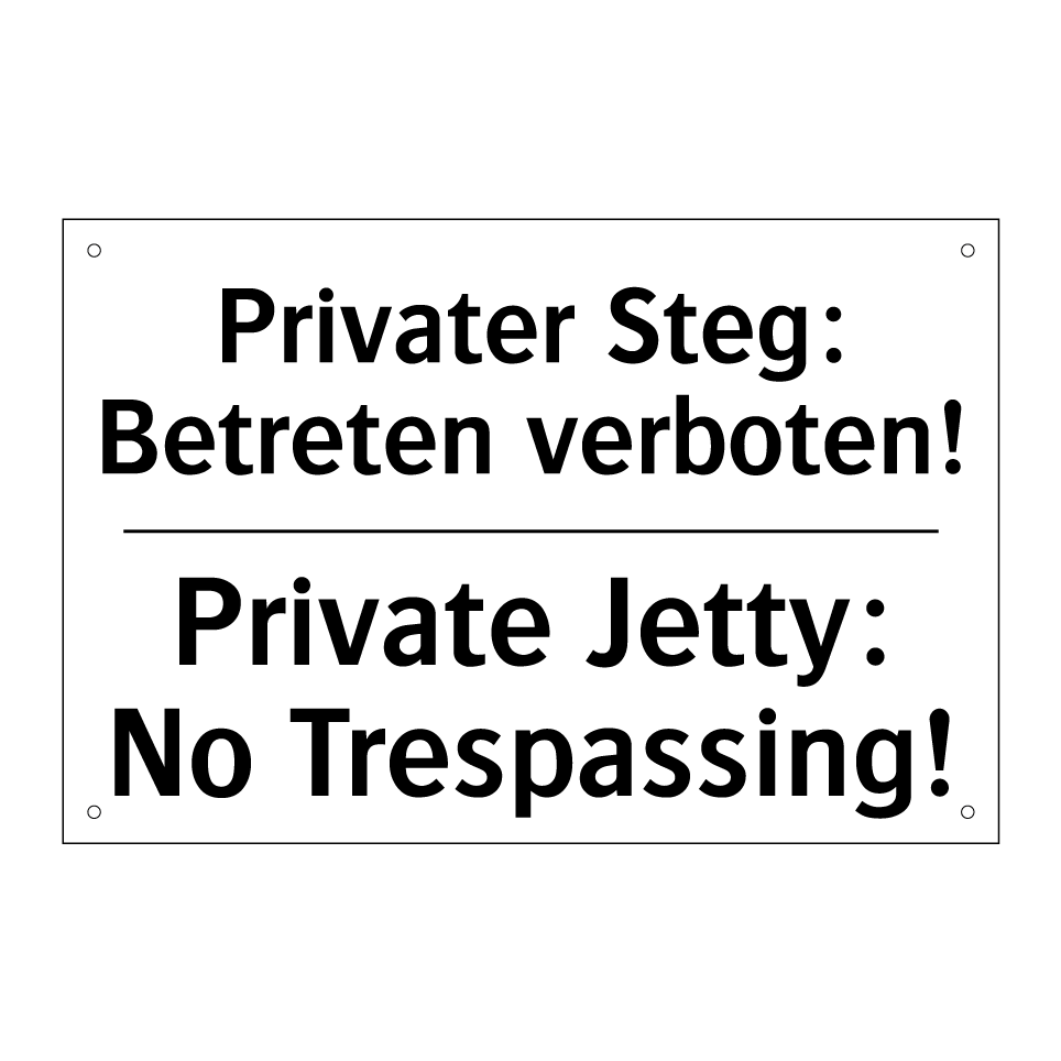 Zweisprachiges Verbotsschild mit deutschem Text Privater Steg: Betreten verboten! und englischem Text Private Jetty: No Trespassing!