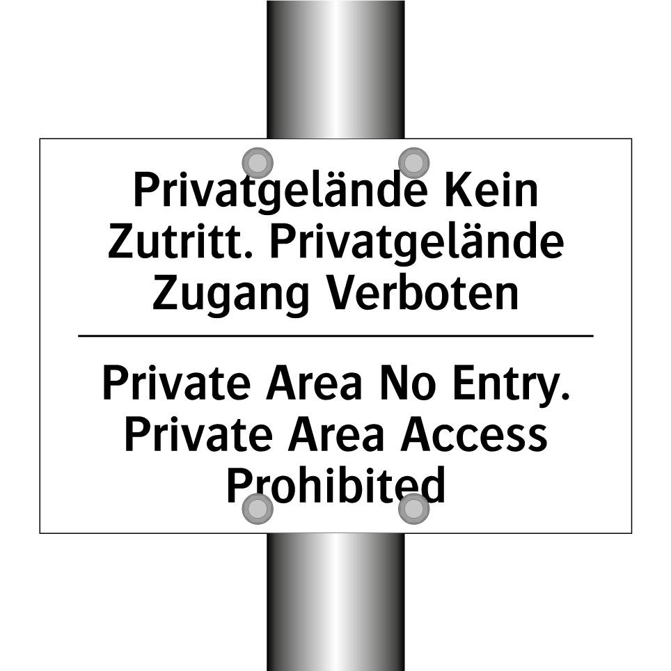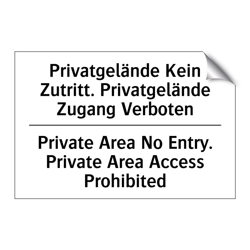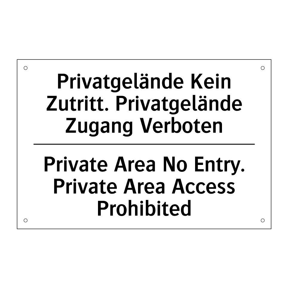 Zweisprachiges Verbotsschild mit deutschem Text Privatgelände Kein Zutritt. Privatgelände Zugang Verboten und englischem Text Private Area No Entry. Private Area Access Prohibited