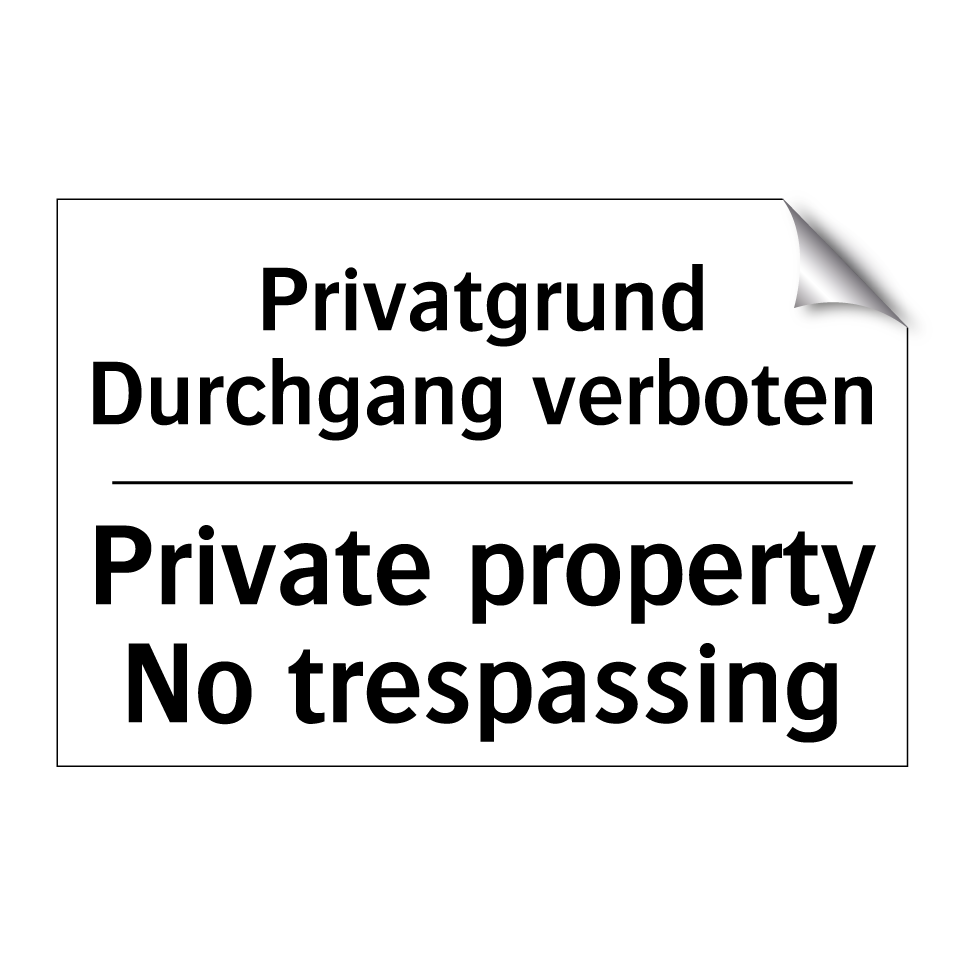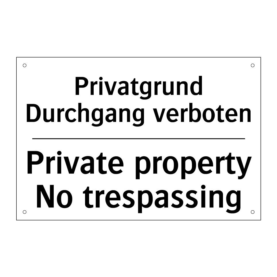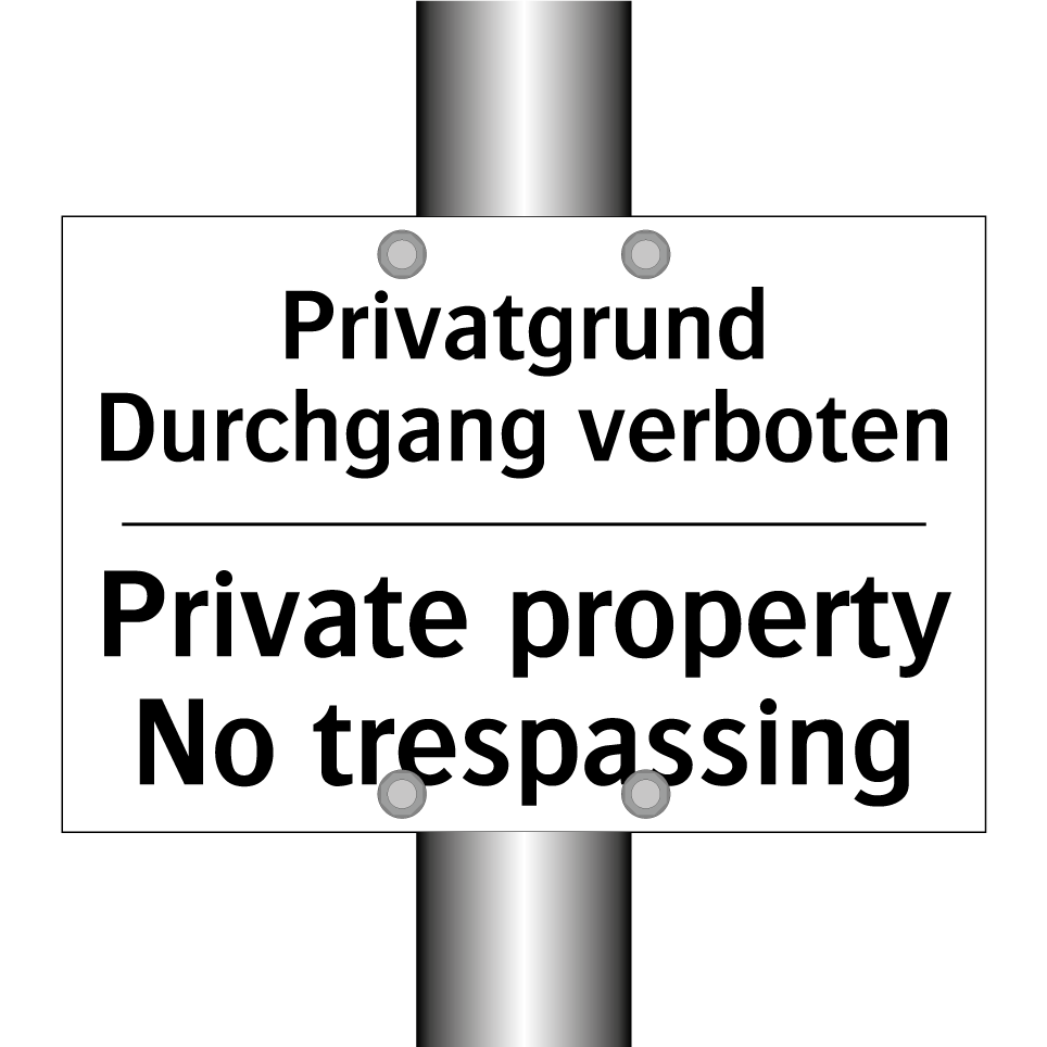 Zweisprachiges Verbotsschild mit deutschem Text Privatgrund Durchgang verboten und englischem Text Private property No trespassing
