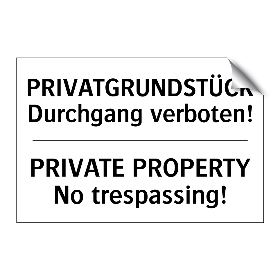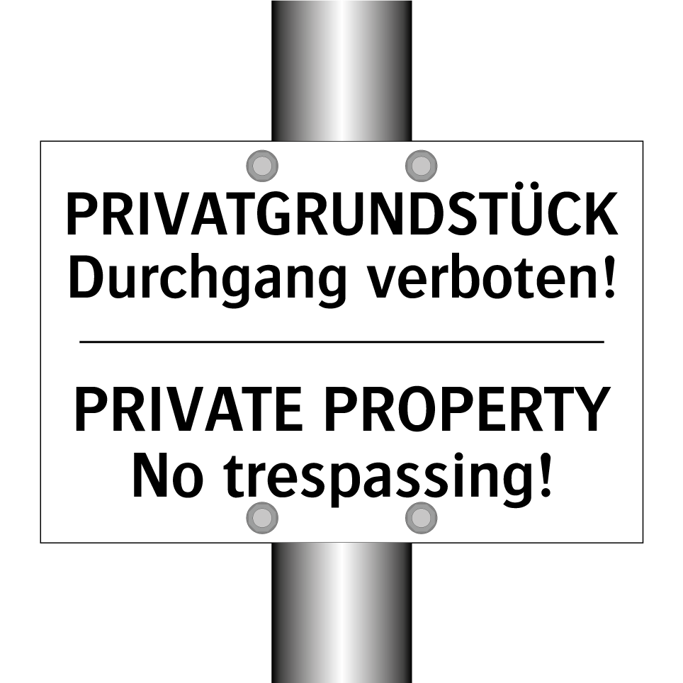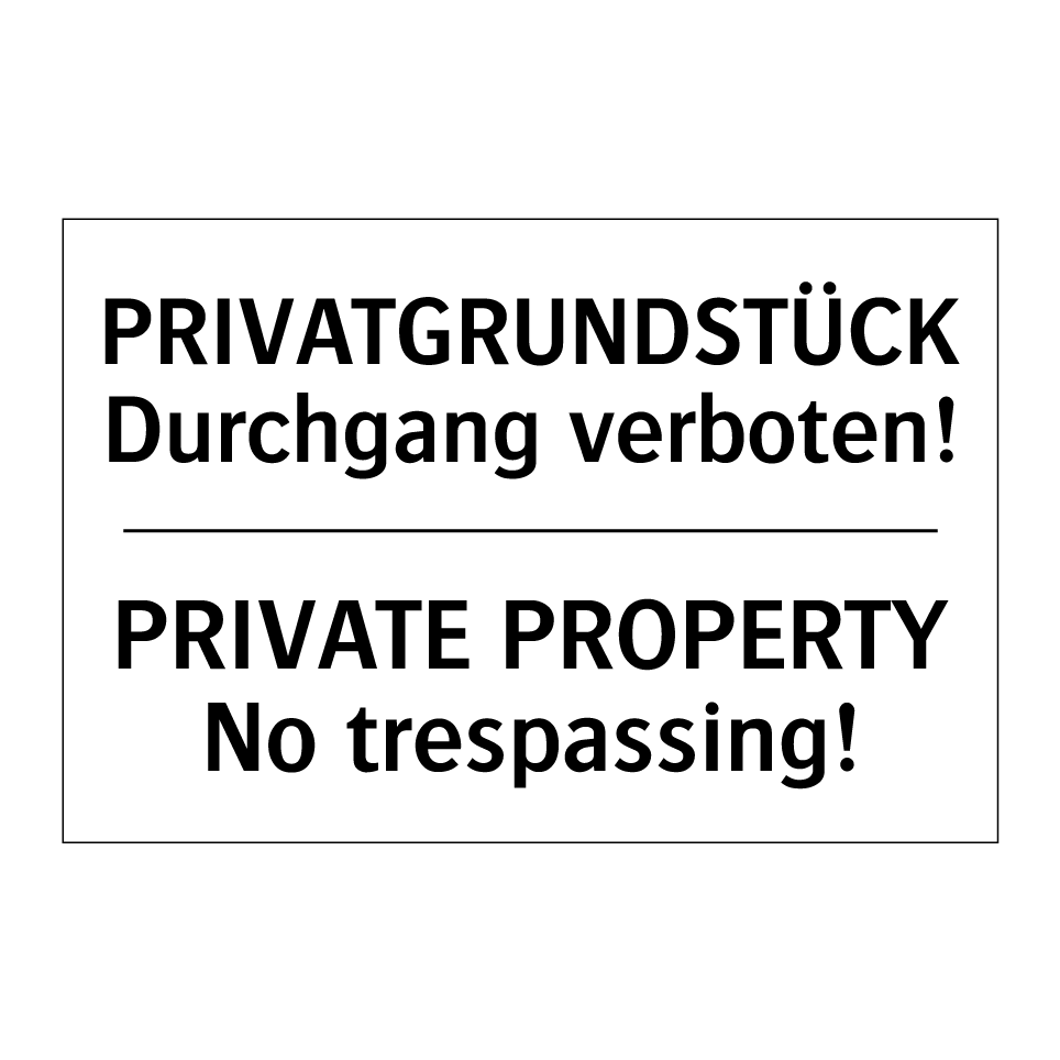 Zweisprachiges Verbotsschild mit deutschem Text PRIVATGRUNDSTÜCK Durchgang verboten! und englischem Text PRIVATE PROPERTY No trespassing!