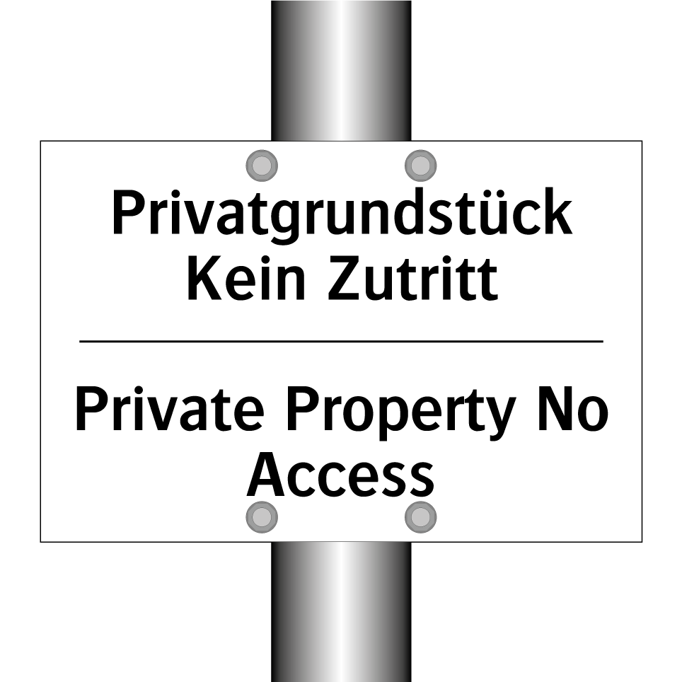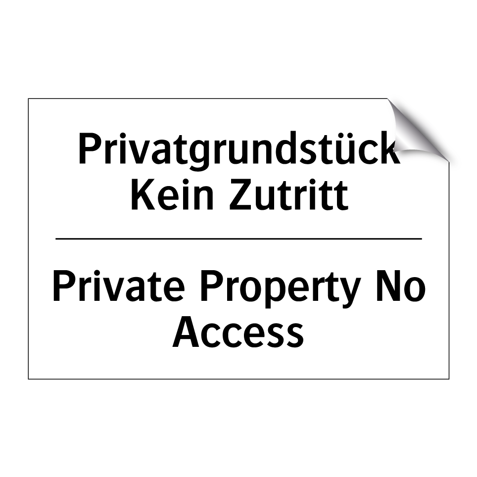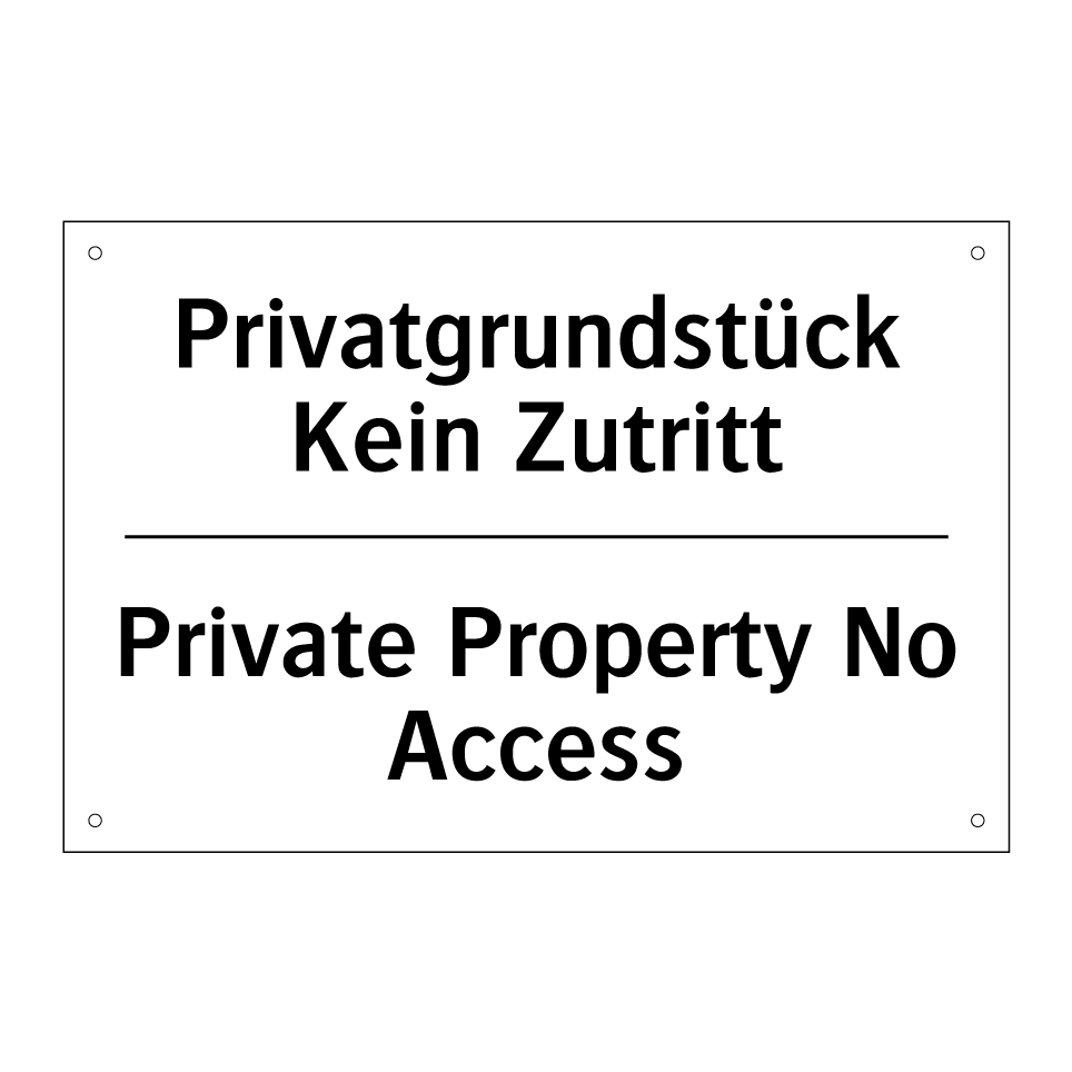 Zweisprachiges Verbotsschild mit deutschem Text Privatgrundstück Kein Zutritt und englischem Text Private Property No Access
