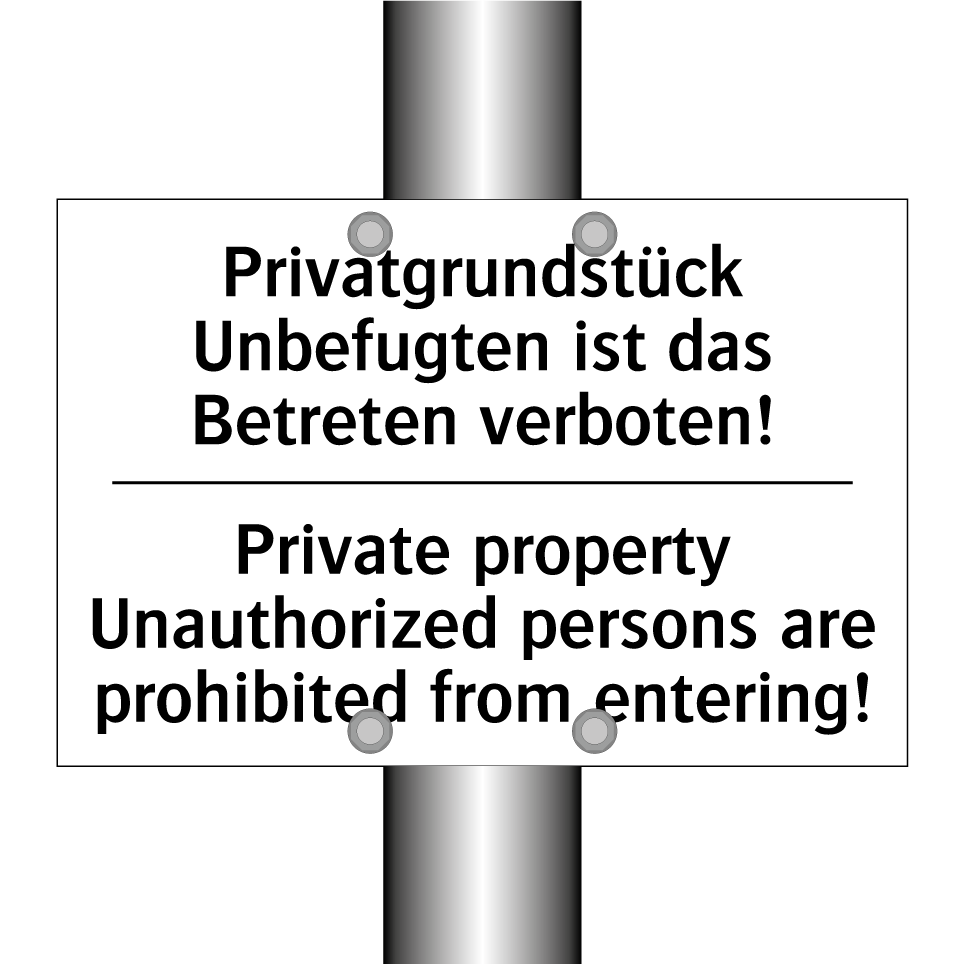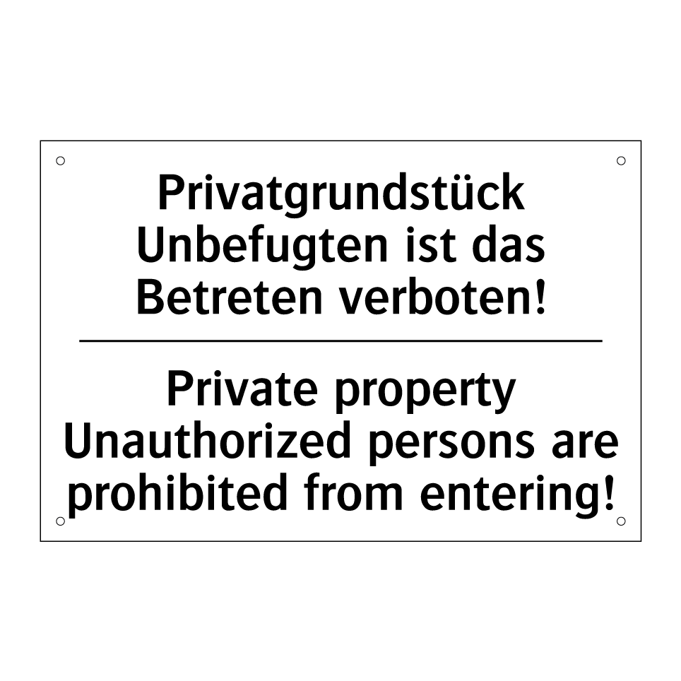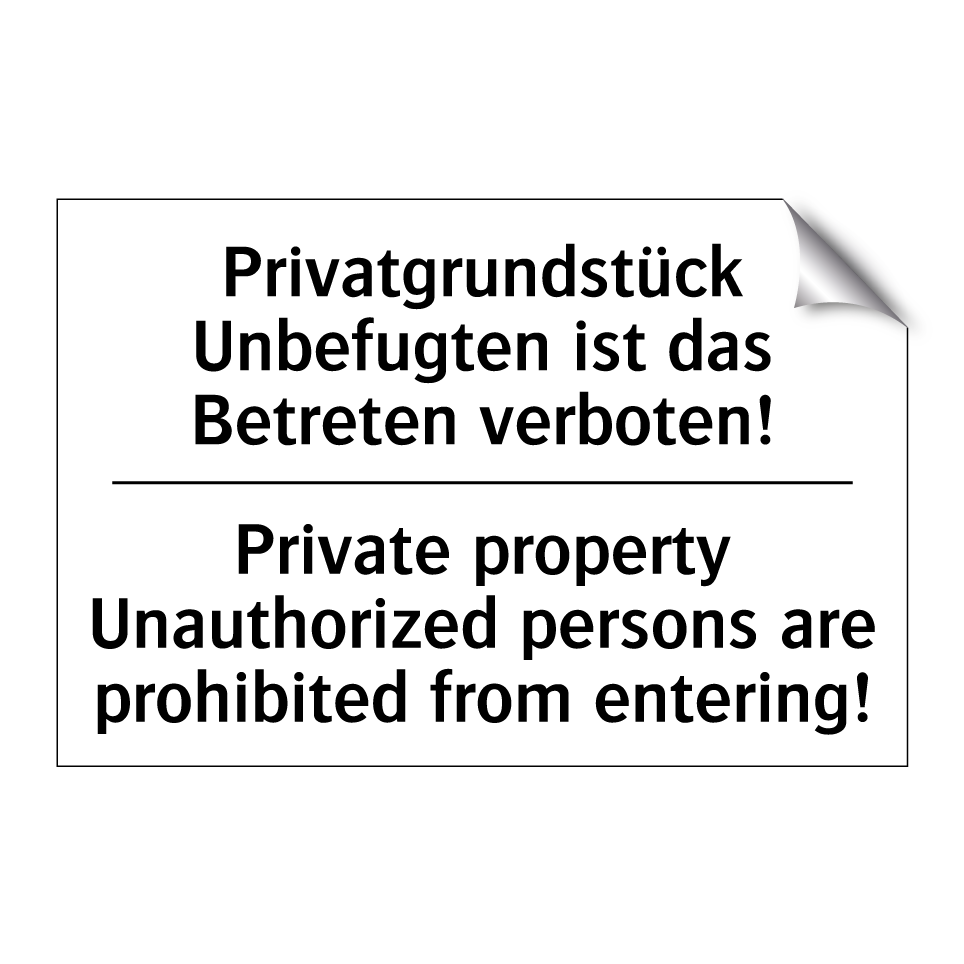 Zweisprachiges Verbotsschild mit deutschem Text Privatgrundstück Unbefugten ist das Betreten verboten! und englischem Text Private property Unauthorized persons are prohibited from entering!