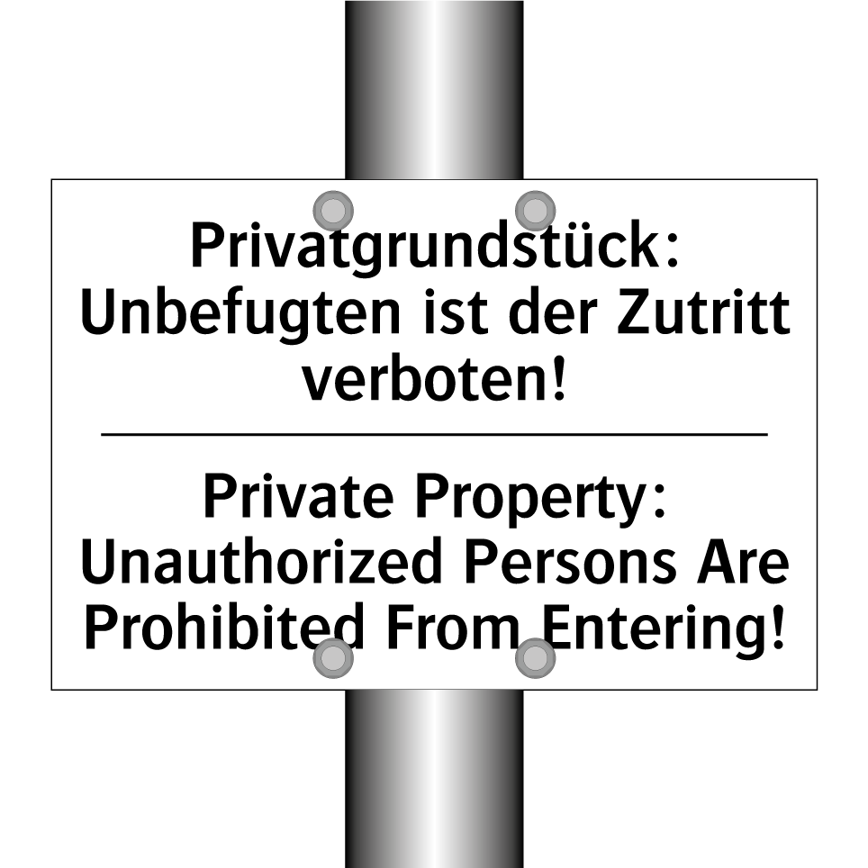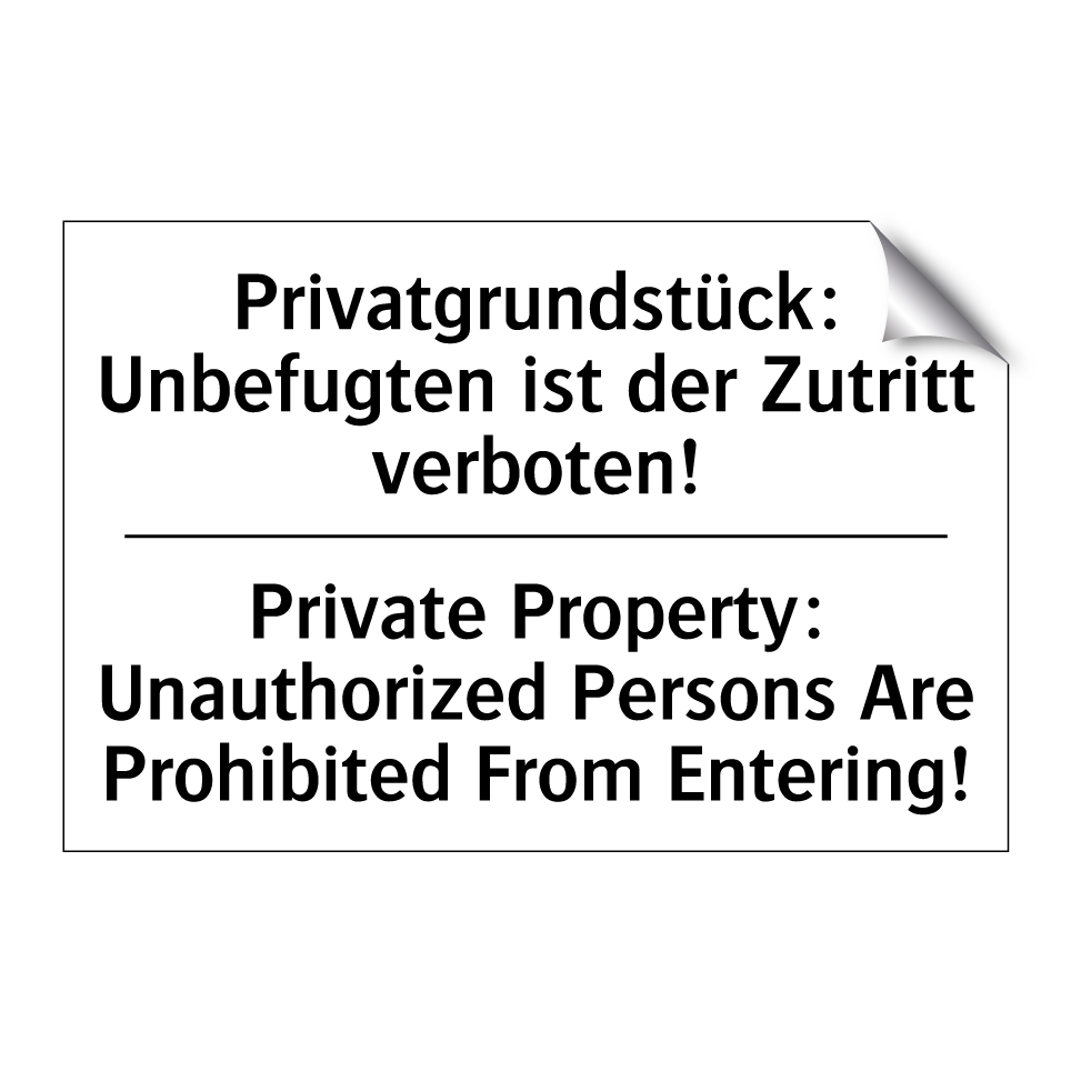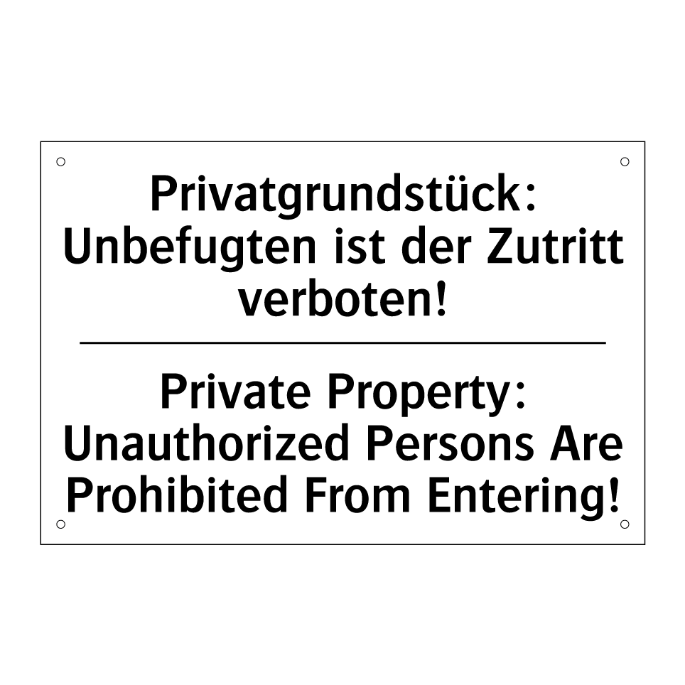 Zweisprachiges Verbotsschild mit deutschem Text Privatgrundstück: Unbefugten ist der Zutritt verboten! und englischem Text Private Property: Unauthorized Persons Are Prohibited From Entering!