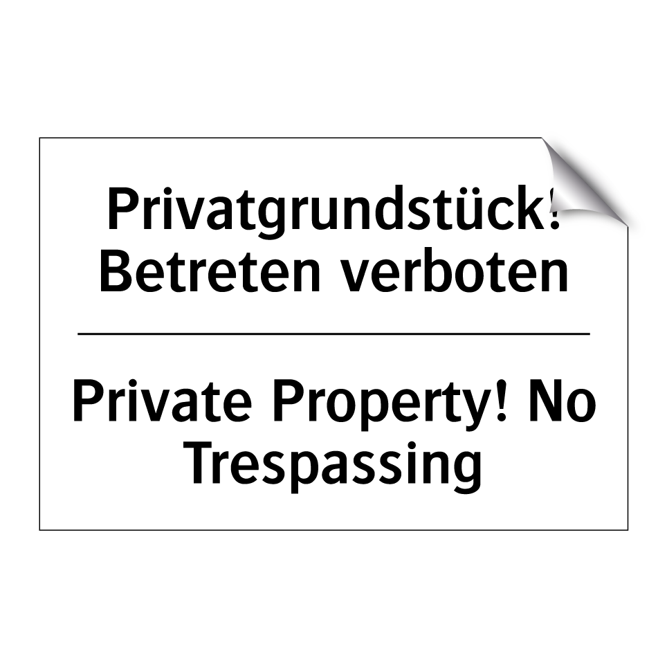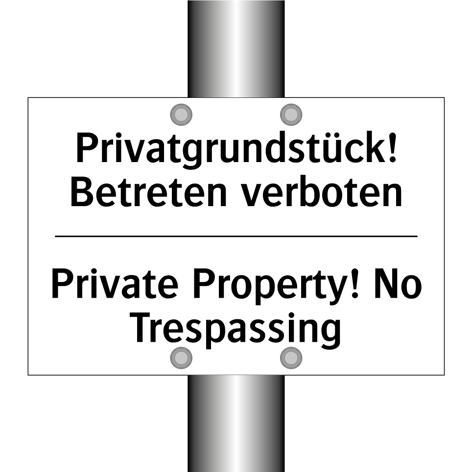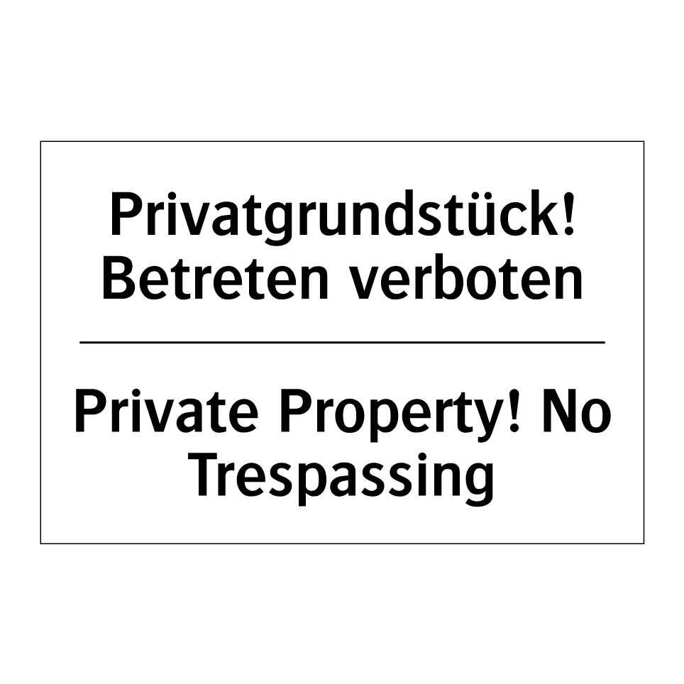 Zweisprachiges Verbotsschild mit deutschem Text Privatgrundstück! Betreten verboten und englischem Text Private Property! No Trespassing